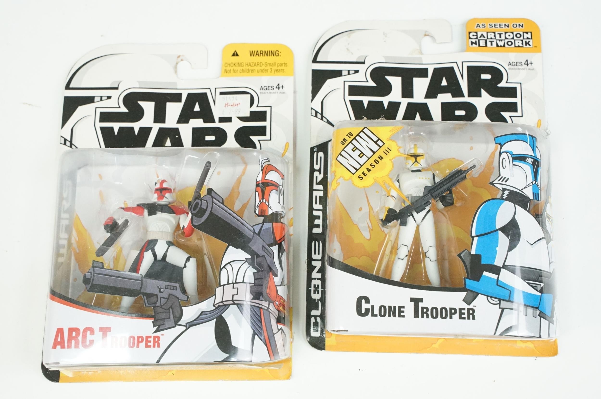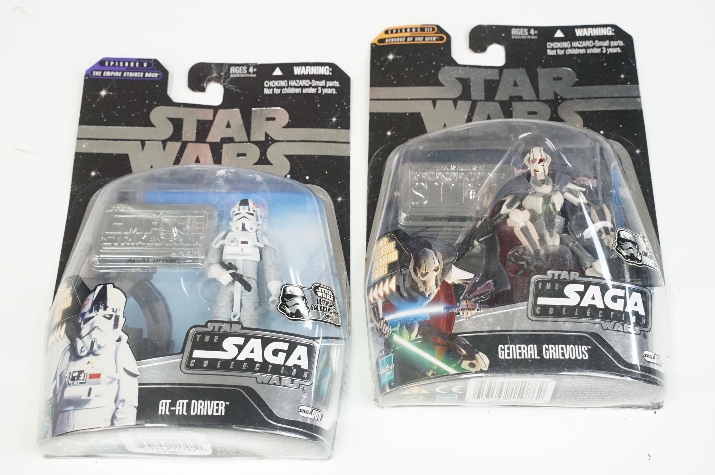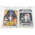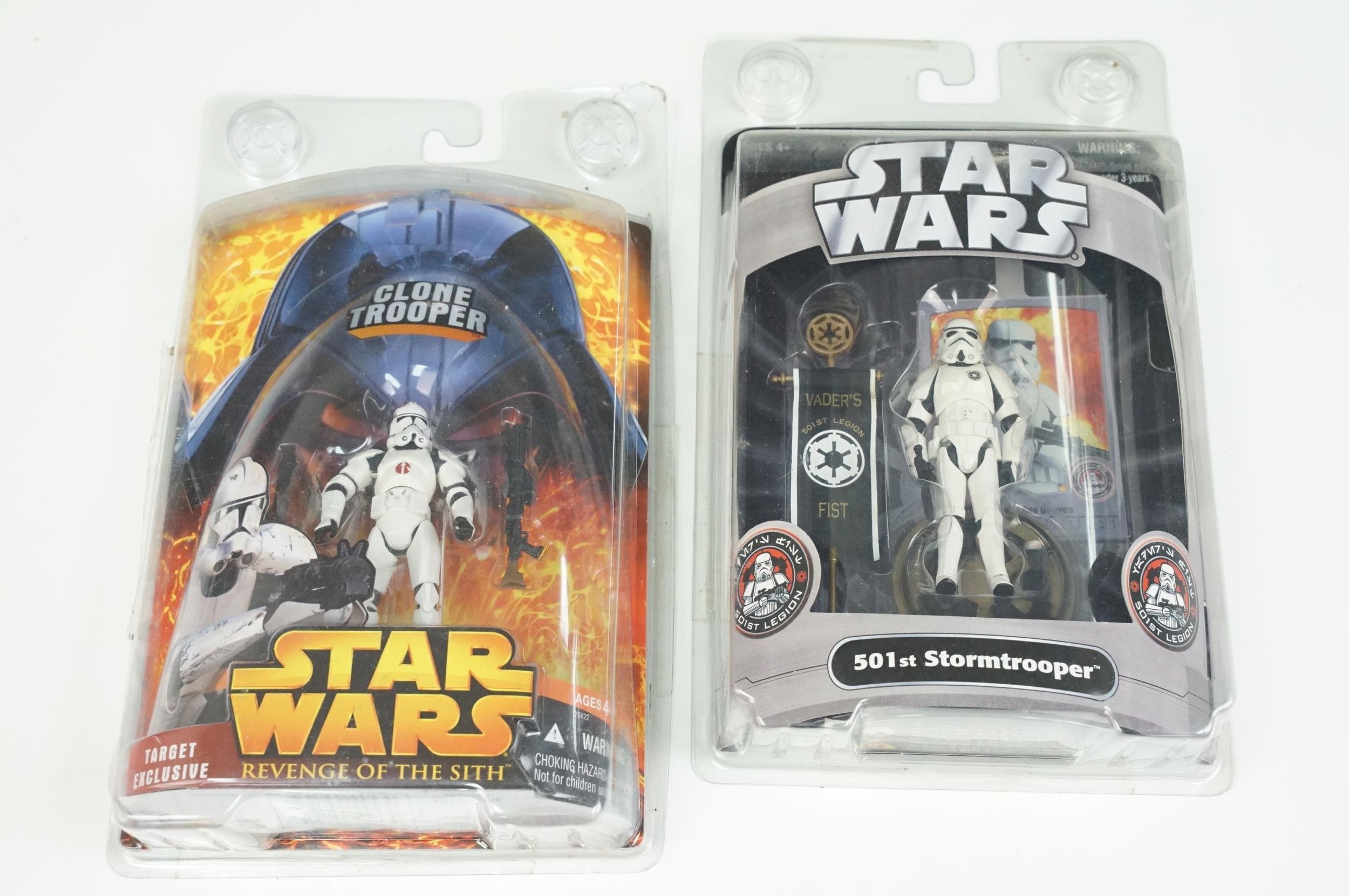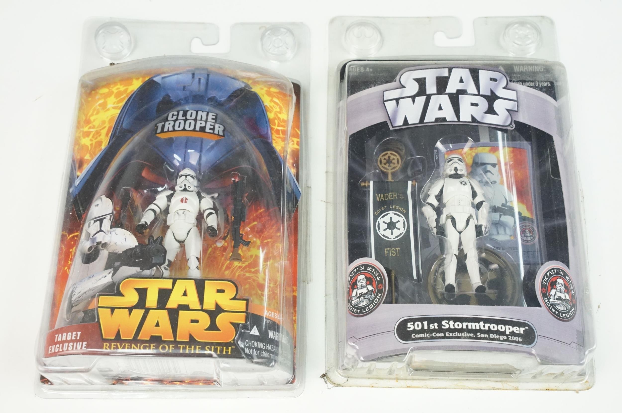 Star Wars - 20 Carded Star Wars figures featuring The Saga Collection Power Droid, Silver Saga 2004 Sandtrooper, Comic-Con Exclusive San Diego 2006 501st Stormtrooper, Ultimate Galactic Hunt 2006 Clone Commander Cody, Ultimate Galactic Hunt 2006 Scorch Republic Commando, Target Exclusive Revenge Of The Sith Clone Trooper, Revenge Of The Sith Commander Bacara, etc, gd to vg overall