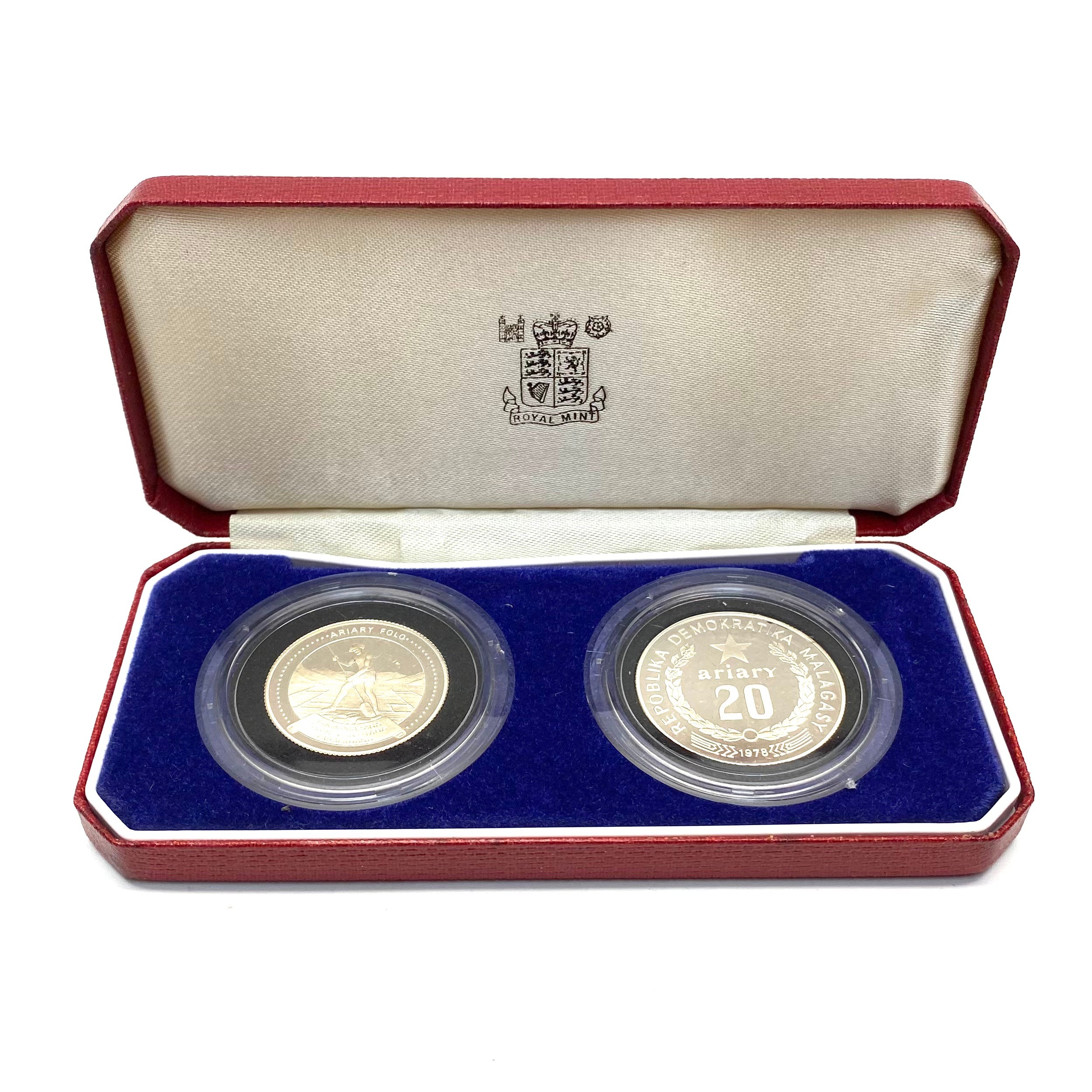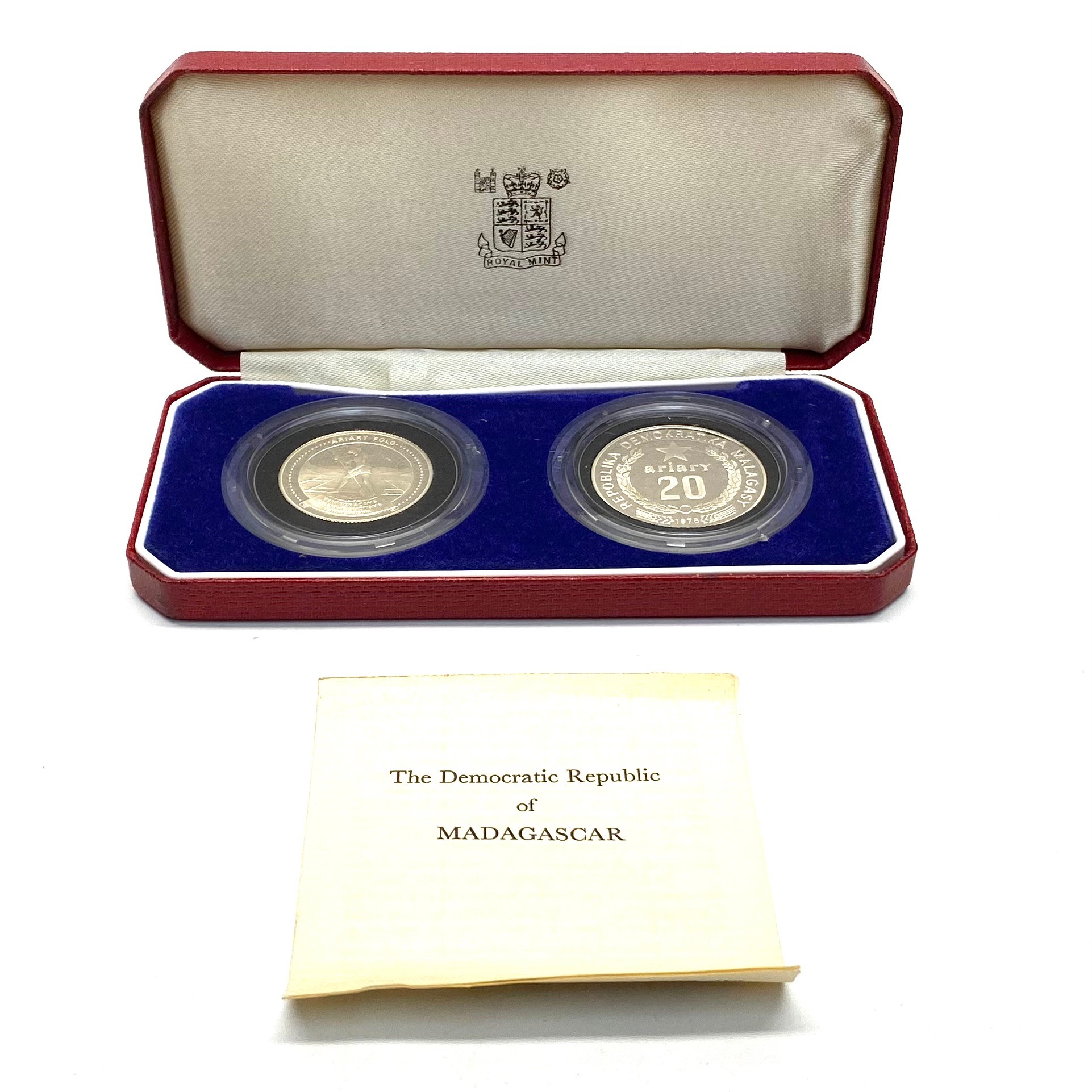 Royal Mint the democratic republic of Madagascar Sterling silver proof coins 10 and 20 Ariary. Designed by Mike Hibbit in their original case and COA.