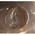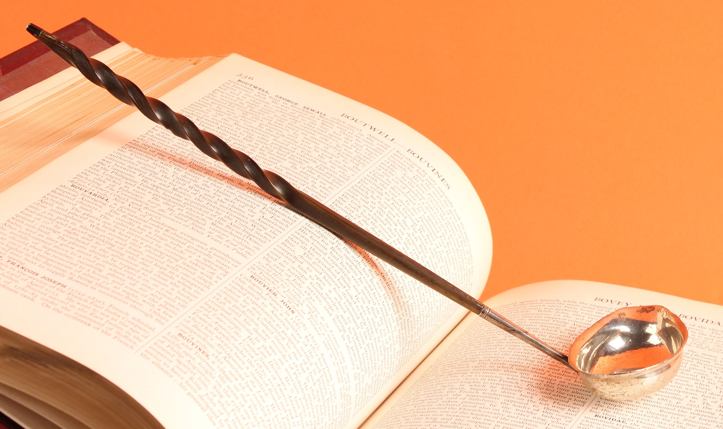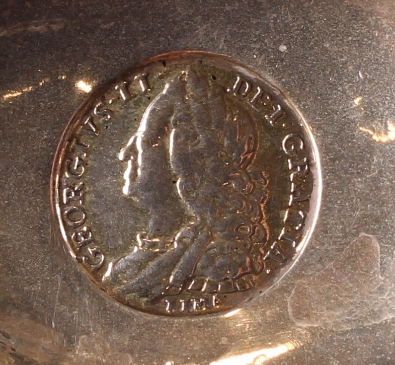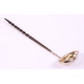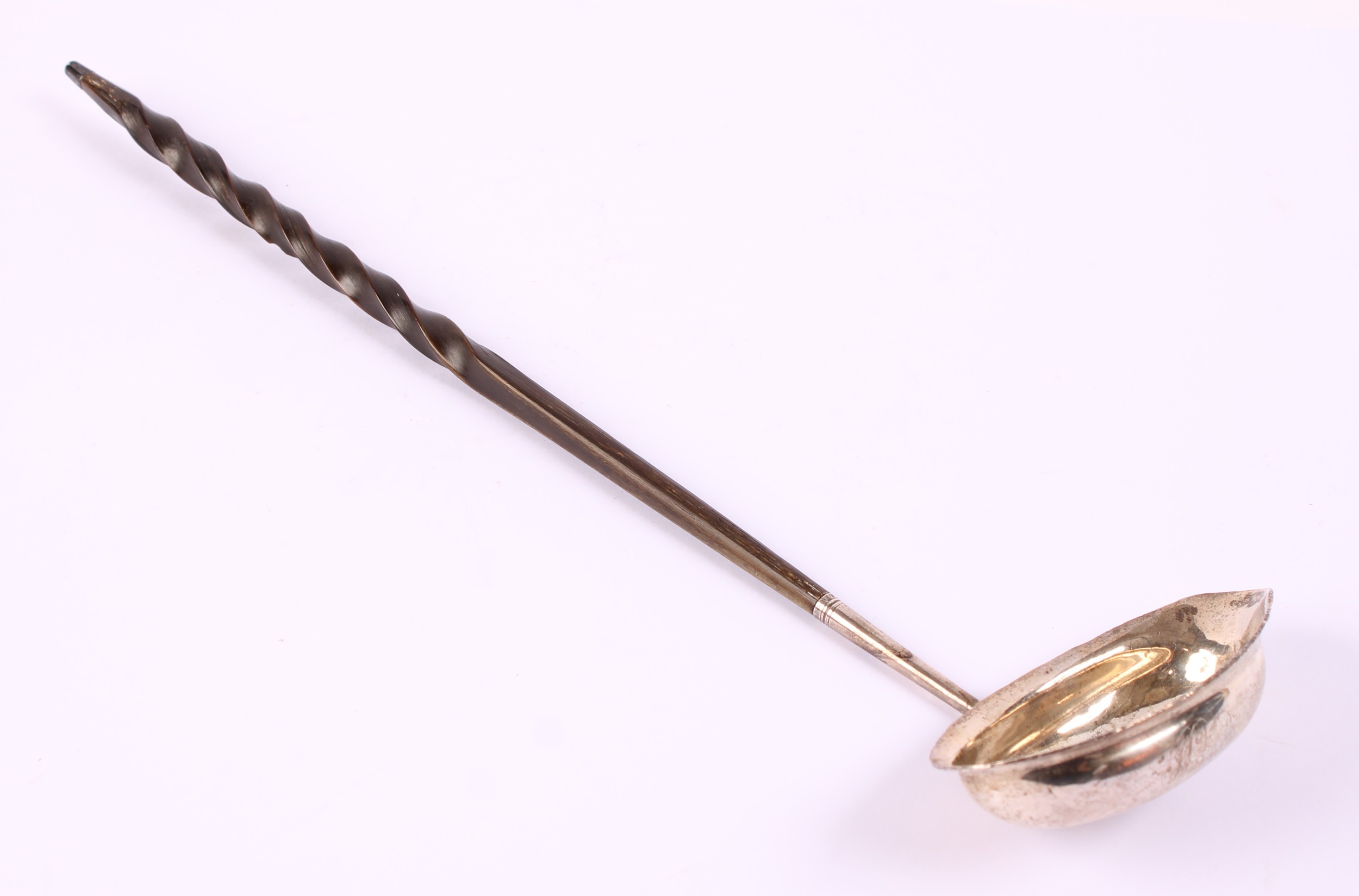 A George II silver coloured metal toddy ladle, twisted baleen handle, 32.5cm long, apparently unmarked, the bowl set with George II LIMA 1746 sixpence