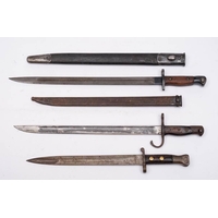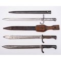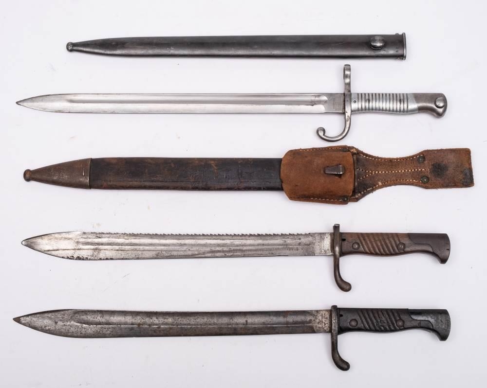 A World War One German pioneer bayonet model 98/05 : with 36cm fullered blade with saw back, ribbed slab grips, contained in a leather and steel scabbard, a German Mauser bayonet with 36.5cm fullered blade and an Argentinean bayonet. (3).
