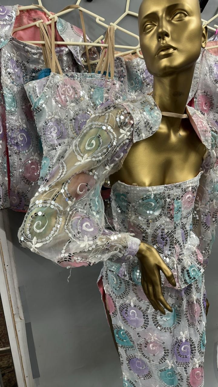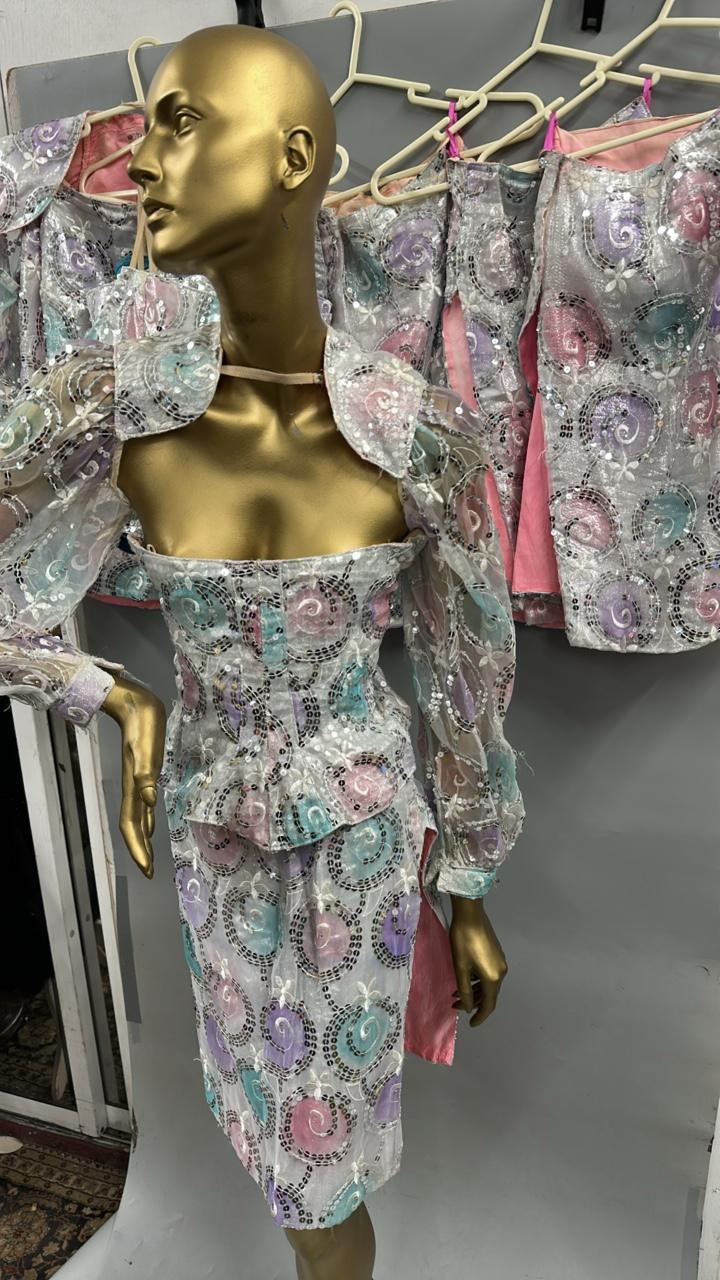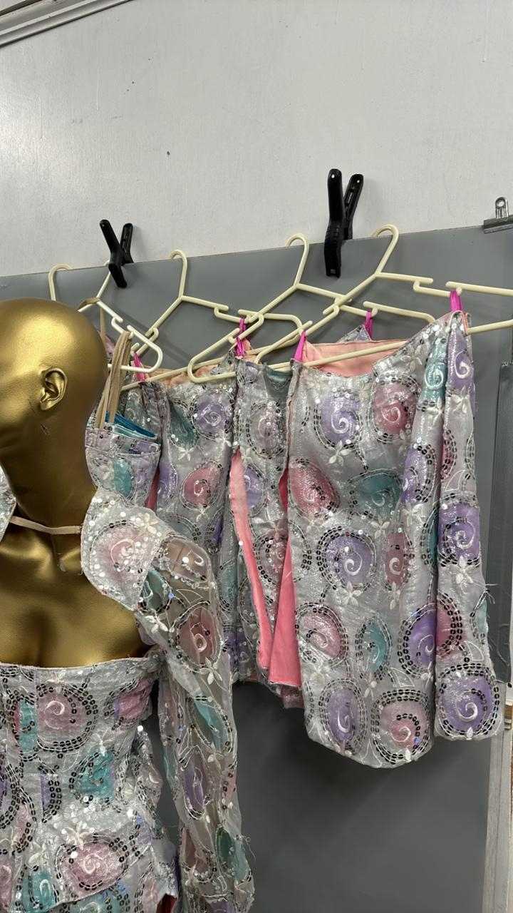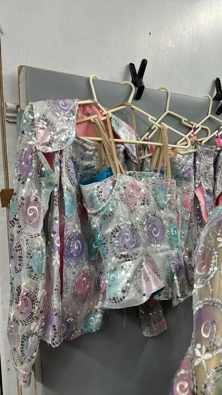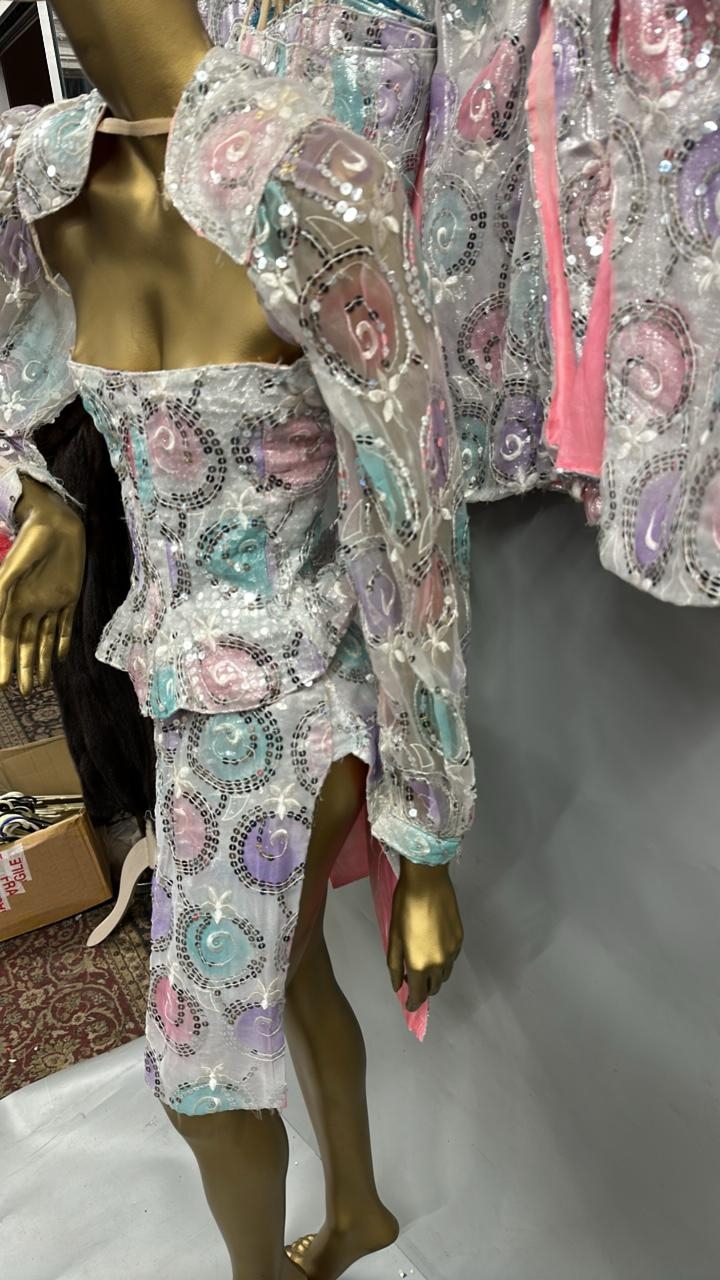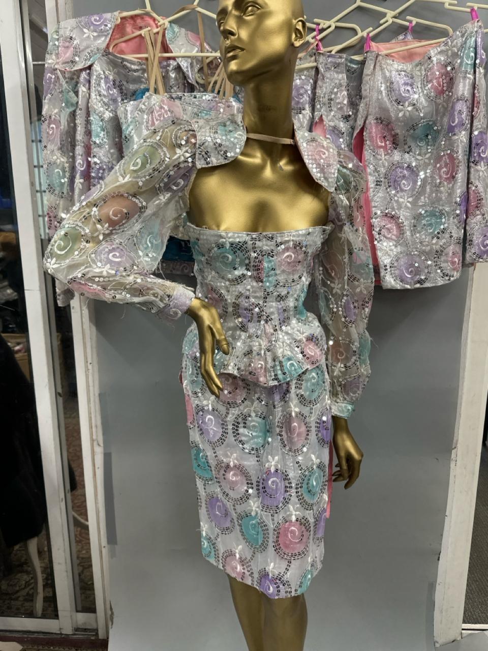 Two complete sequinned three piece costumes with skirts, coursettes and cropped shoulder jackets, this lot also includes four coursettes and three skirts. /Rail 1