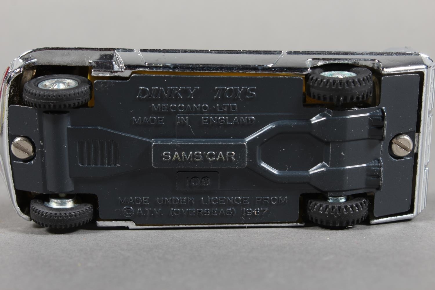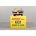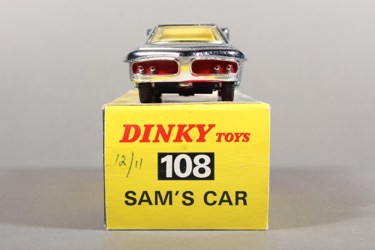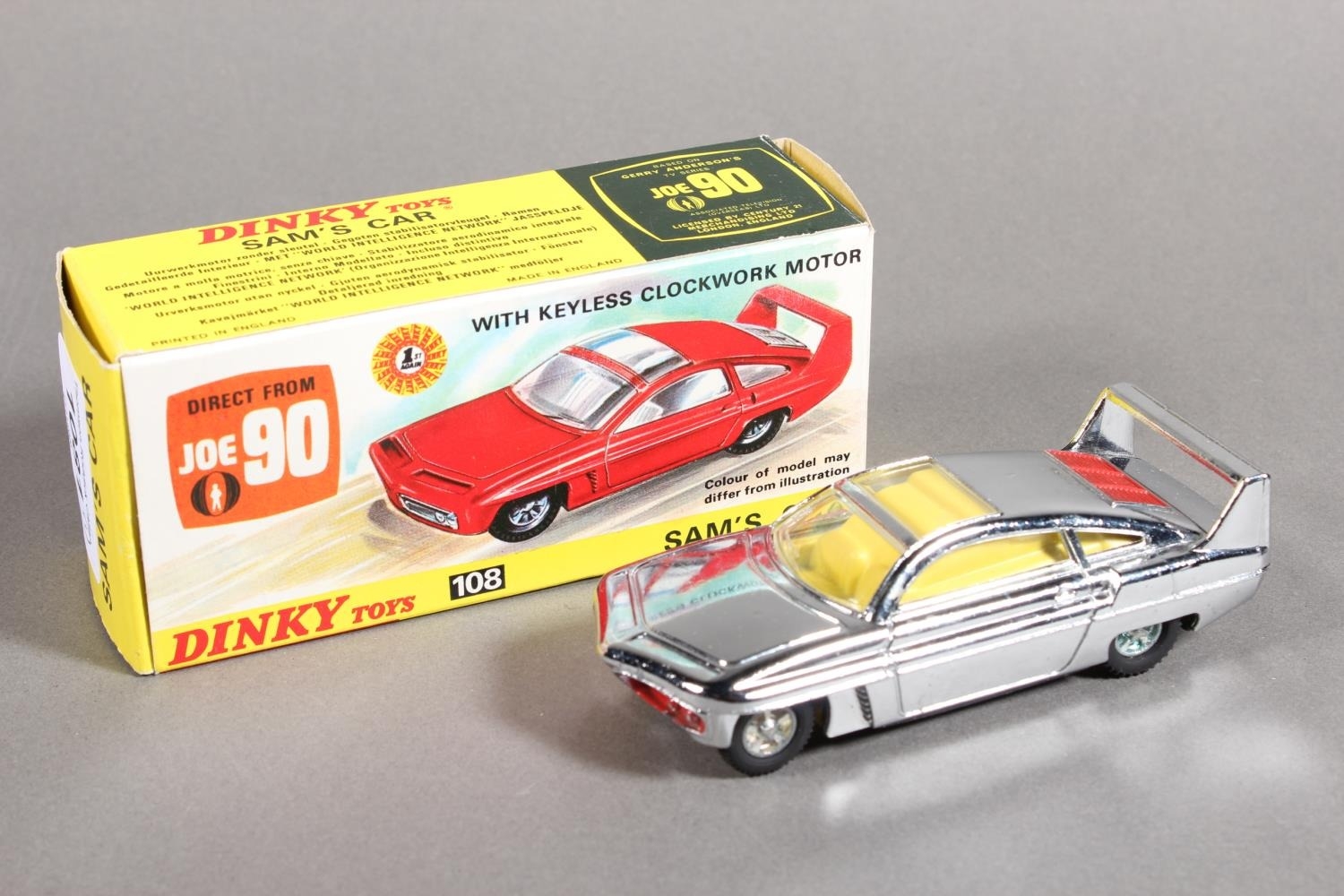 Dinky Toys diecast model vehicle 108 "Direct from Joe 90" Sam's Car, chrome plated body with lemon interior and 'keyless clockwork motor', raised on pictorial diorama stand, missing "WIN" badge, boxed. (1)
