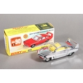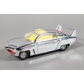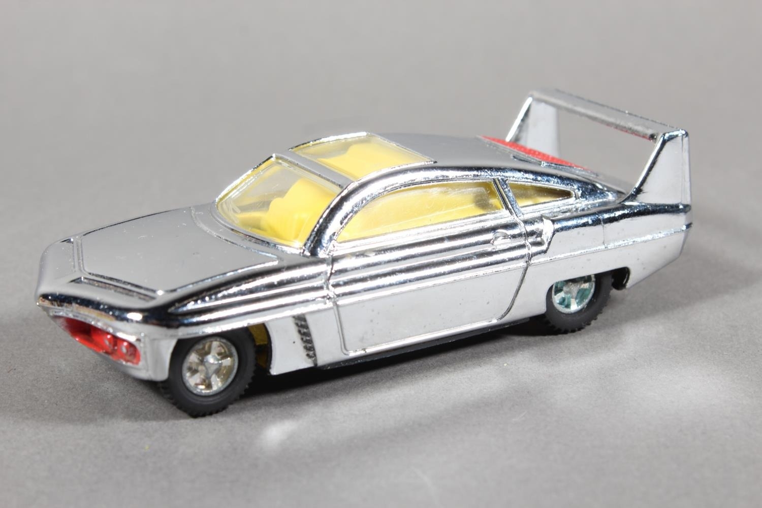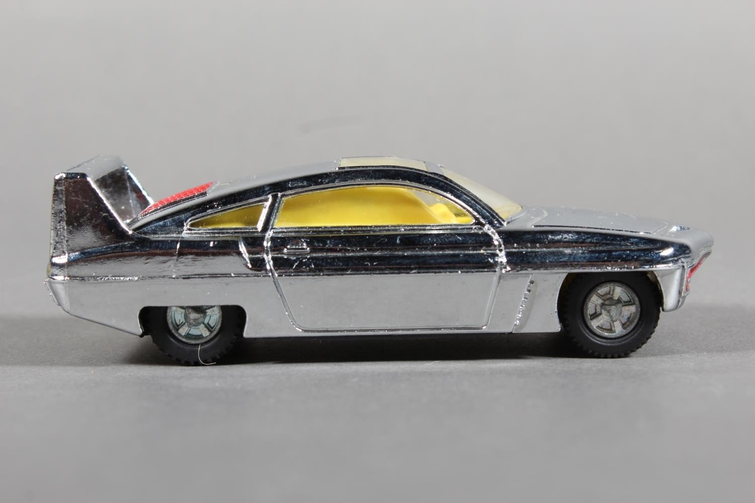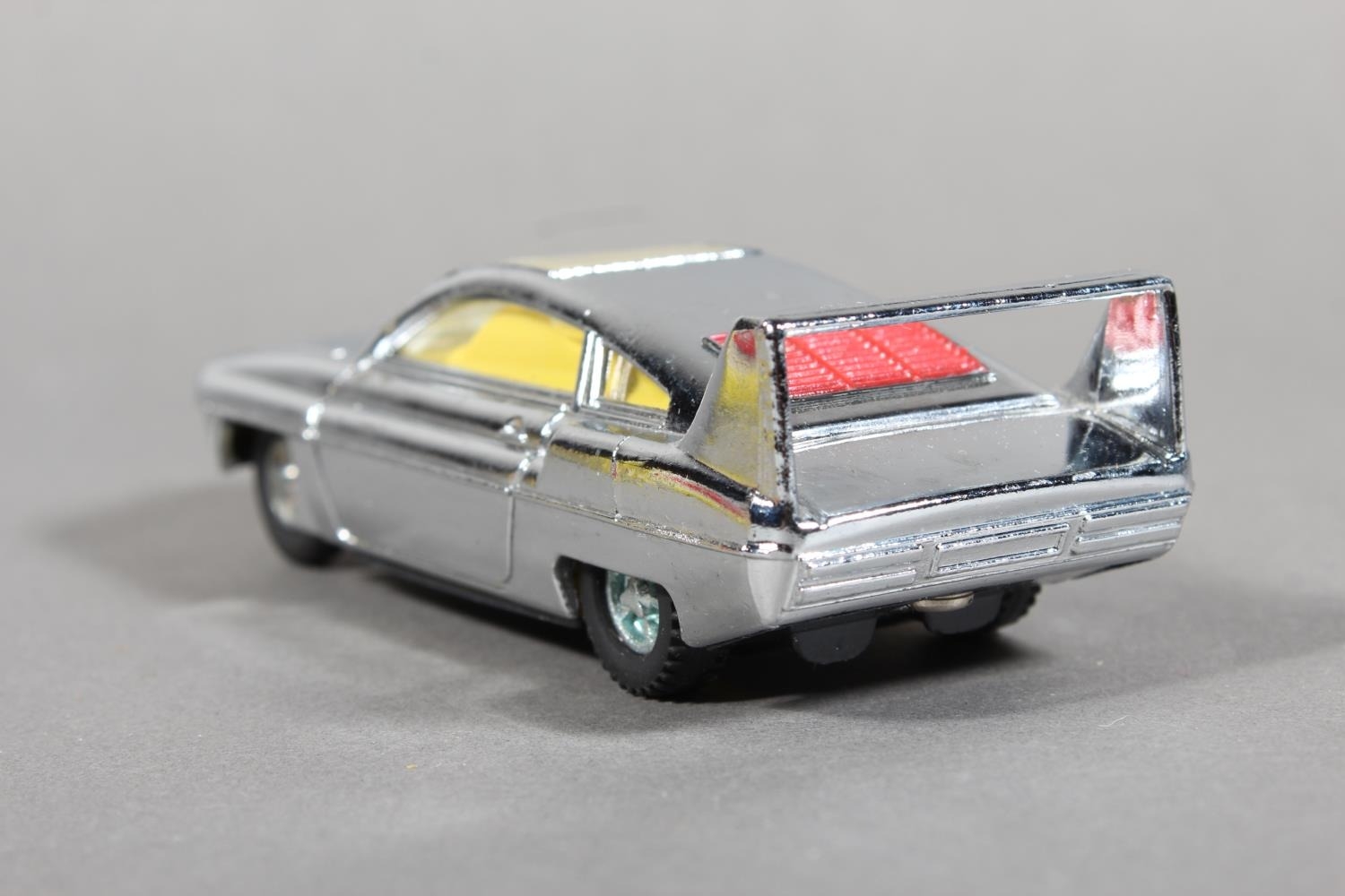 Dinky Toys diecast model vehicle 108 "Direct from Joe 90" Sam's Car, chrome plated body with lemon interior and 'keyless clockwork motor', raised on pictorial diorama stand, missing "WIN" badge, boxed. (1)