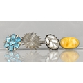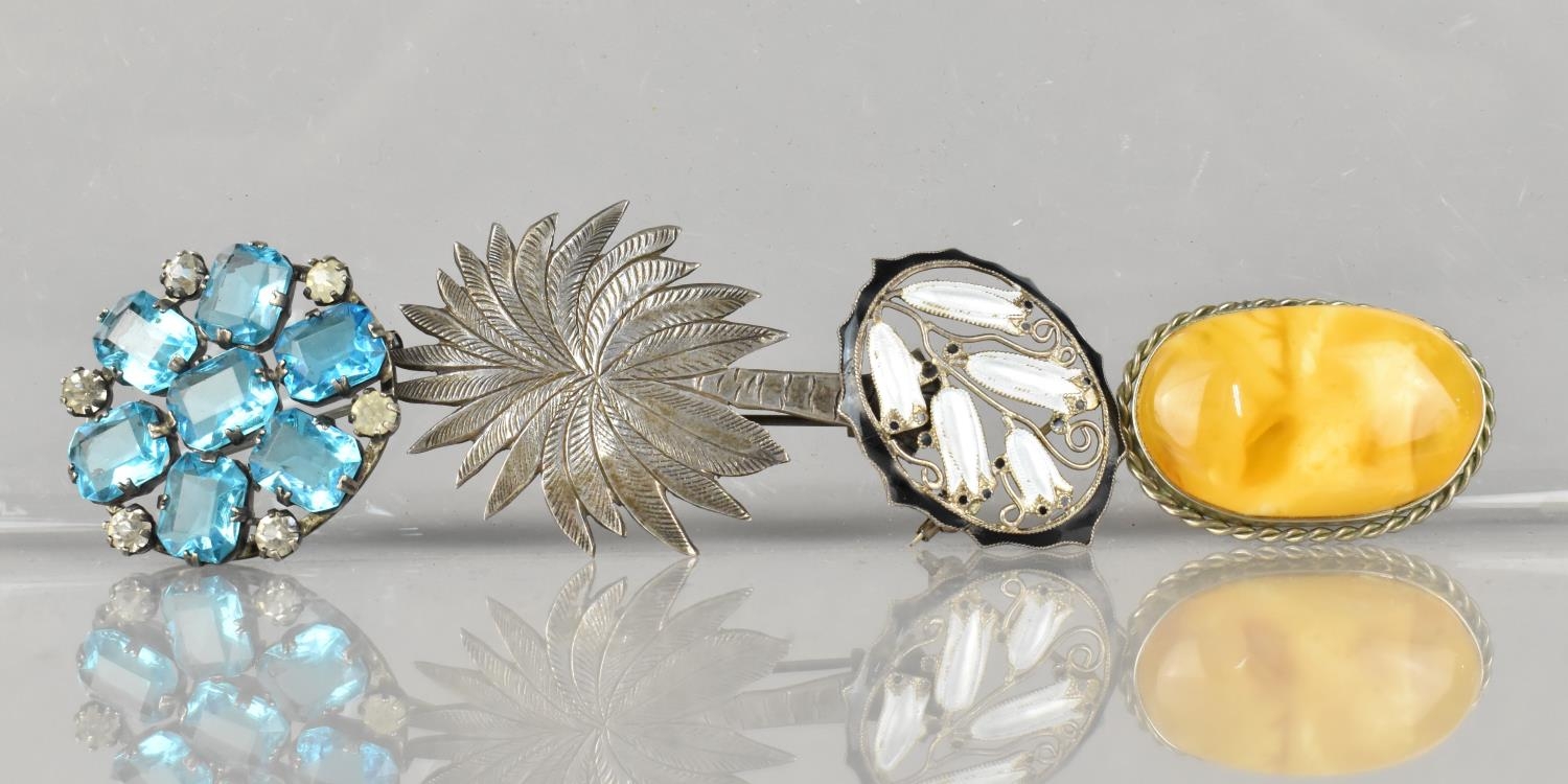 Four Vintage Silver and White Metal Mounted Brooches to include Large Amber Mounted Example (36.4mm Wide), Silver and Enamel Snowdrop Example, Blue and White Paste Stone Examples and an Arabic Example, Palm Tree