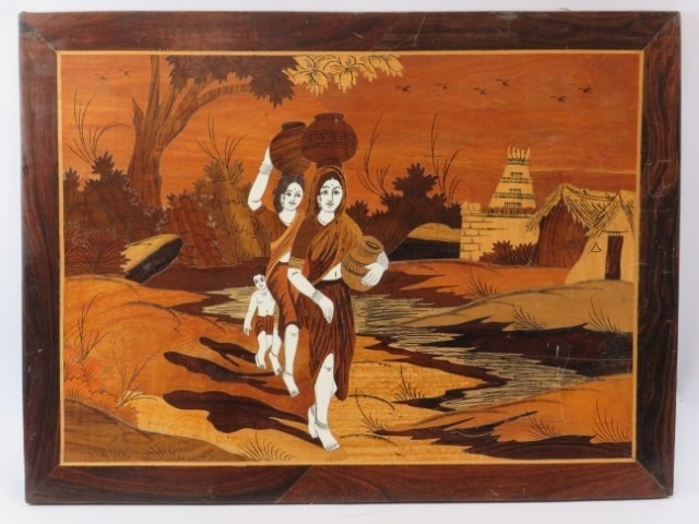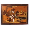 An Indian marquetry wood and resin inlaid figural scene. 45.5 cm x 60.7 cm.