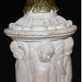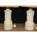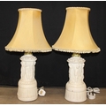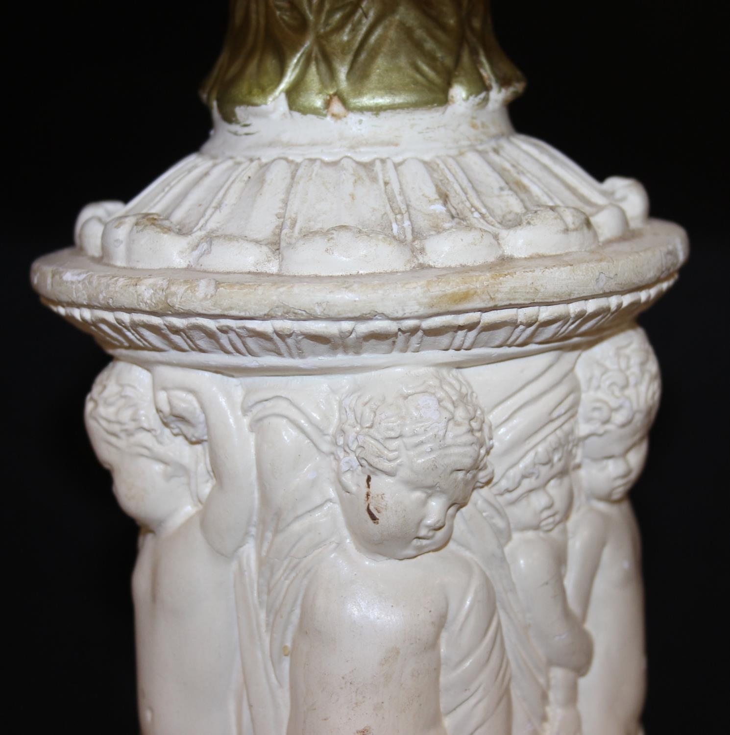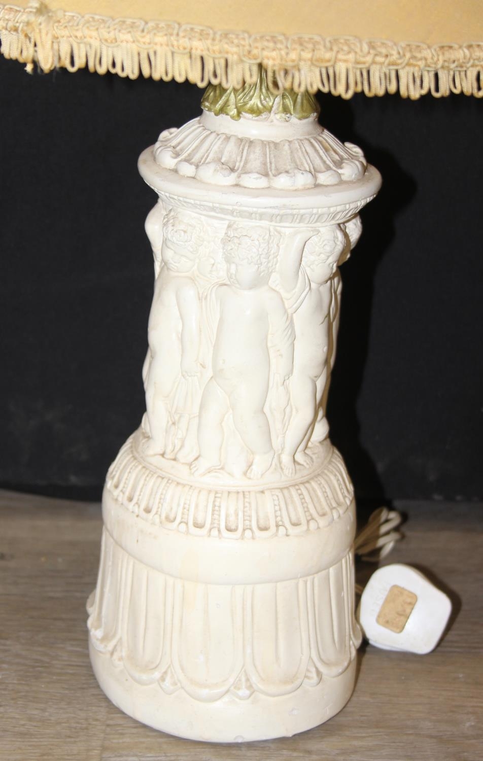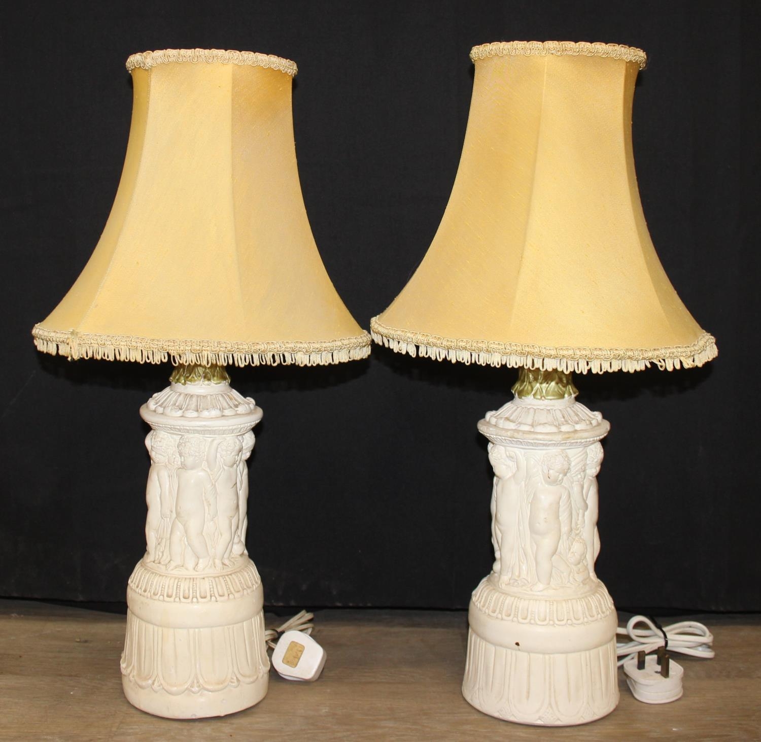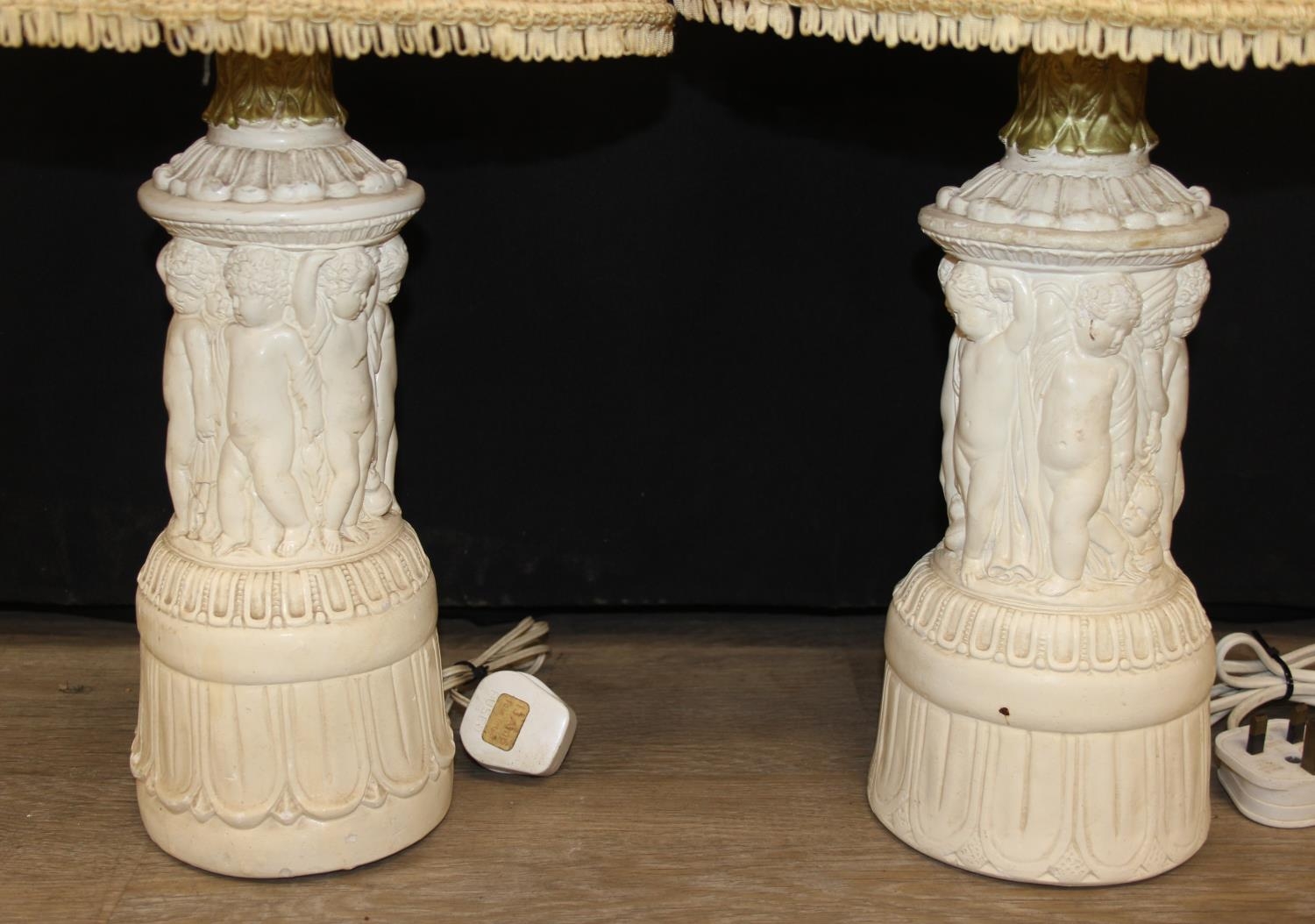 A pair of classical style plaster table lamps with shade, the bases formed as in the round with cherubs, each 62cm [2]