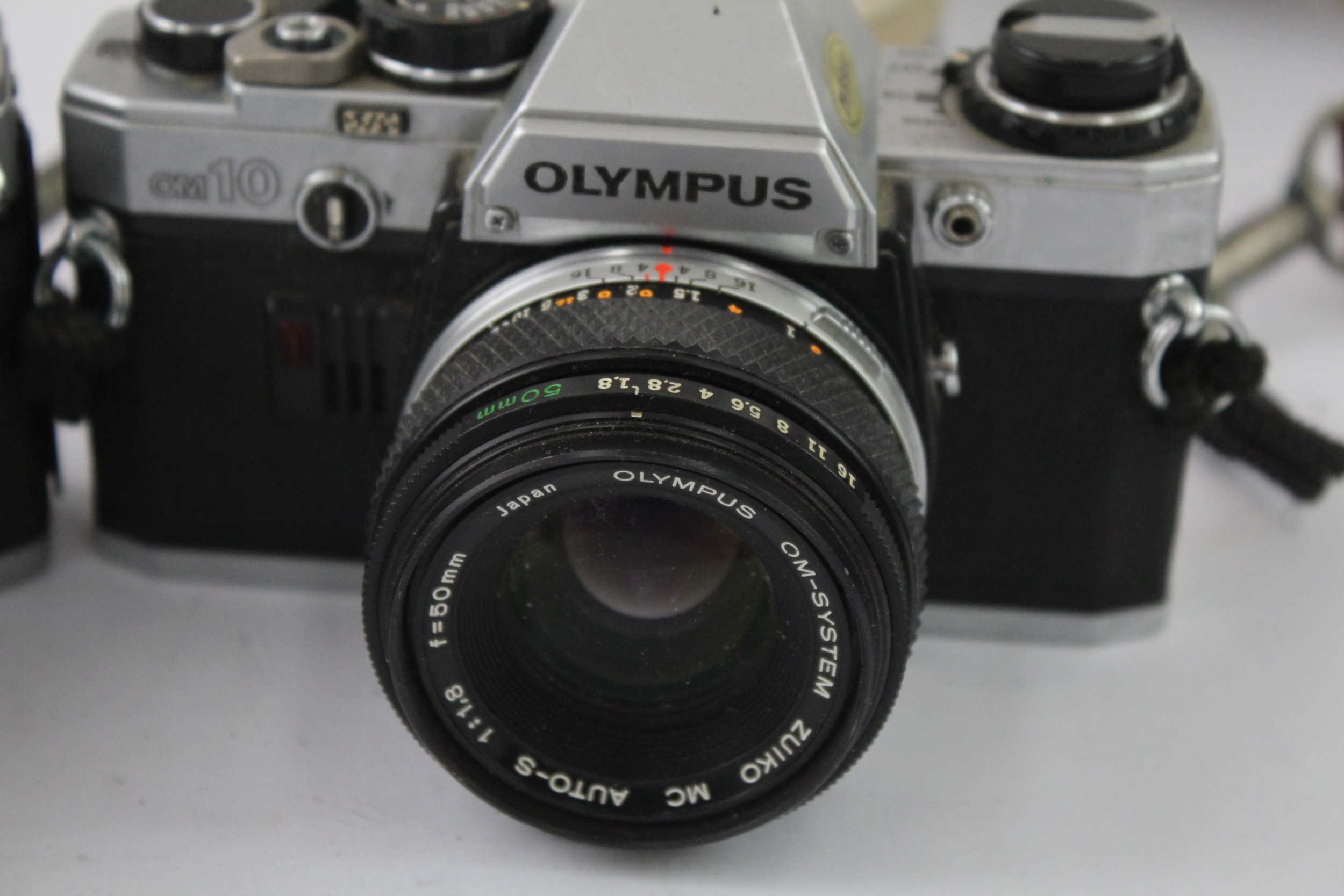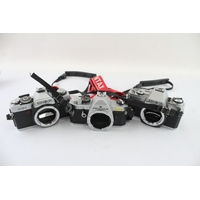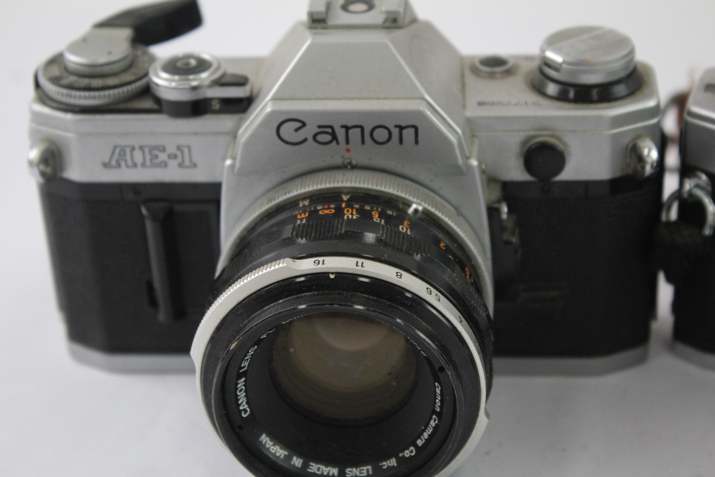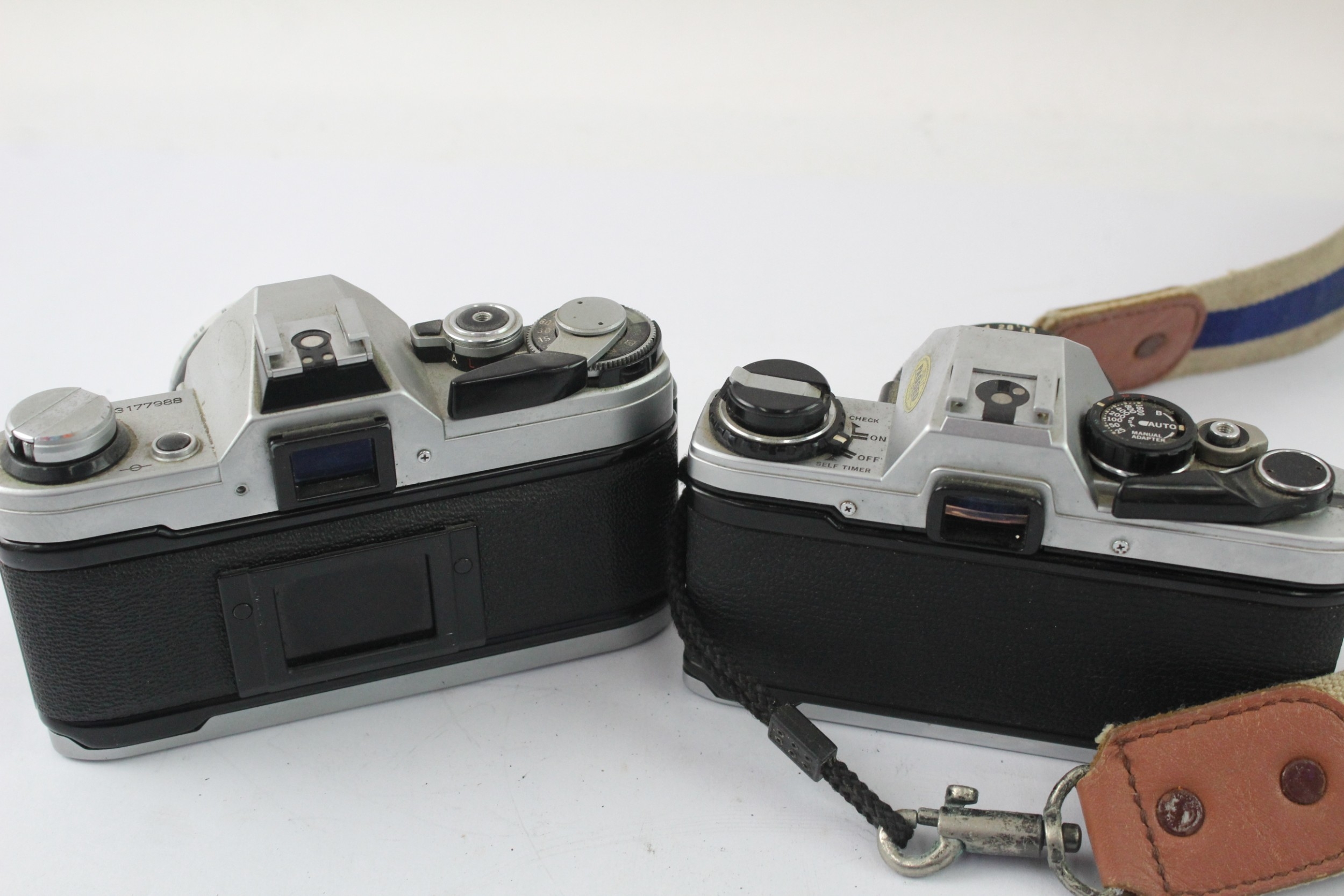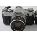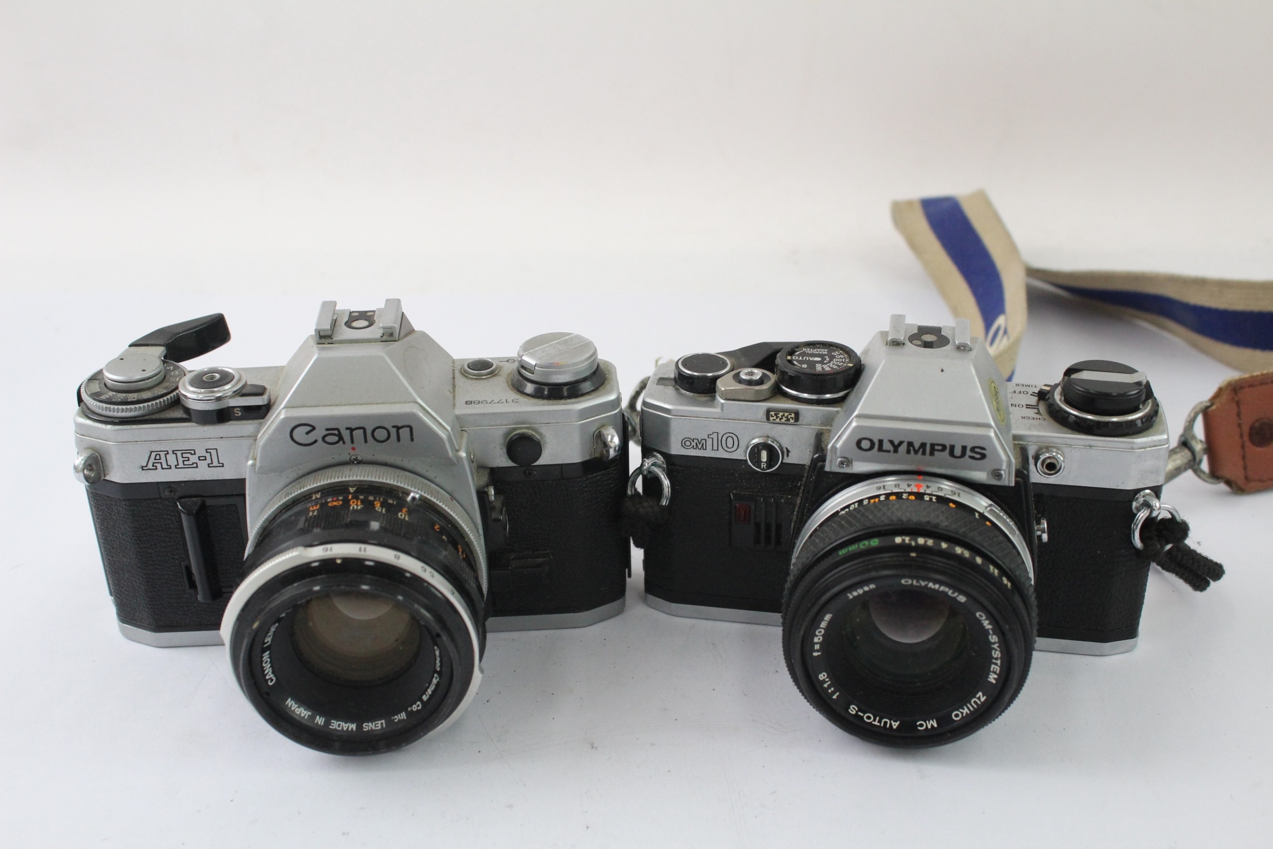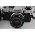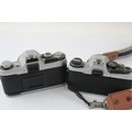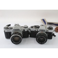 Two 35mm SLR cameras, one Canon AE-1 fitted with FL 1:1.8 50mm lens and one Olympus OM10 fitted with Zuiko MC Auto-S 1:1.8 50mm lens