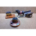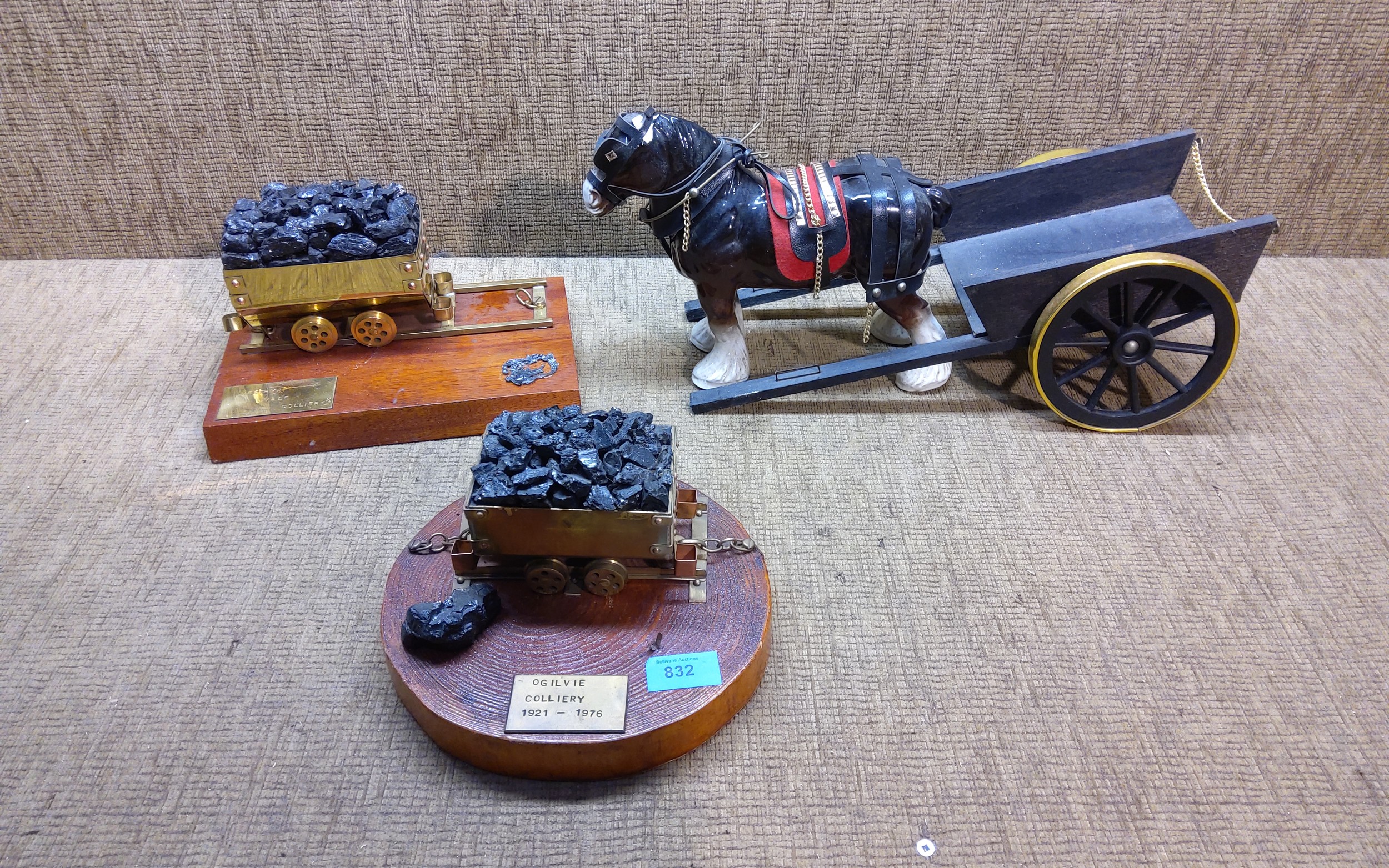 Two brass coal mining carts and a shire horse and cart.