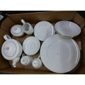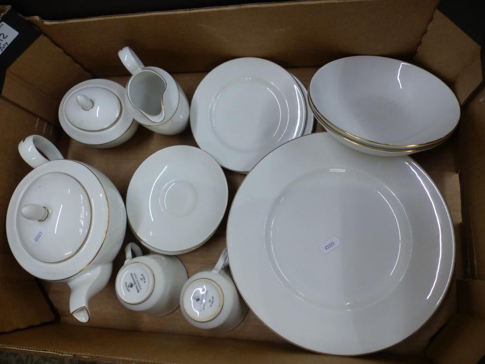 Royal Doulton Warwick Gold pattern Teaware items to include Teapot, tea cups, bowls, milk and sugar, dinner plates, side plates etc (1 tray)