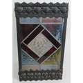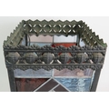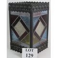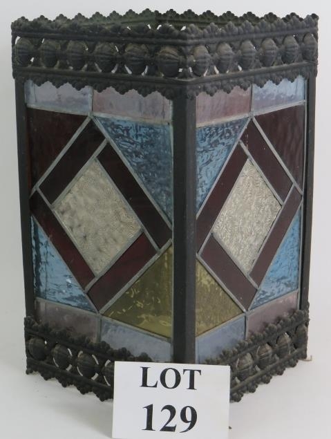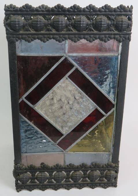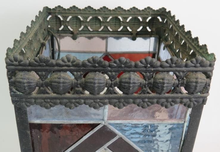 An Edwardian stained glass hall lantern with geometric design leaded glass panels within a pressed brass frame. 35cm x 21cm x 21cm.