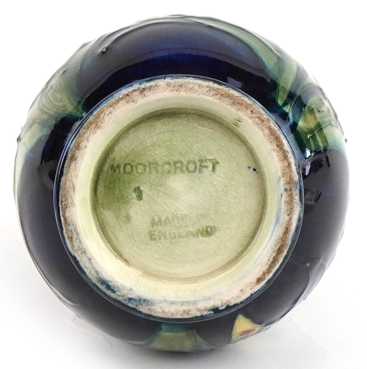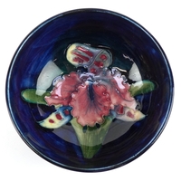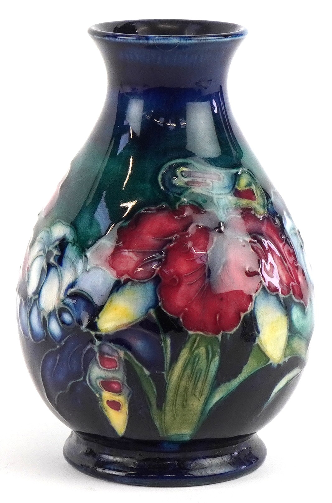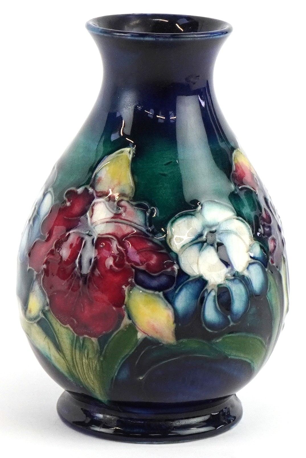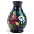 A Moorcroft pottery baluster vase hand painted in the Orchid pattern, 12cm high.