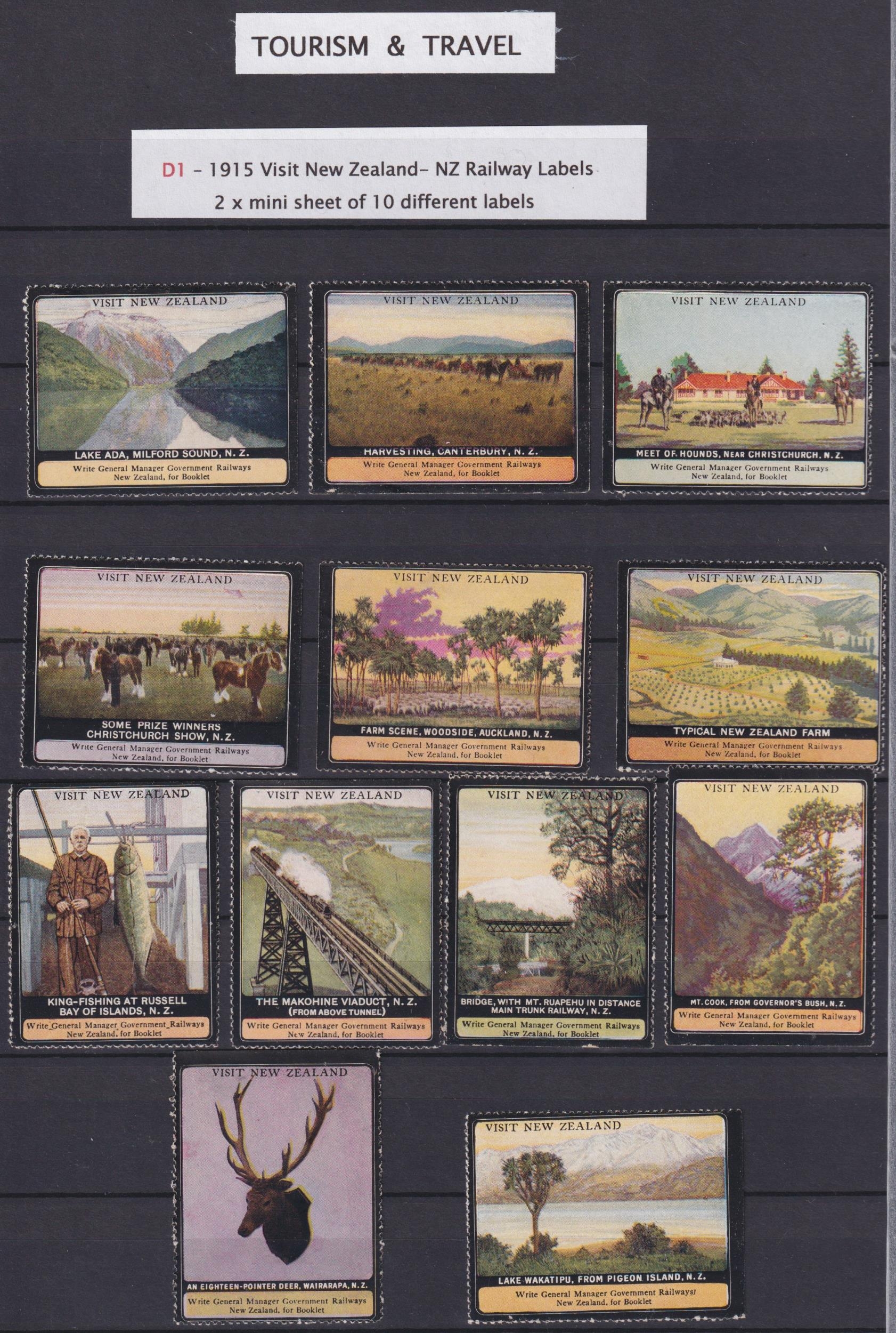 1915/37 collection of ‘Tourism and Travel’ labels on stock sheets, with a 1915 set of 18 (plus 3 on cover), 1937 ‘South Island Travel Association’ x10 etc.