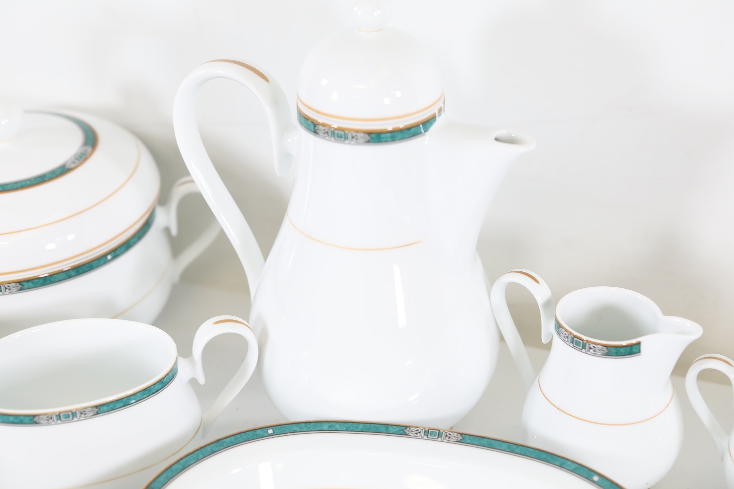 Fine Noritake porcelain dinner and tea service comprising 60 plus pieces, uniformly decorated with a mottled emerald green band enriched with silver geometric motifs, gilt rims and finials, and a secondary inner gilt line. The set includes dinner plates, side and bread plates, soup bowls, teacups with saucers, serving platters, a covered vegetable dish, coffee pot, gravy boat, lidded sugar bowl, creamer, and salt and pepper shakers. Mid to late 20th century Noritake export design with Art Deco influenced ornament. Soup bowls approx 8 to 9 inches diameter. Bright decoration and gilding with no chips or cracks visible.