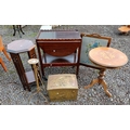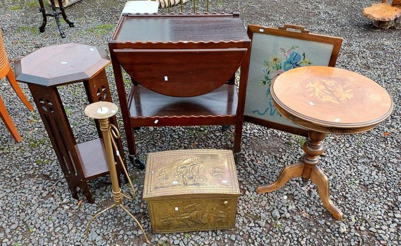 INLAID OAK CIRCULAR PEDESTAL TABLE, OCTAGONAL PLANT STAND, MAHOGANY TROLLEY, ETC.