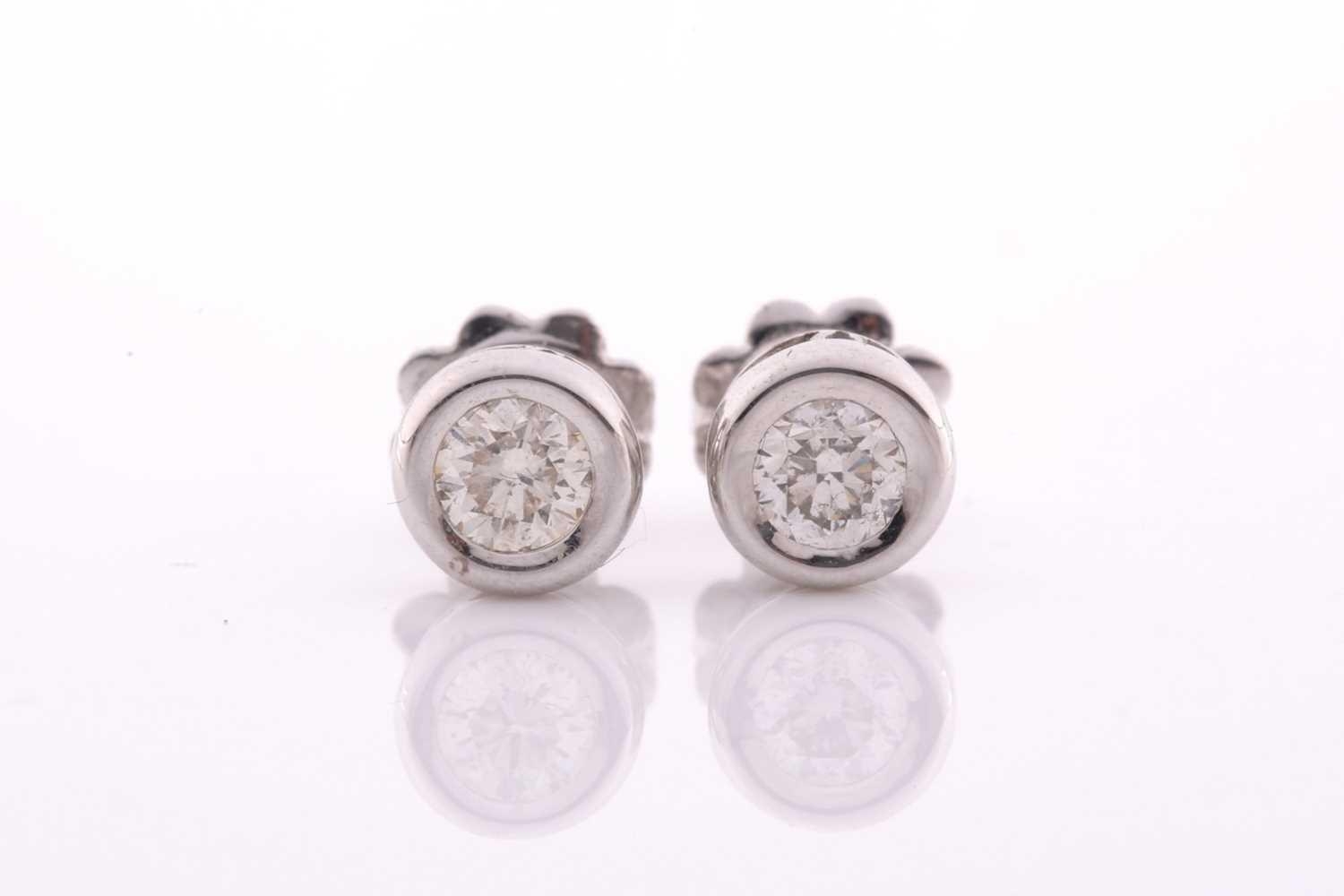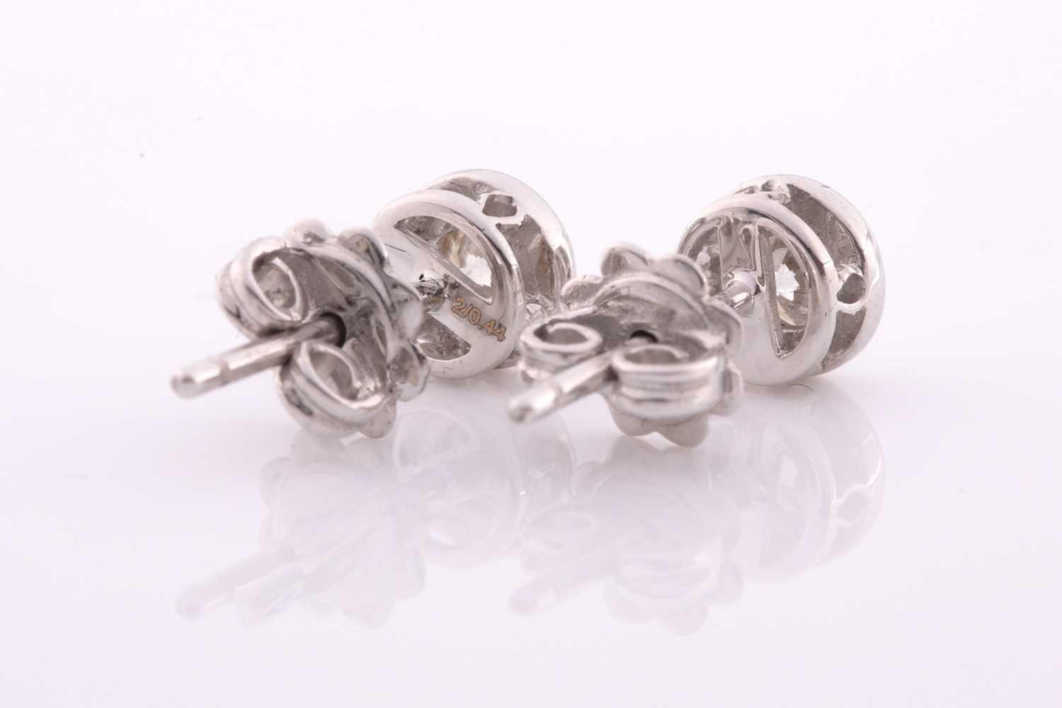 A pair of collet-set diamond solitaire ear studs, set with round brilliant-cut diamonds of approximately 0.44 carats combined, marked to one earring, set in unmarked white metal (tests as 18ct white gold).