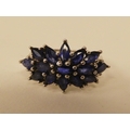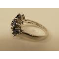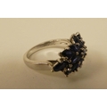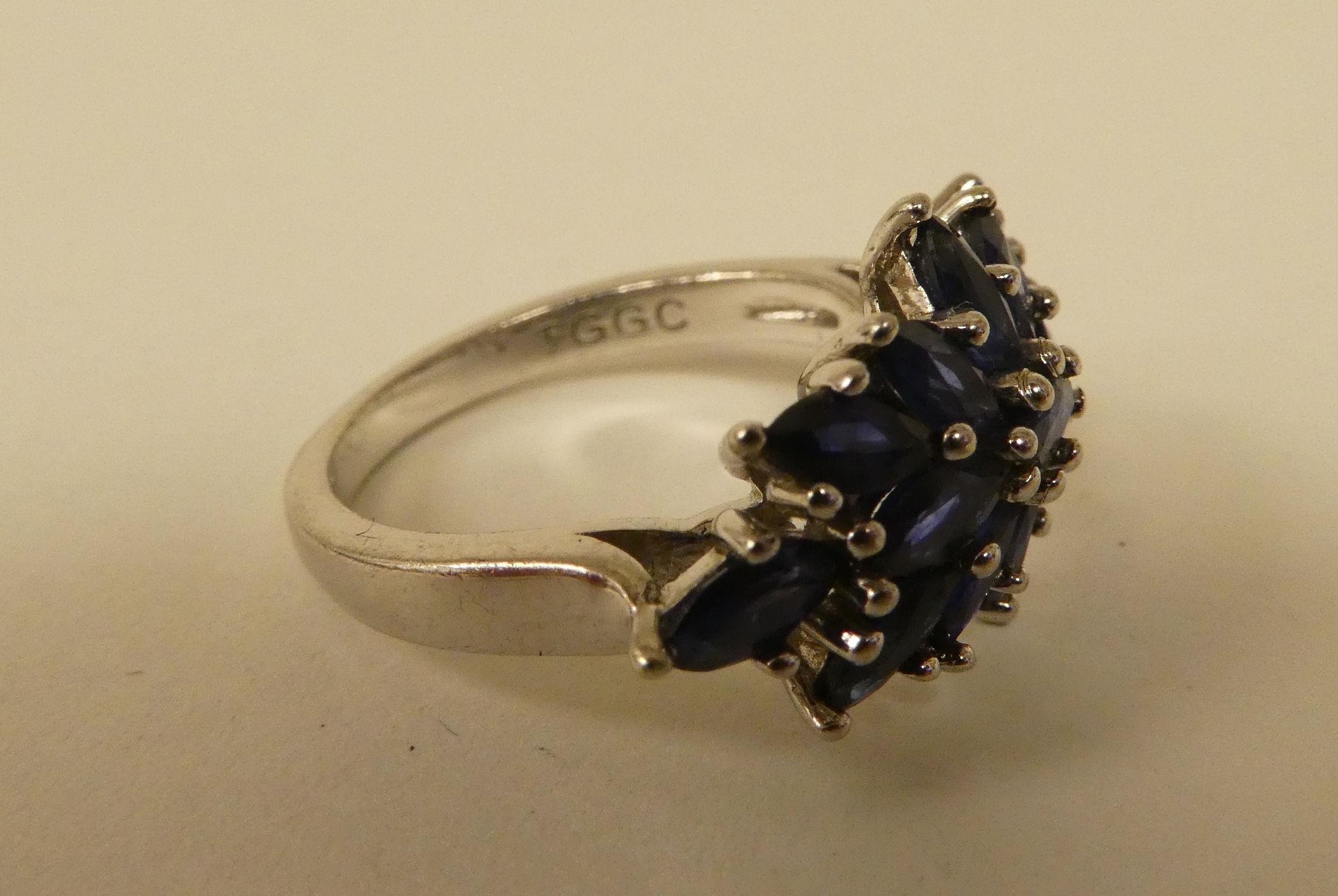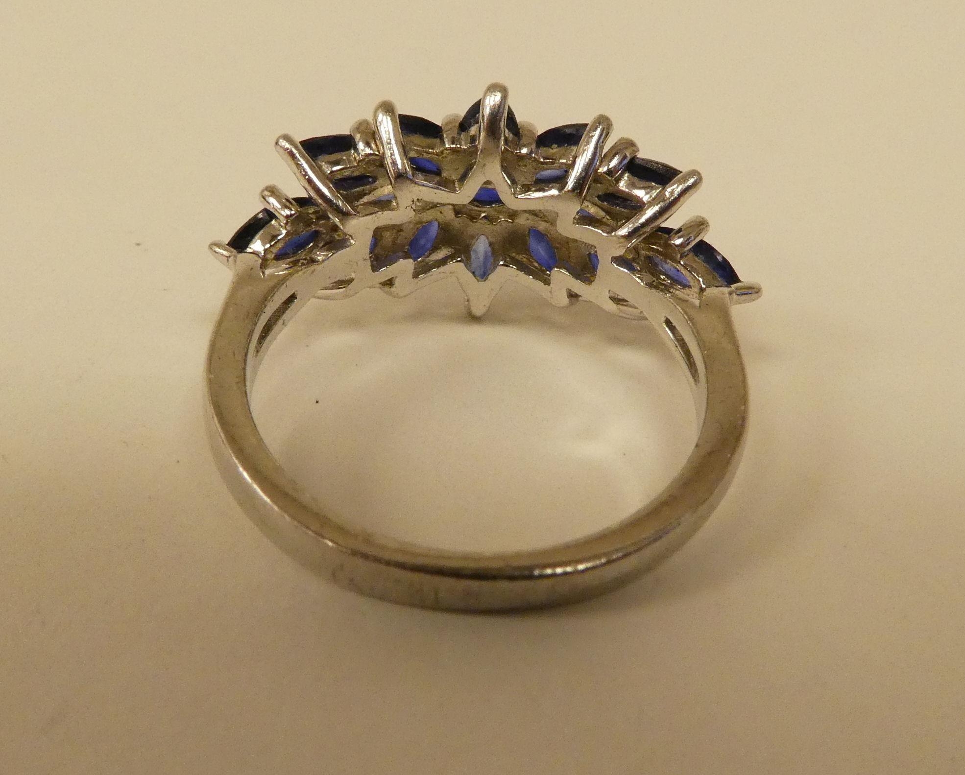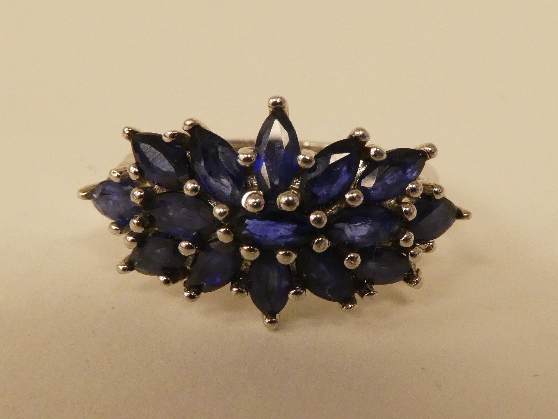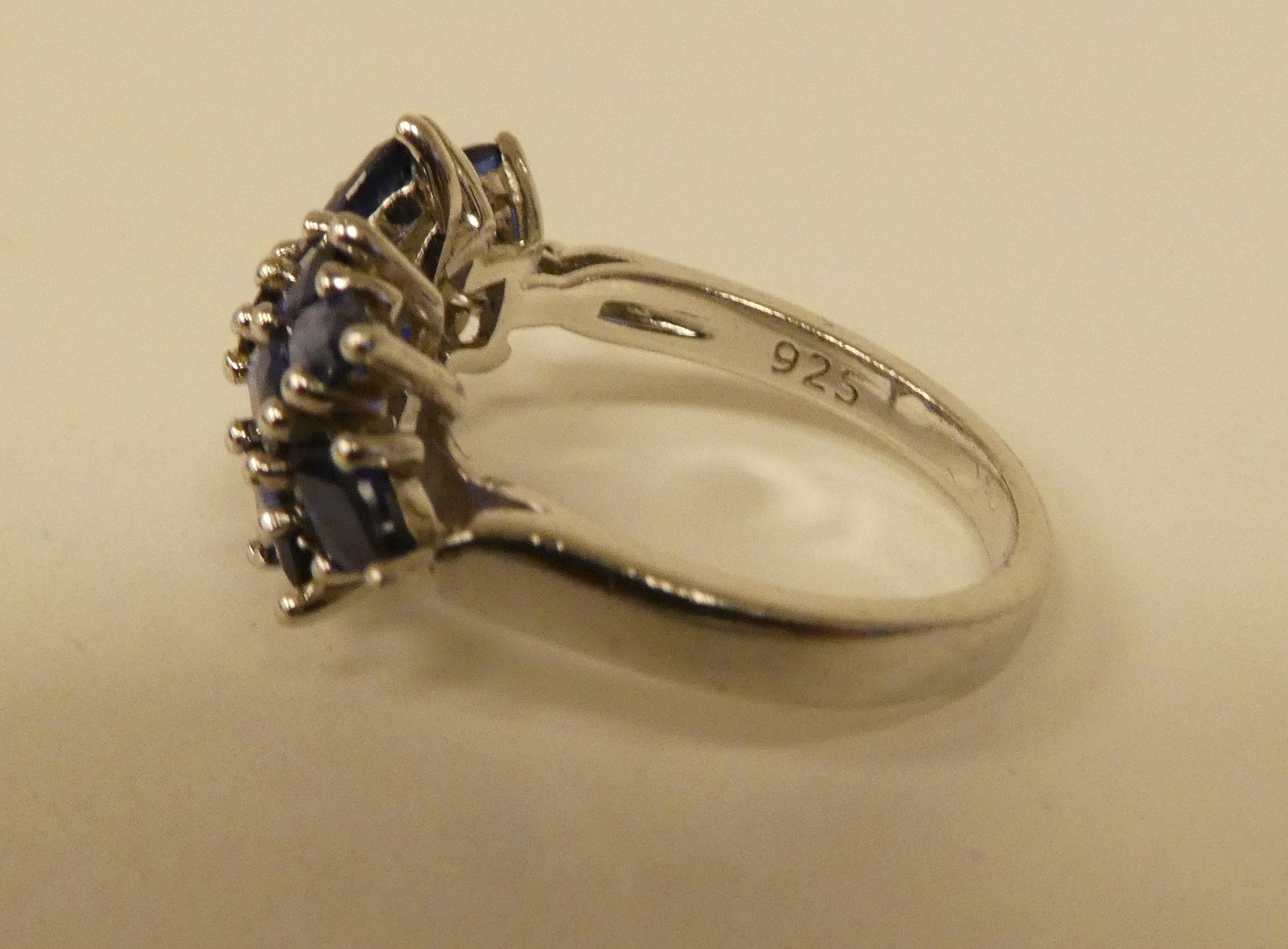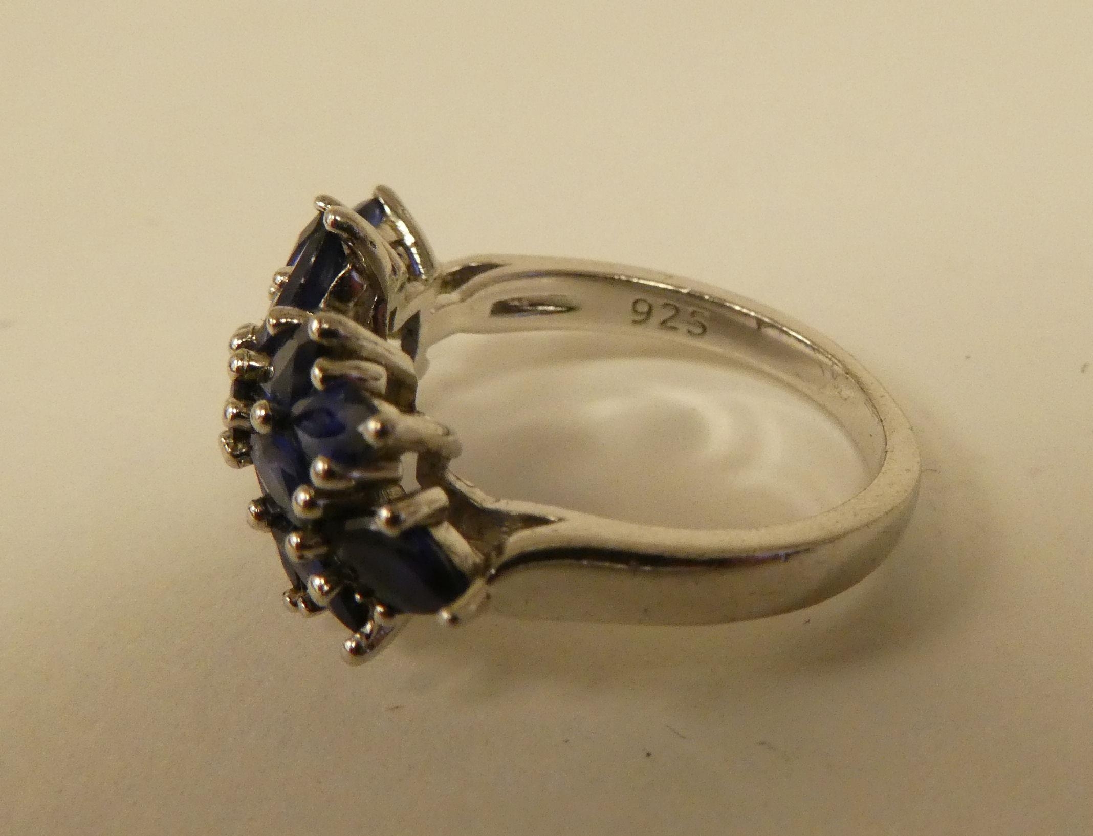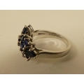 A white metal cluster ring, set with oval cut sapphires stamped 925