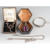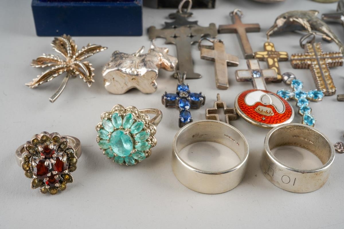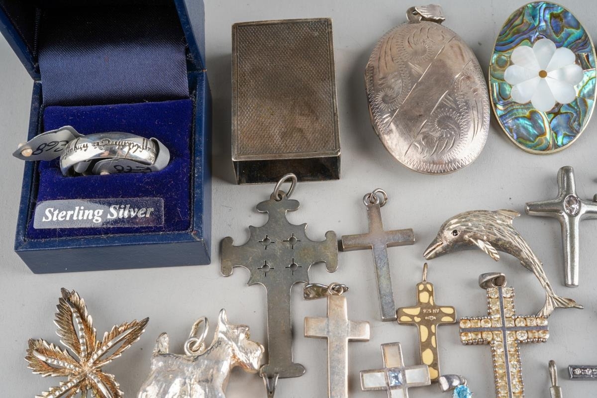 Assorted silver and white metal jewellery to include engine turned match box holder; West Highland Terrier pendant; four various silver bands - two plain, two with engraved inscription; various cross shaped pendants; dolphin brooch, large oval locket etc (1 bag)