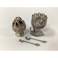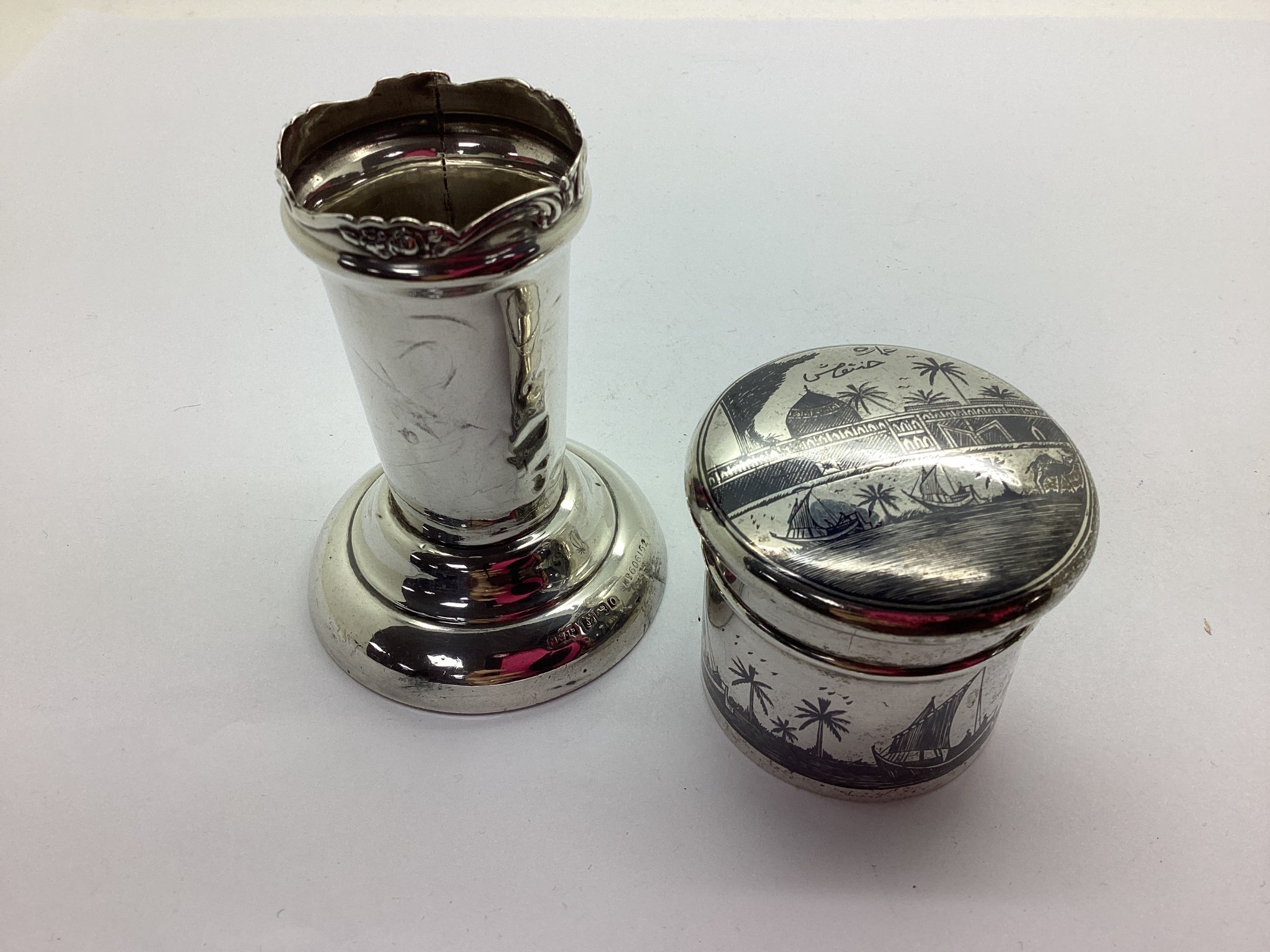 A Vintage Middle Eastern Niello Trinket Pot, of cylindrical form, detailed with temple buildings and boats on water, with pull off domed cover, together with a hallmarked silver vase (lacking liner?). (2)