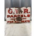 Metal railway sign reading 'G.W.R. PARCELS RECEIVED HERE FOR ALL PARTS' Enamel 12inch by 18inch