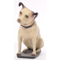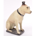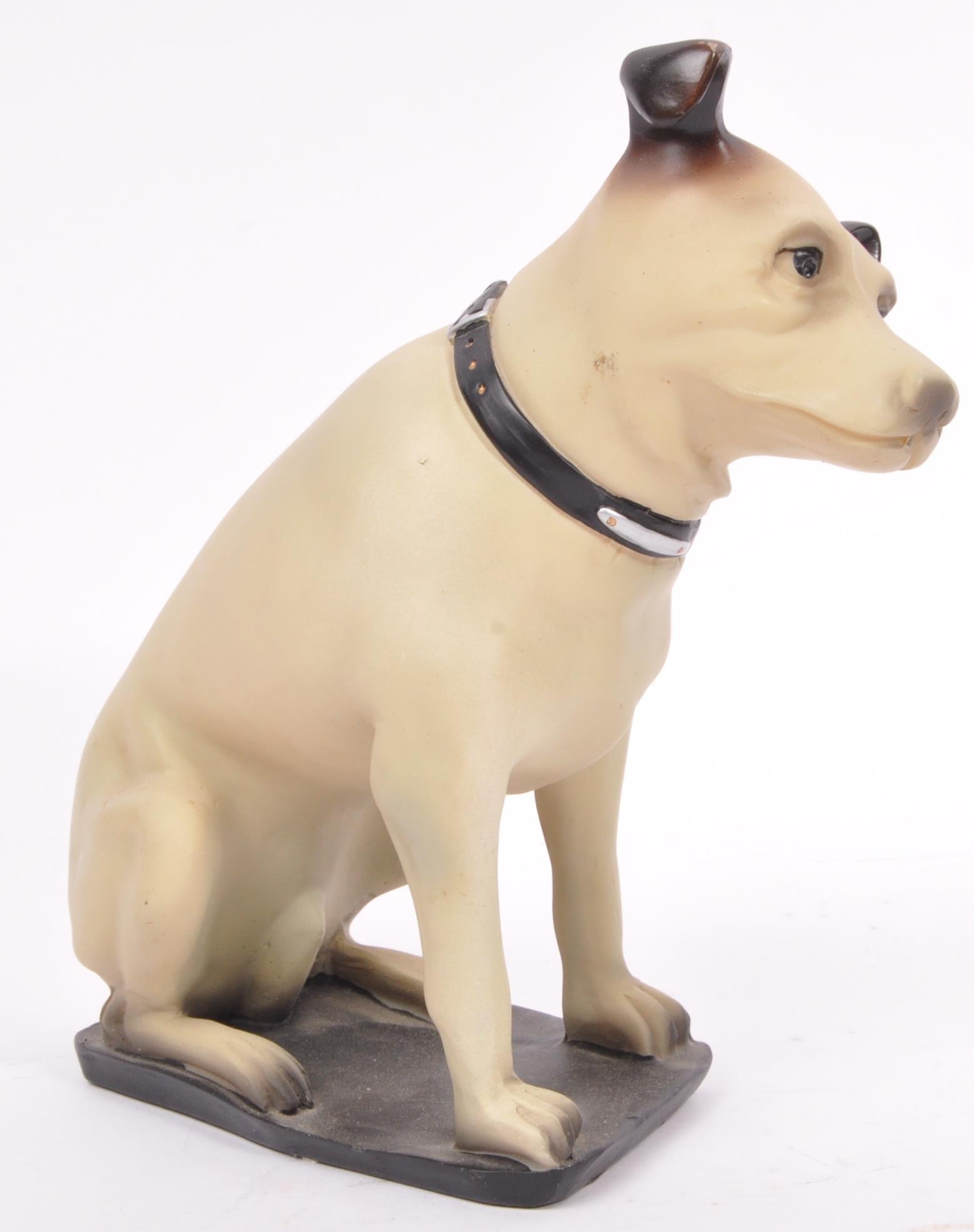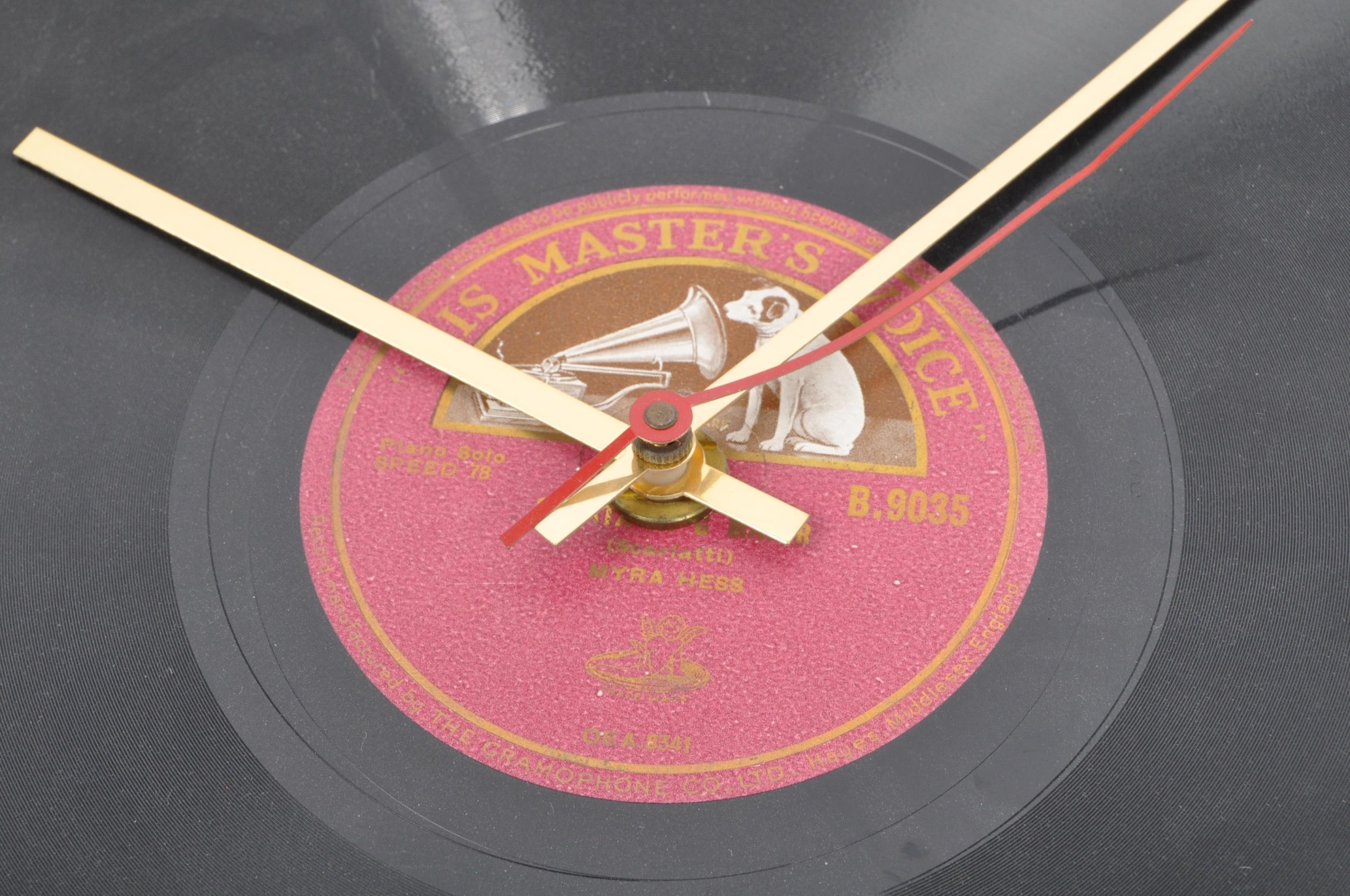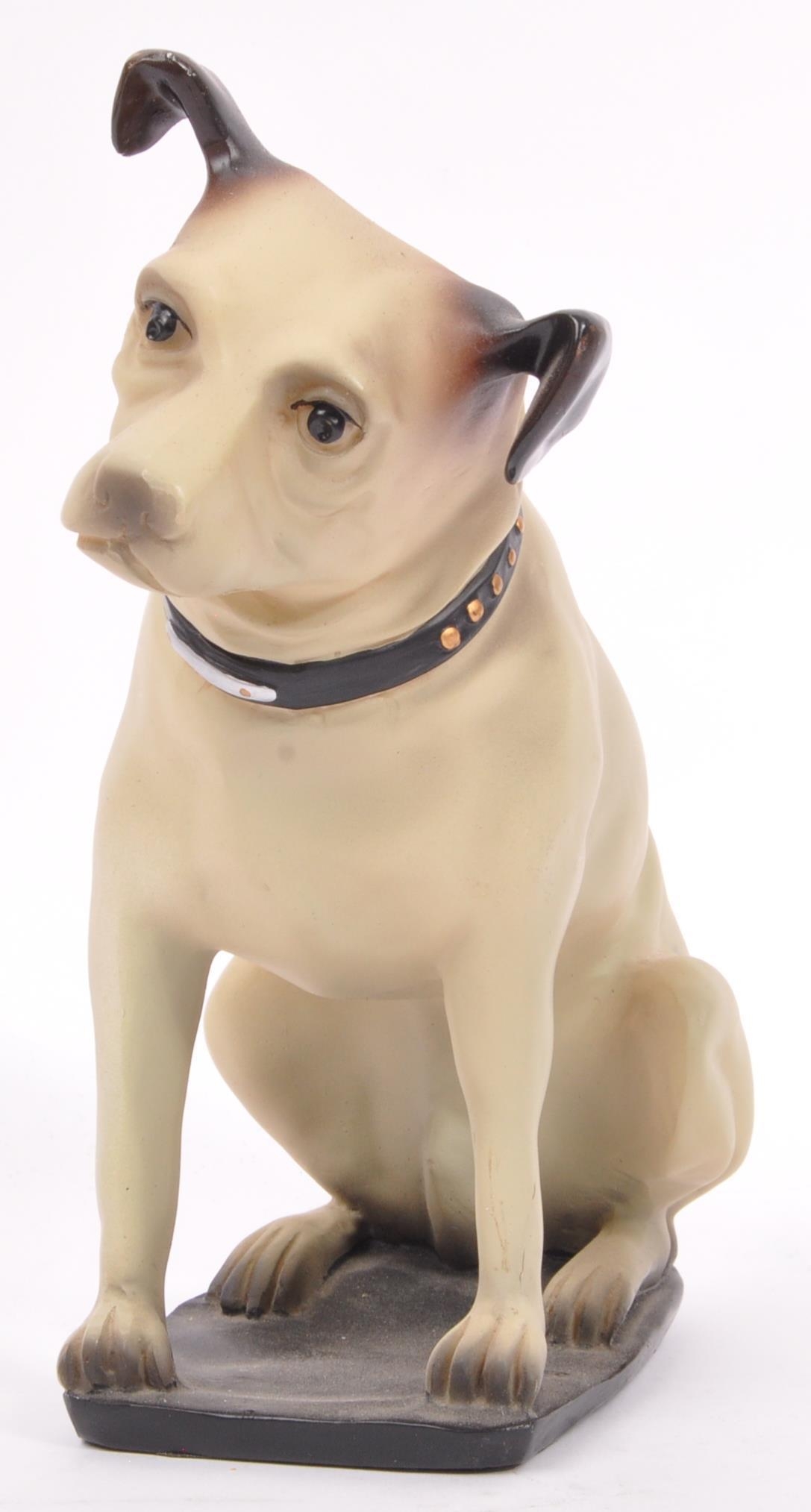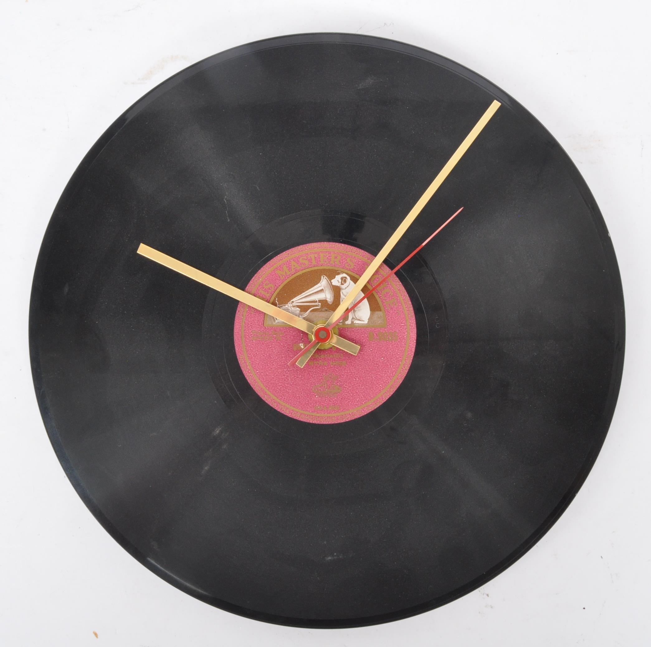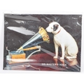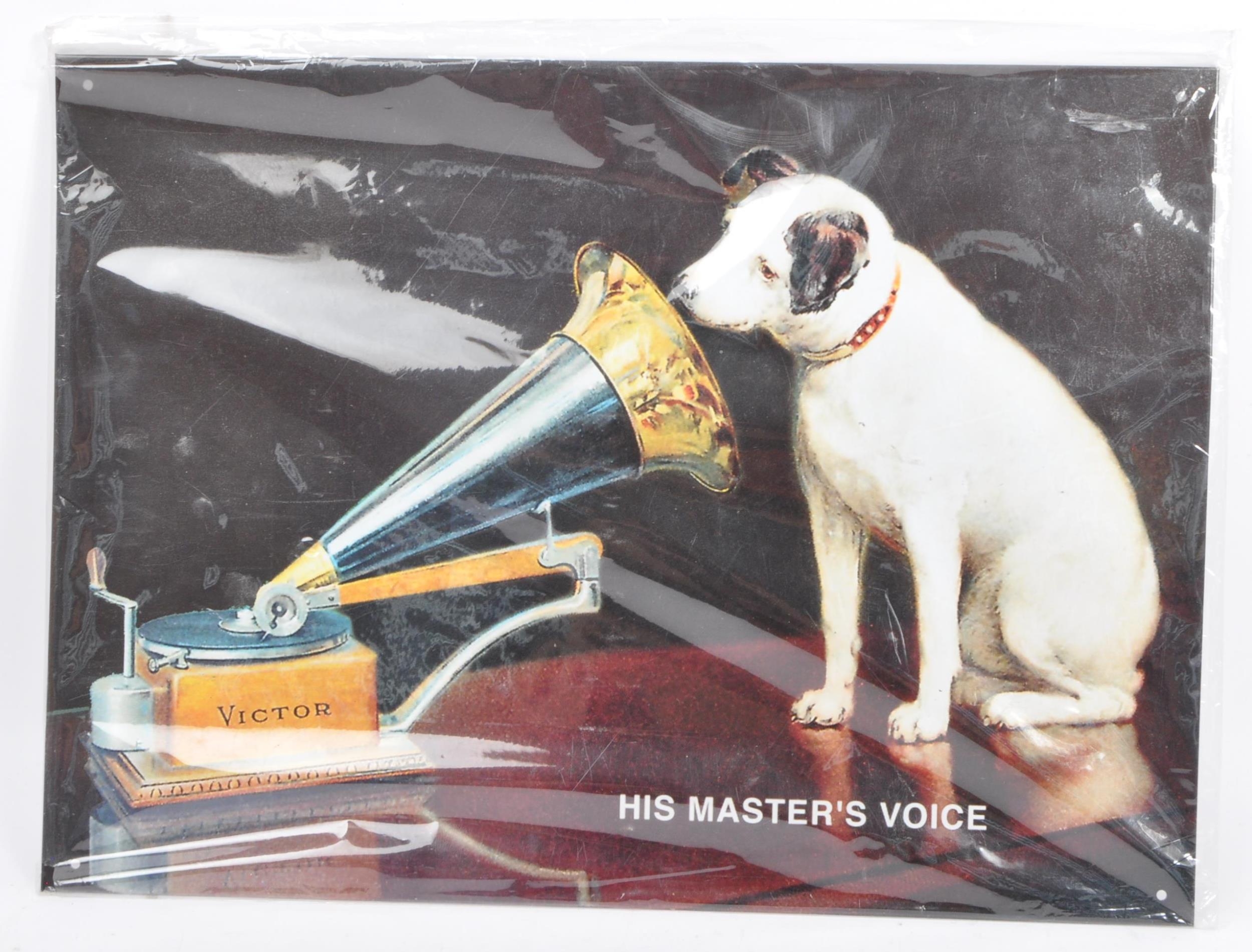 A collection of vintage 20th century HMV His Master's Voice memorabilia. With a figurine of Nipper the dog, record vinyl wall clock and a metal hanging wall sign of the gramophone and dog. Measures approx. 30cm x 41cm