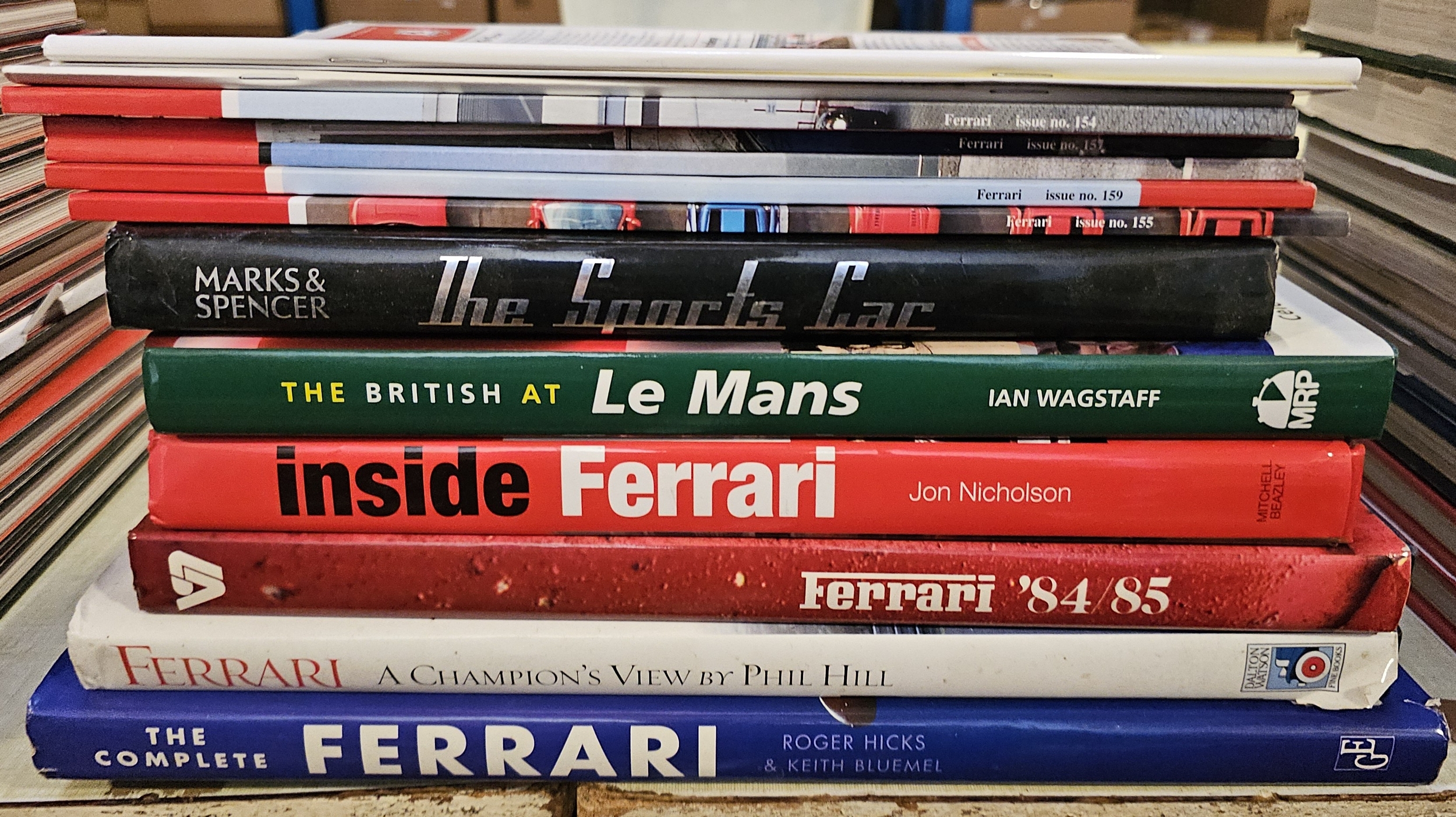 Four Ferrari hardback book, including Ferrari, a champions view by Phil Hill, and other books.