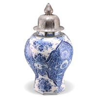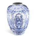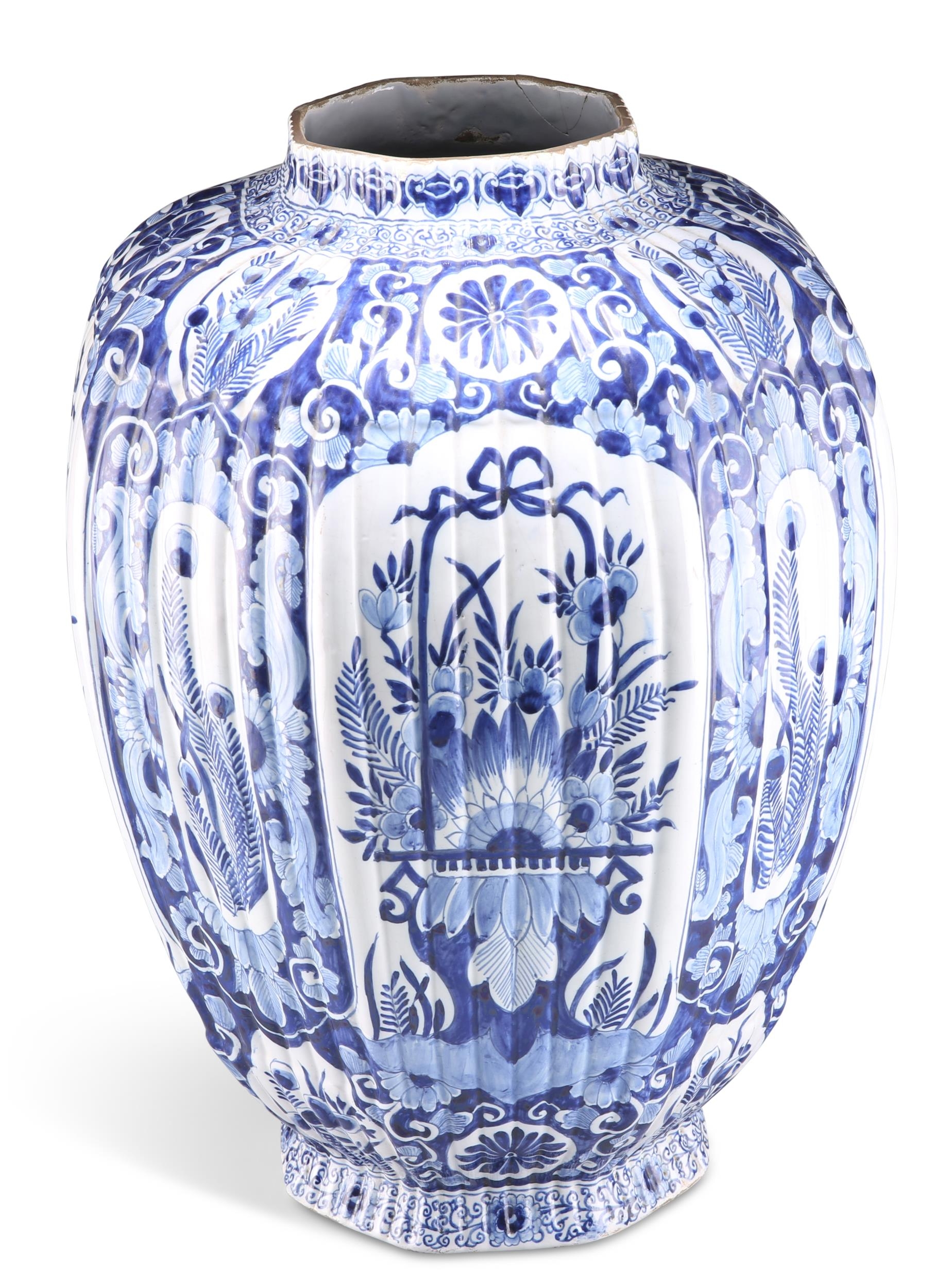 AN 18TH CENTURY LARGE DUTCH DELFT BLUE AND WHITE VASE, of ribbed octagonal baluster form, with conforming rim and foot, decorated with reserves of chinoiserie flowers and feathers, the base with marks for Johannes Van Duijn, (a/f). 46cm high