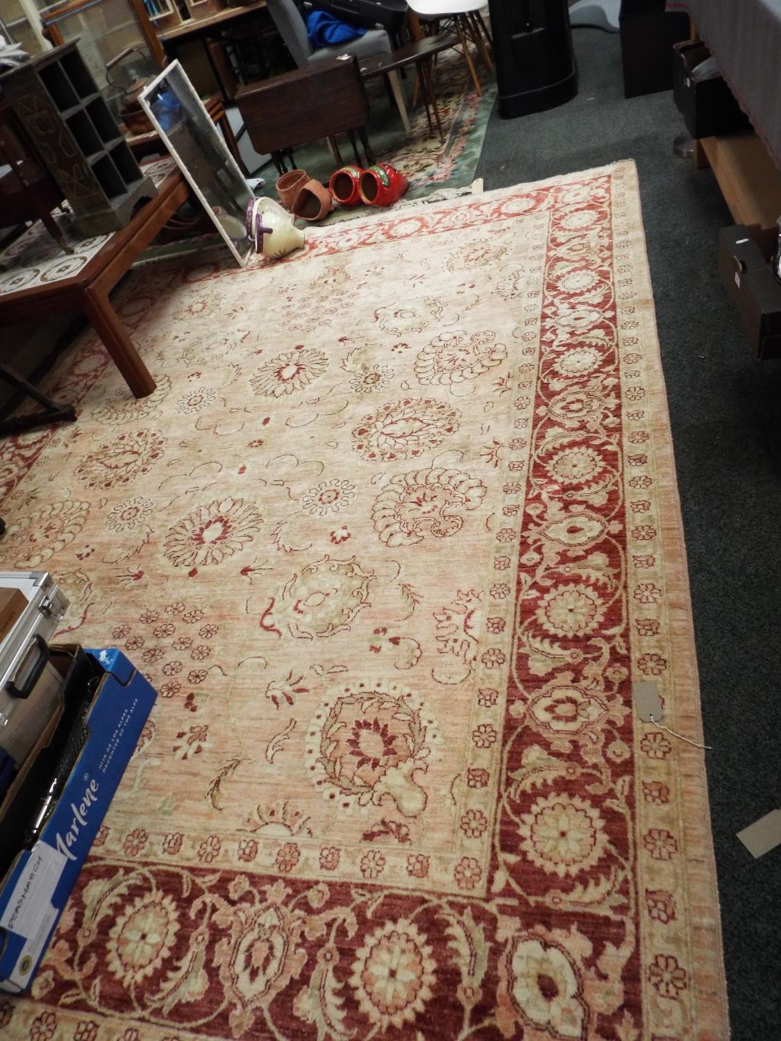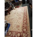 A red ground rug having stylised pattern 126” x 92”