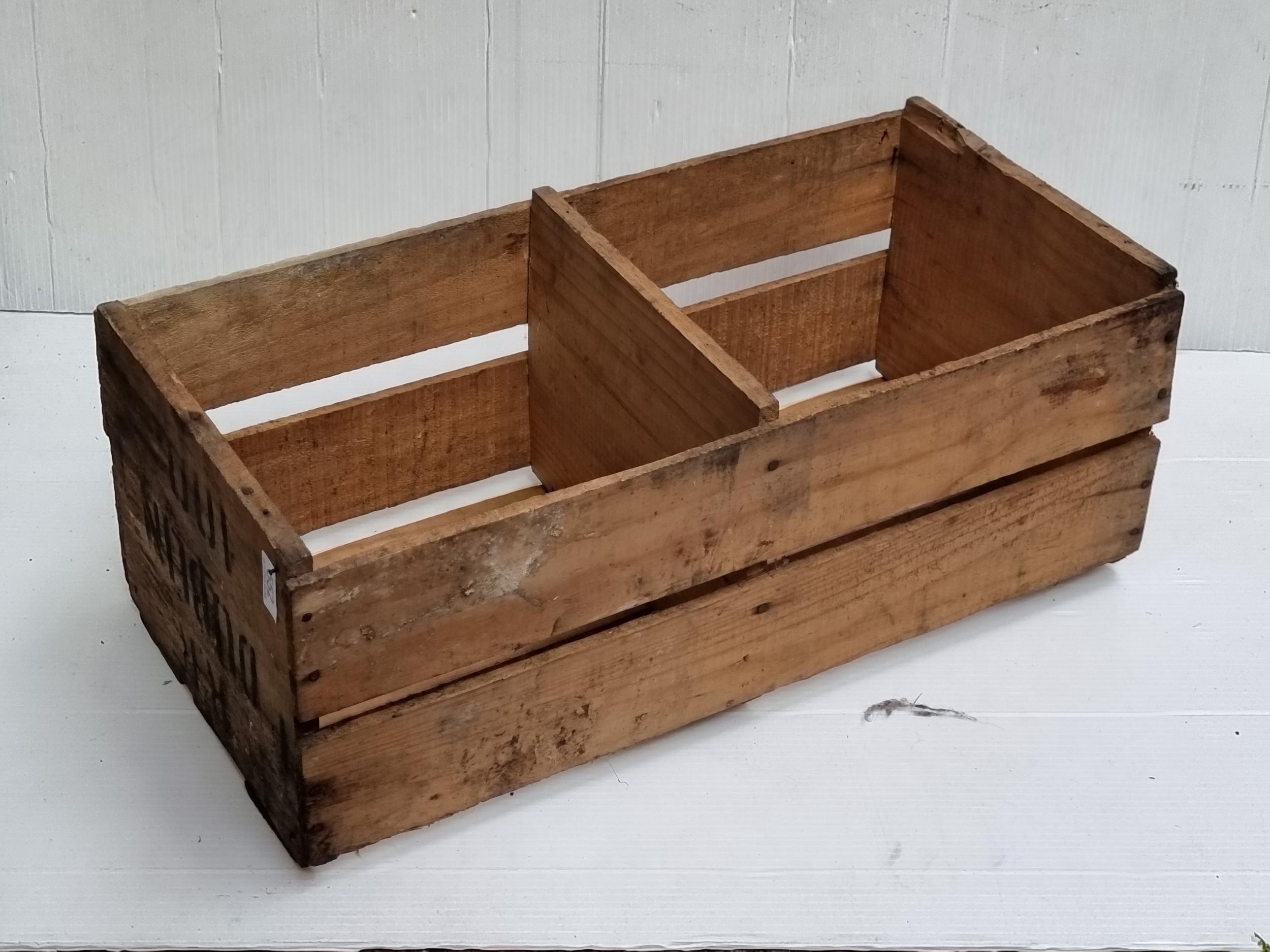 Large Rustic partitioned onion crate marked 'Dublin' at one end and 'Chilean Onions' on the other.