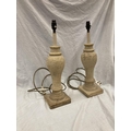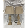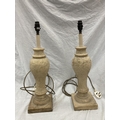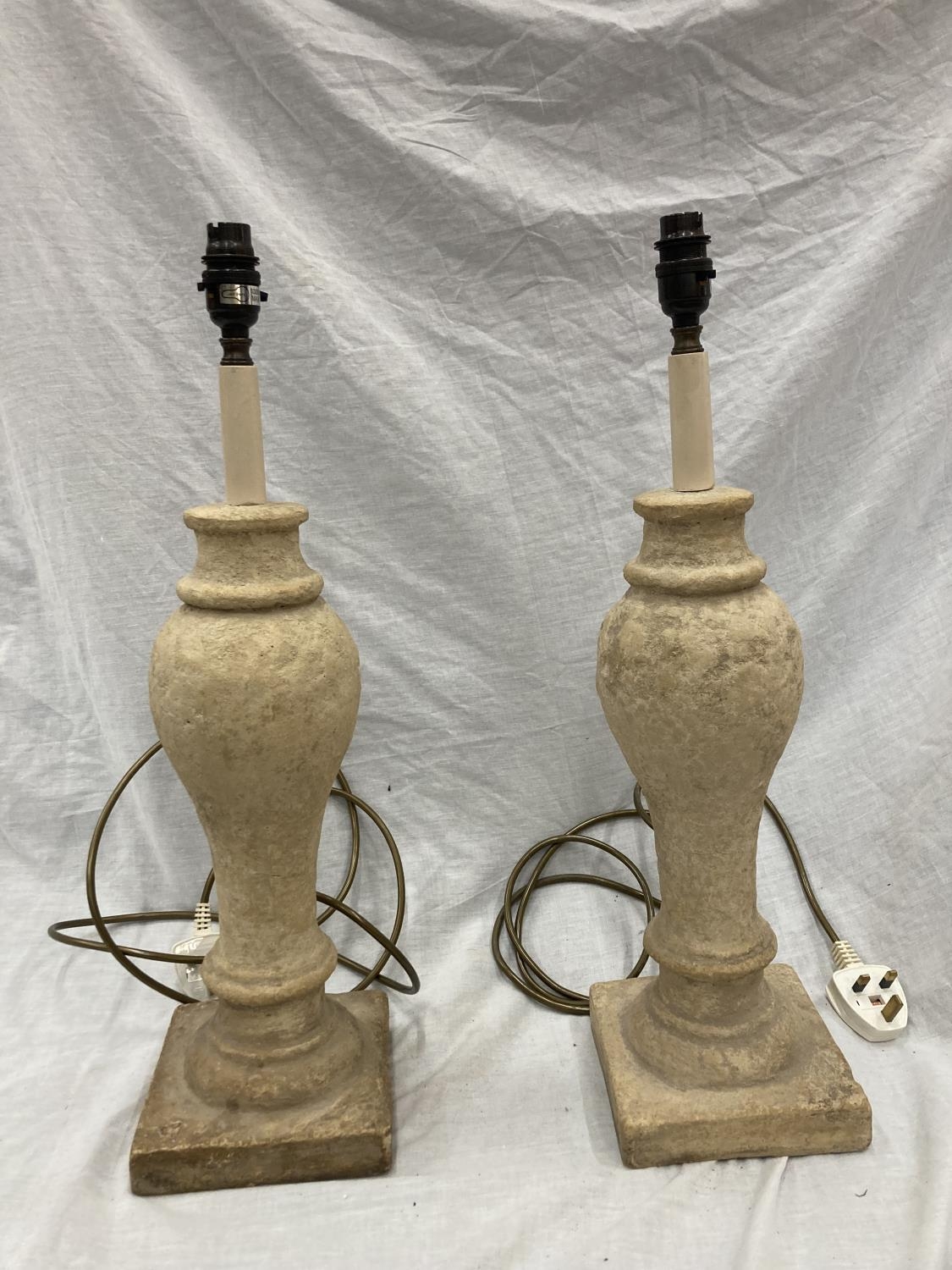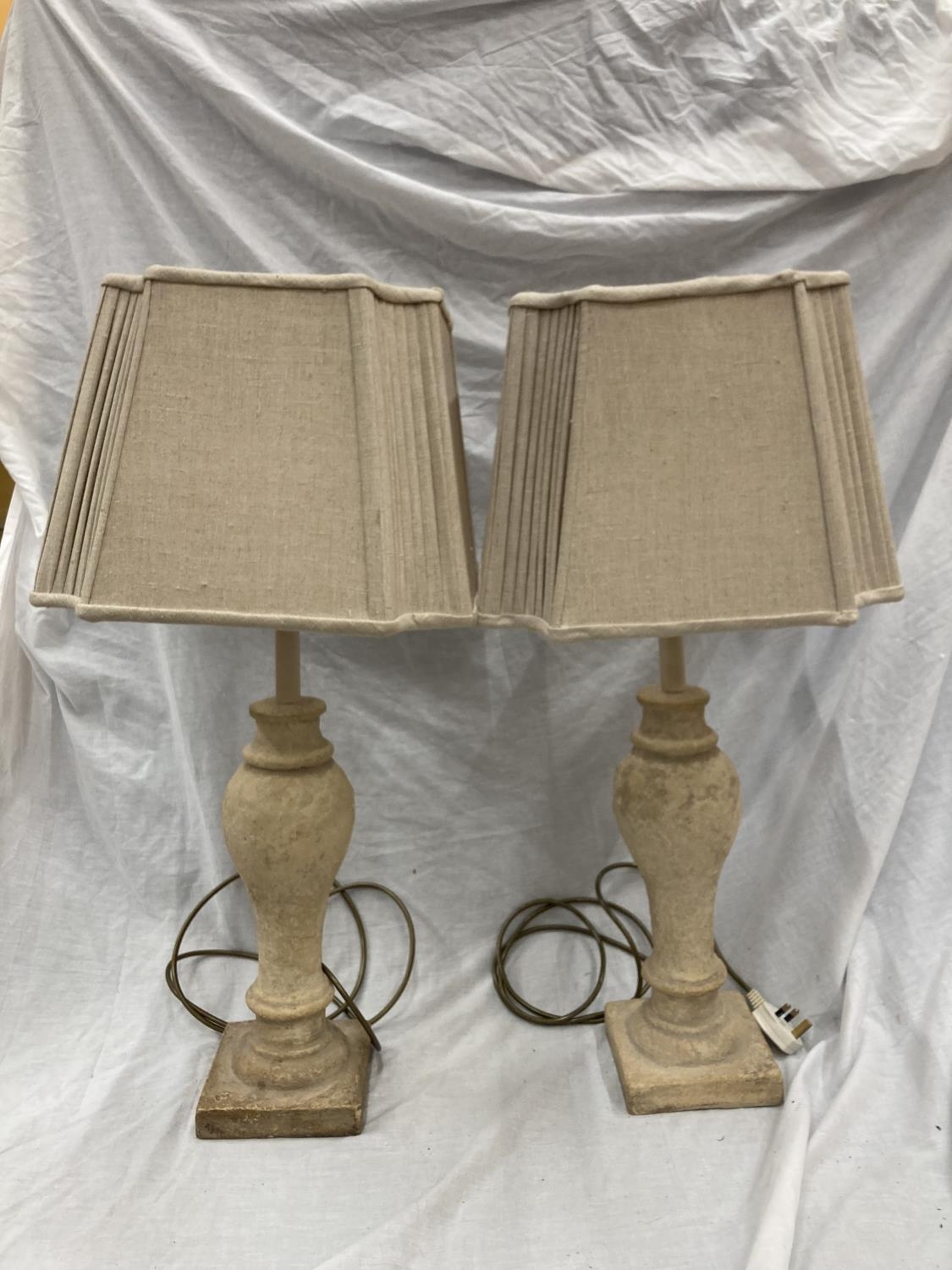 A PAIR OF CREAM STONE LAMPS WITH SHADES - HEIGHT 54CM