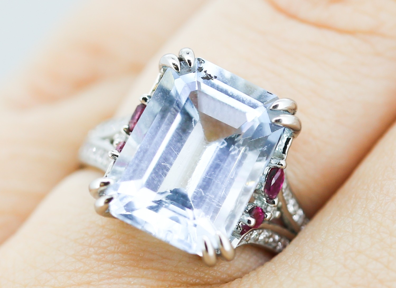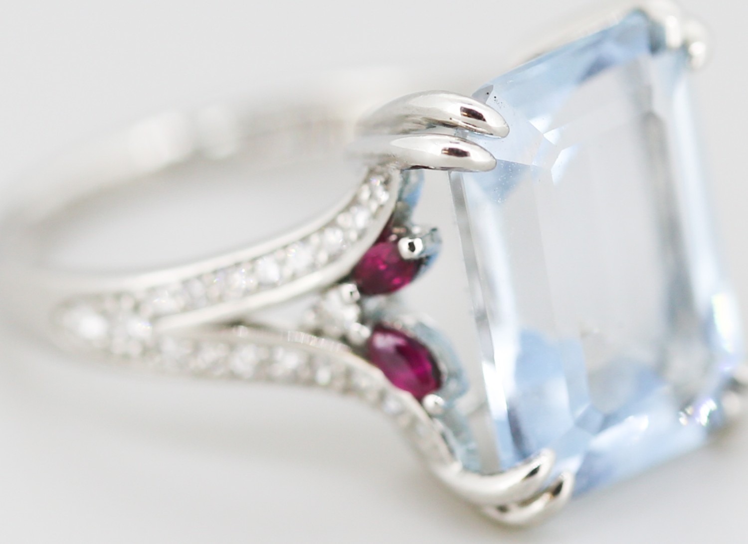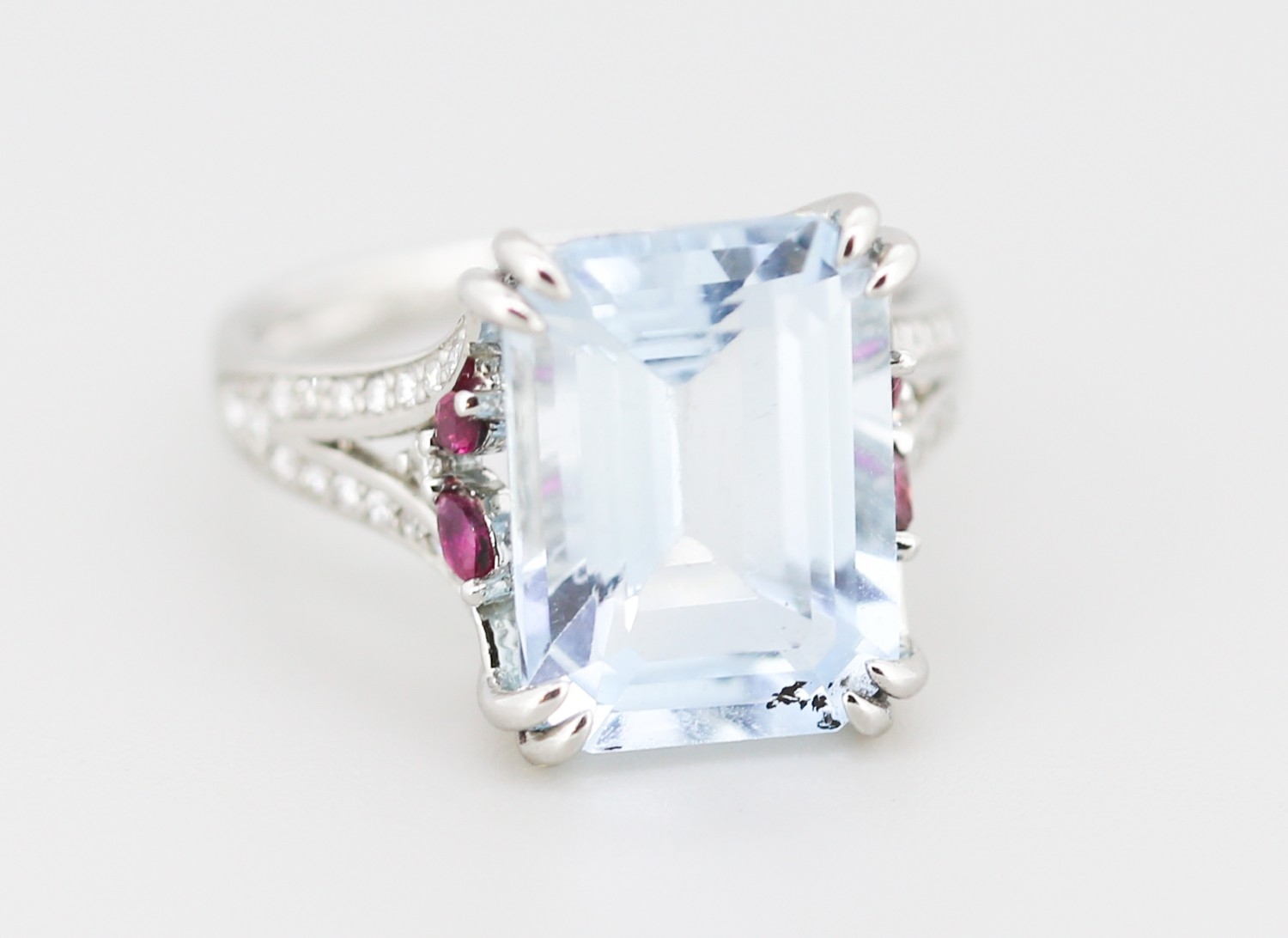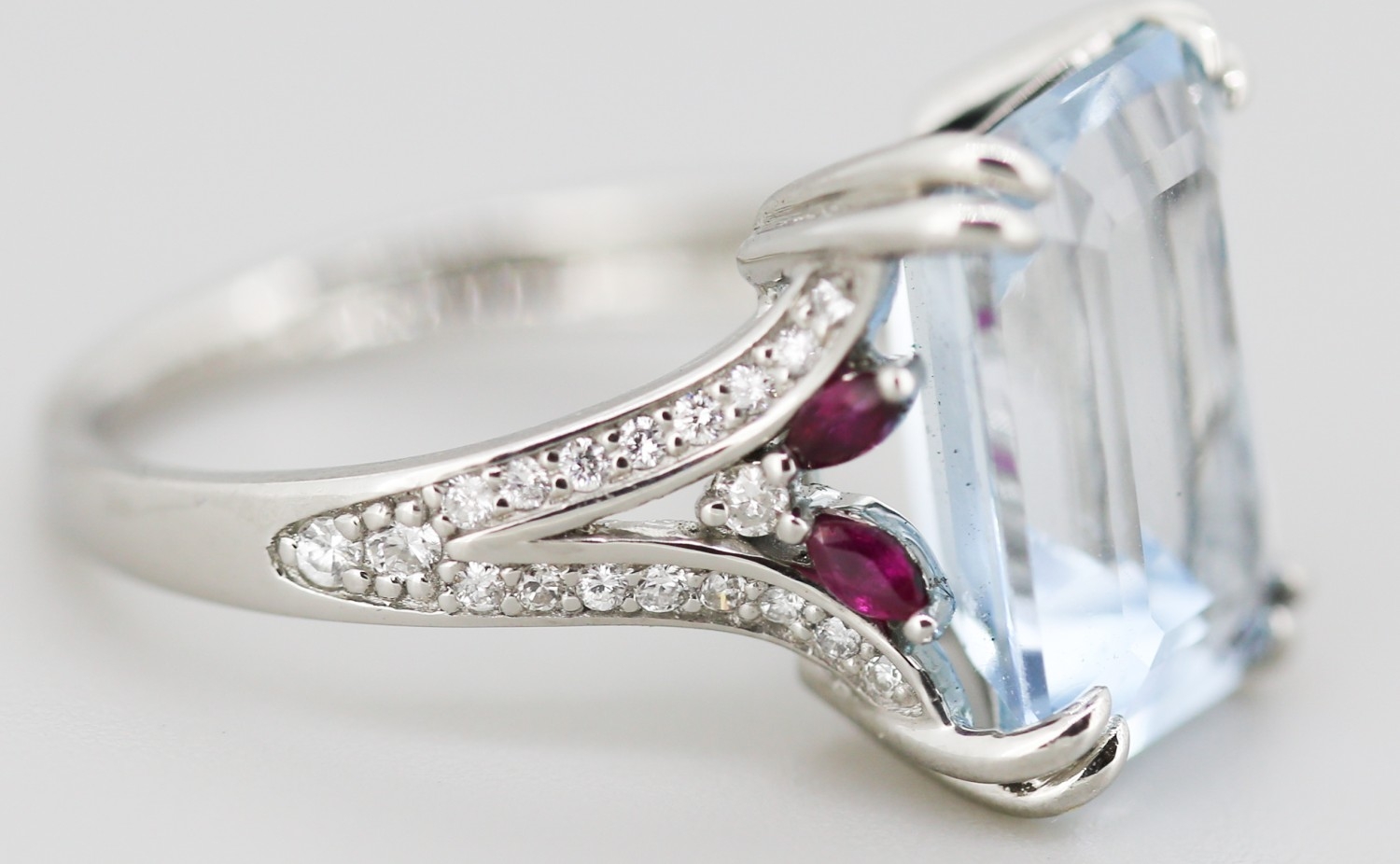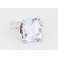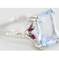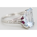 Finely Detailed Emerald Cut Aquamarine Set Ring with Diamond Inset to Shoulders and Further Ruby Inset to Shoulders Mounted in Platinum Aquamarine 3.81ct Total Diamond Carat Weight .28ct Ring Size O and a Half