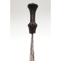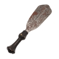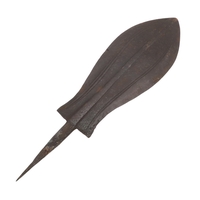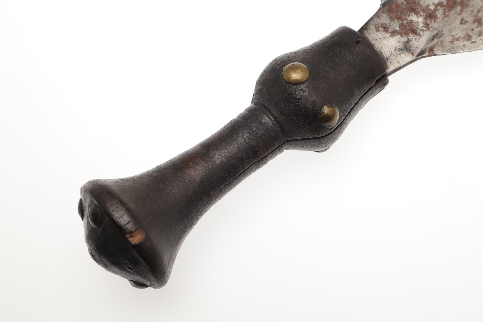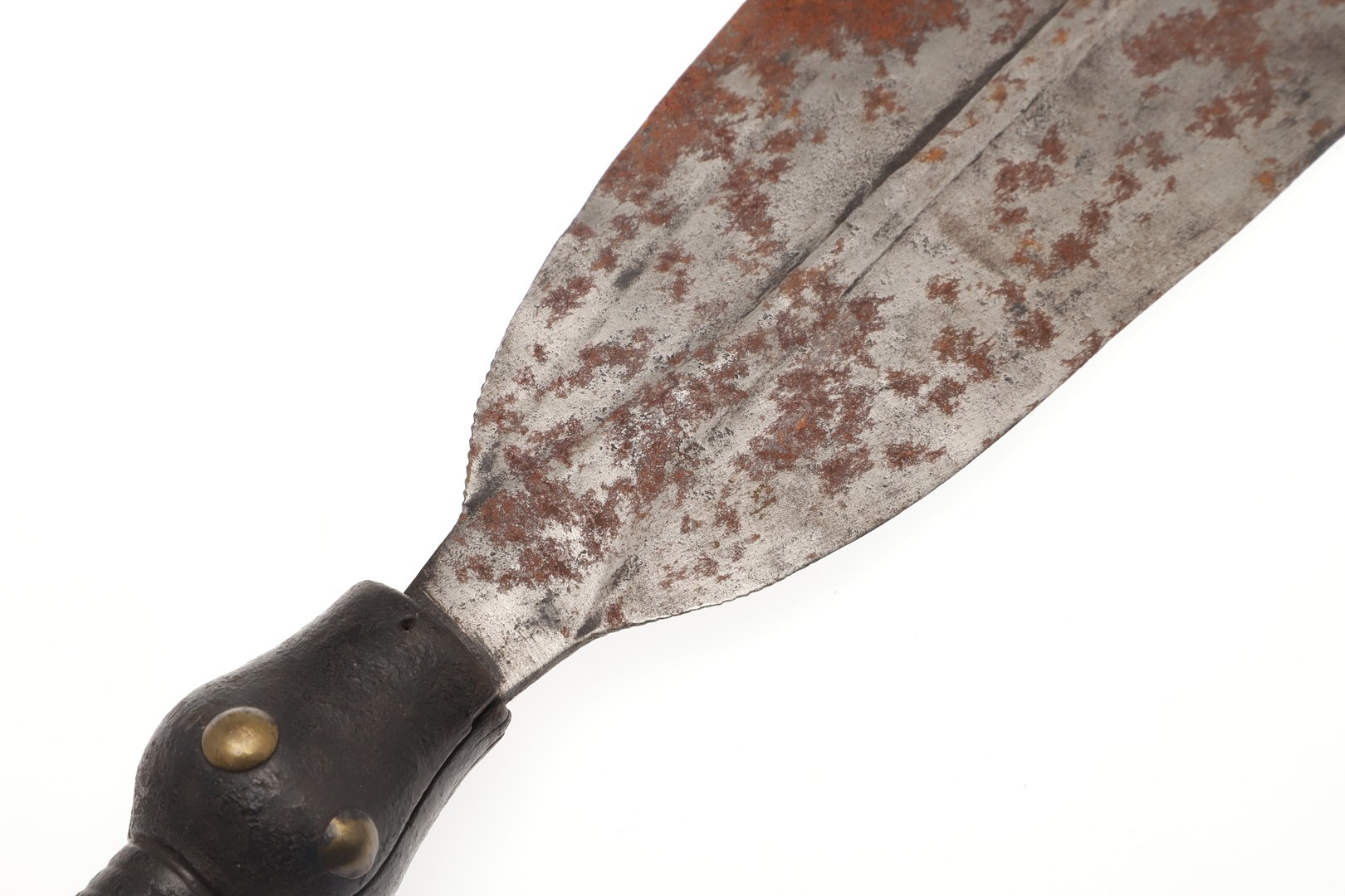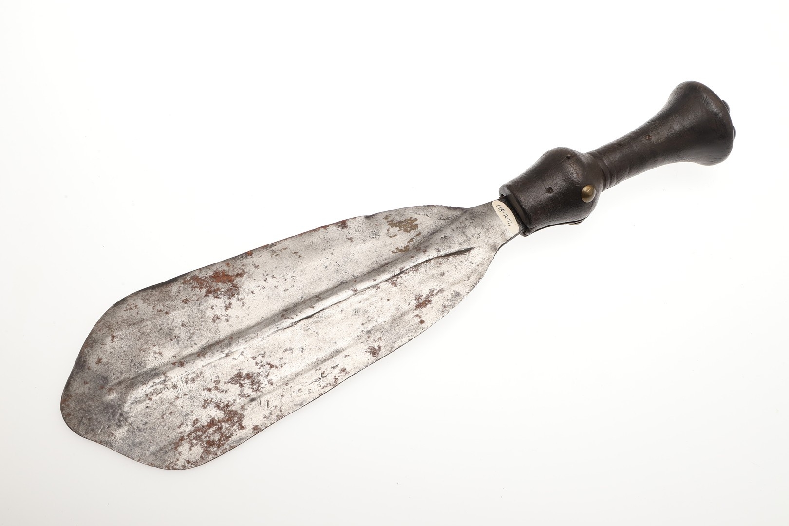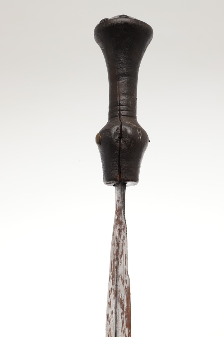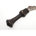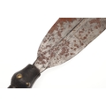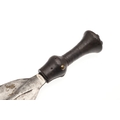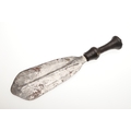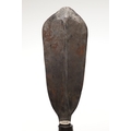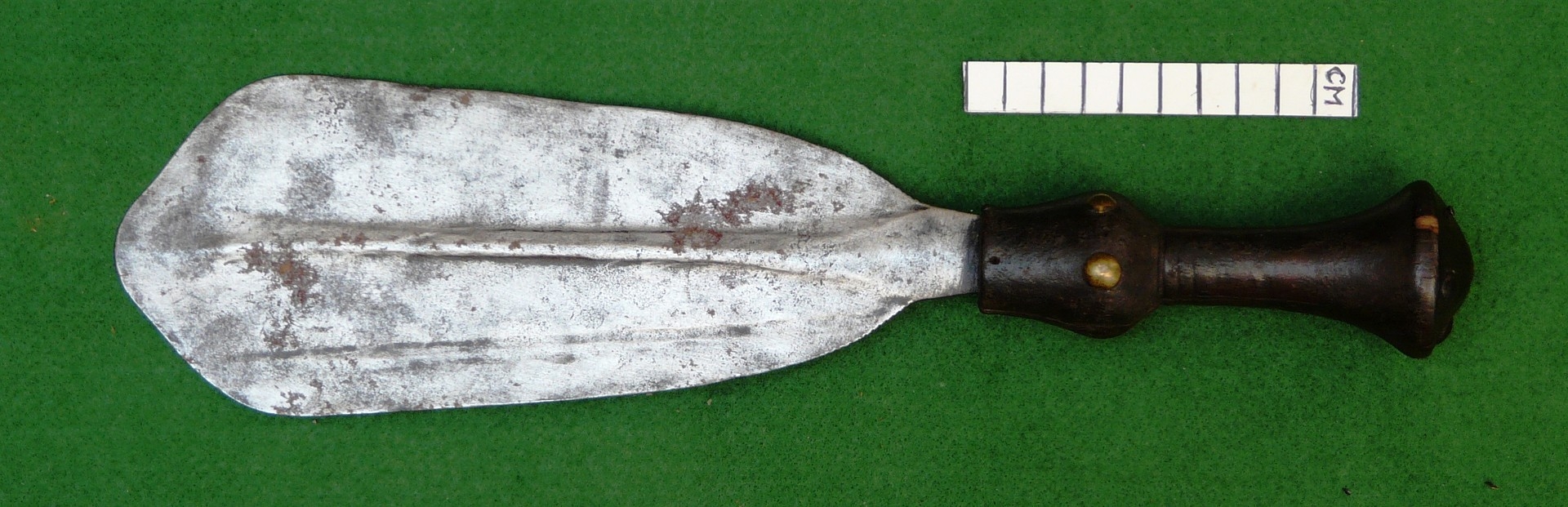 A LKULA KUBA CLUB KNIFE. The 22 cm club form blade with pronounced central spine, on a short wooden handle with circular pommel with elaborate nail head decoration. 34.5 cm.