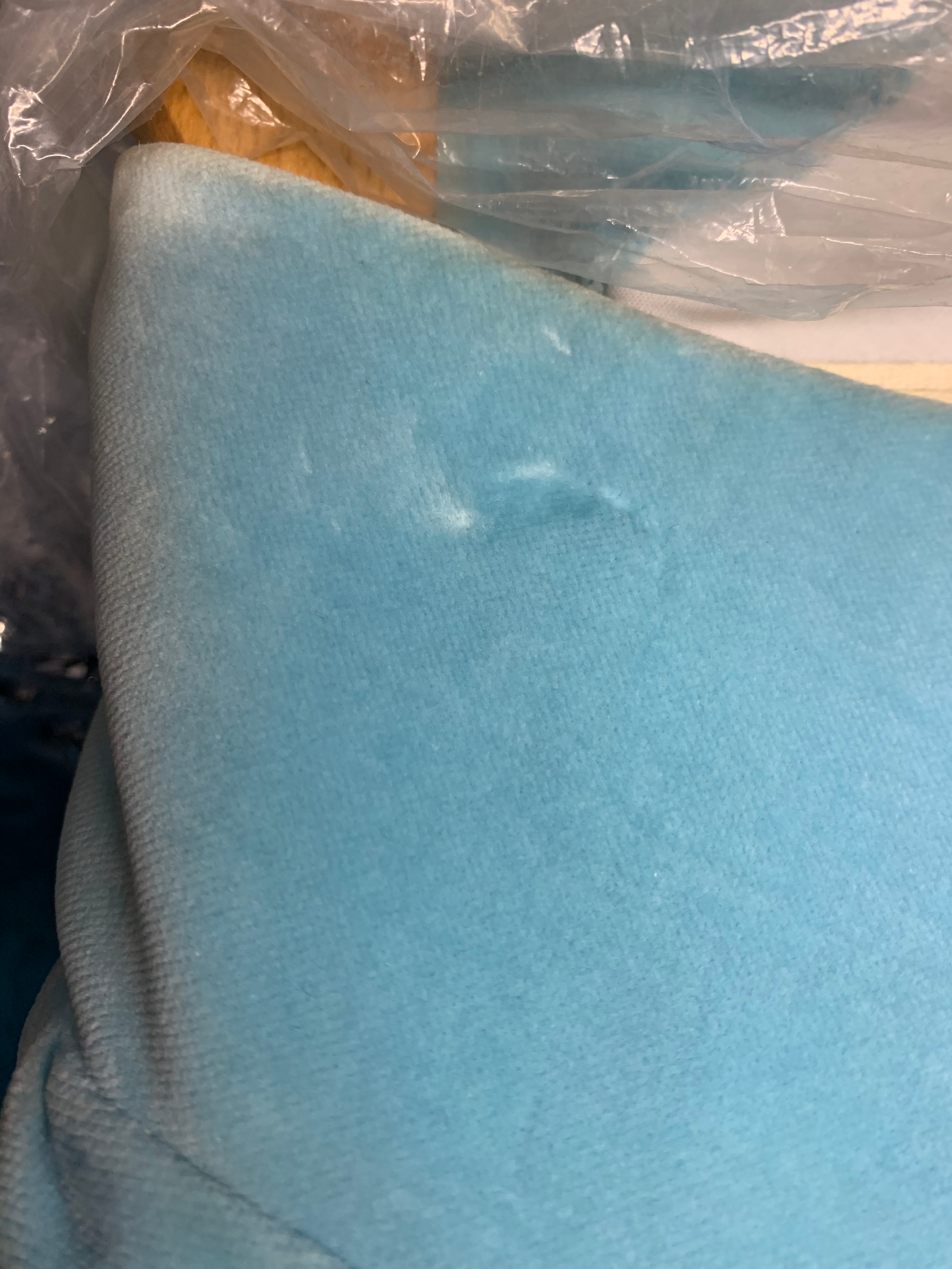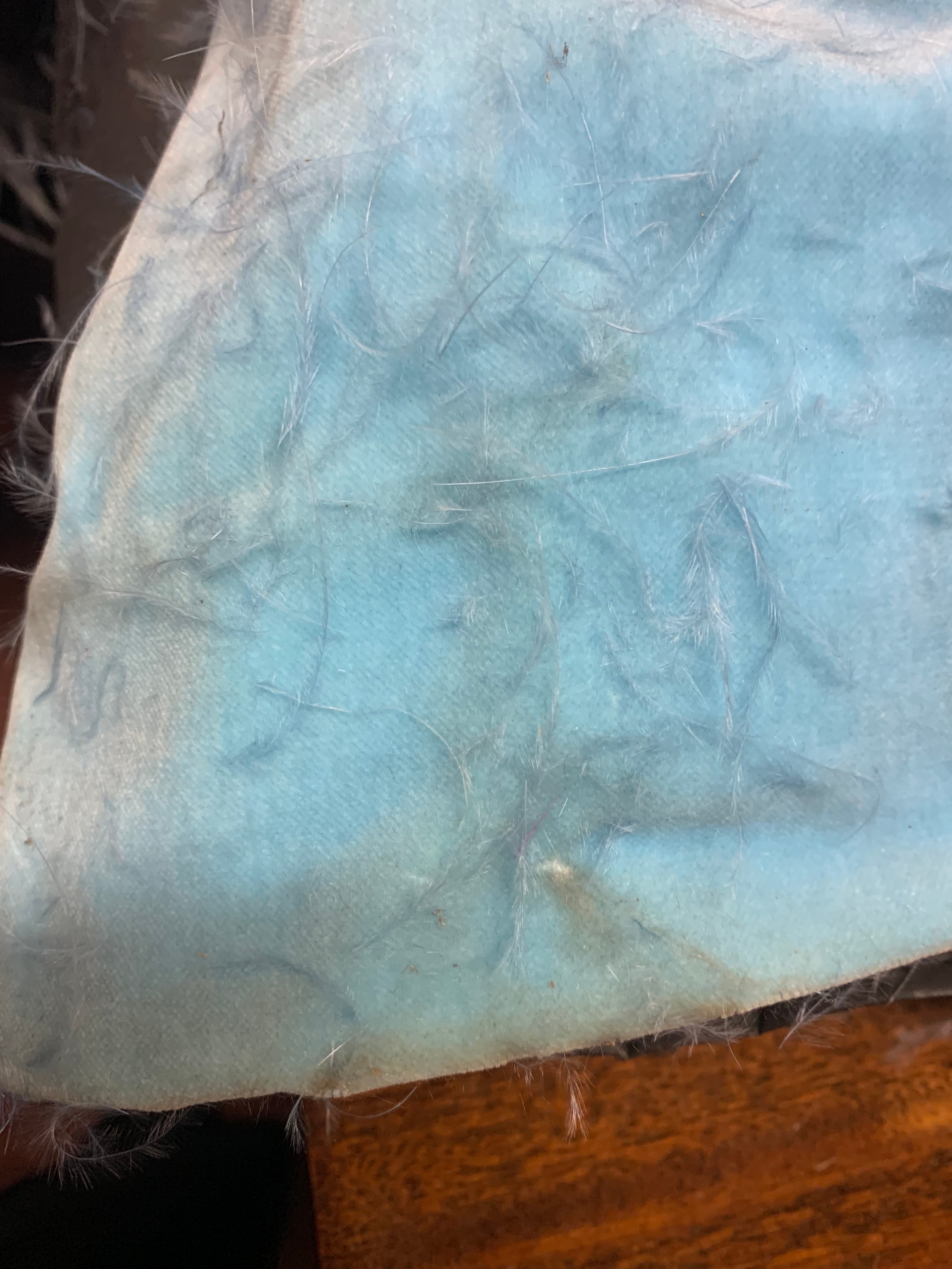 Some marks visible to velvet, some feathers loose, staining visible to hem in places, stiffness to zip, good condition in accordance with age and use.