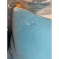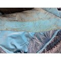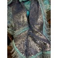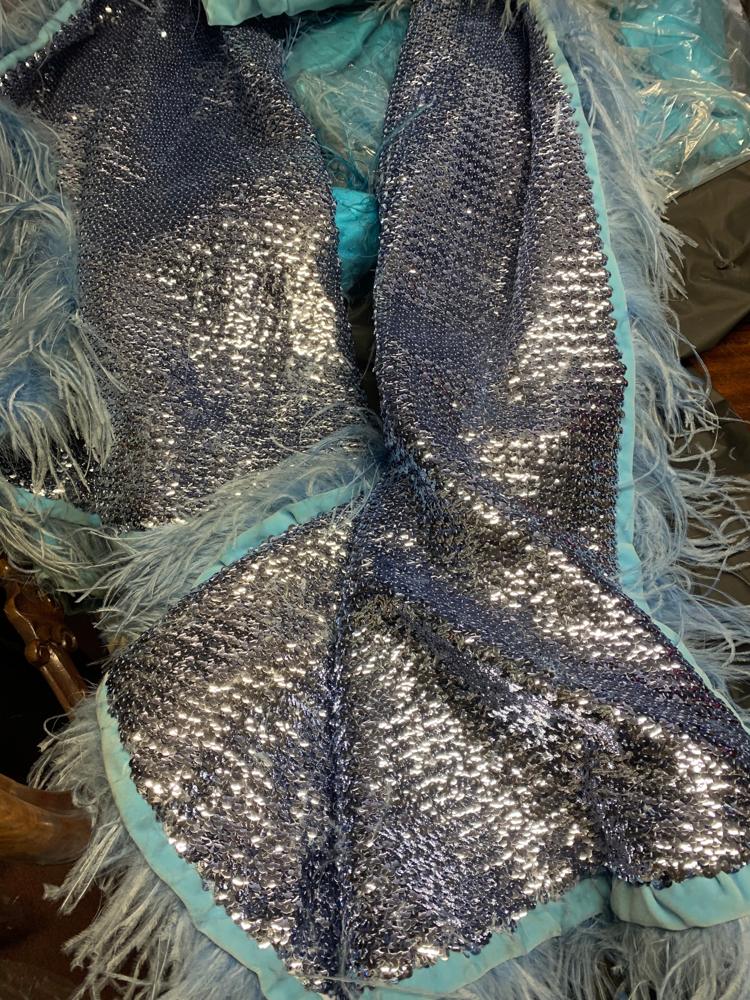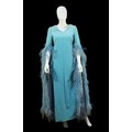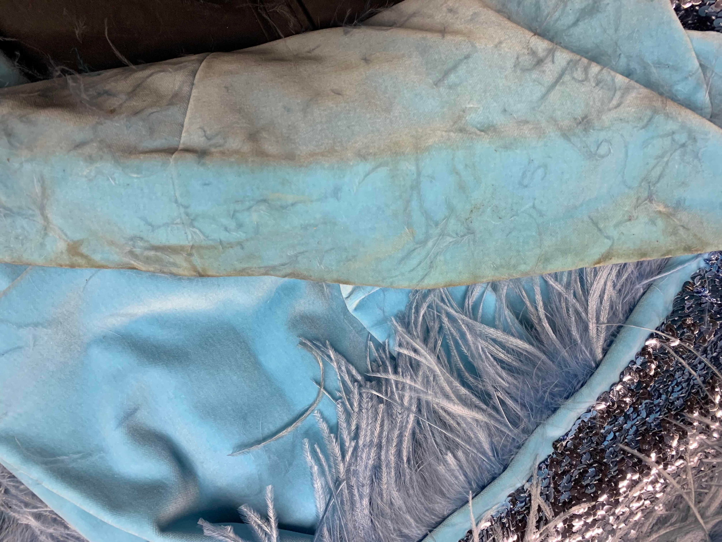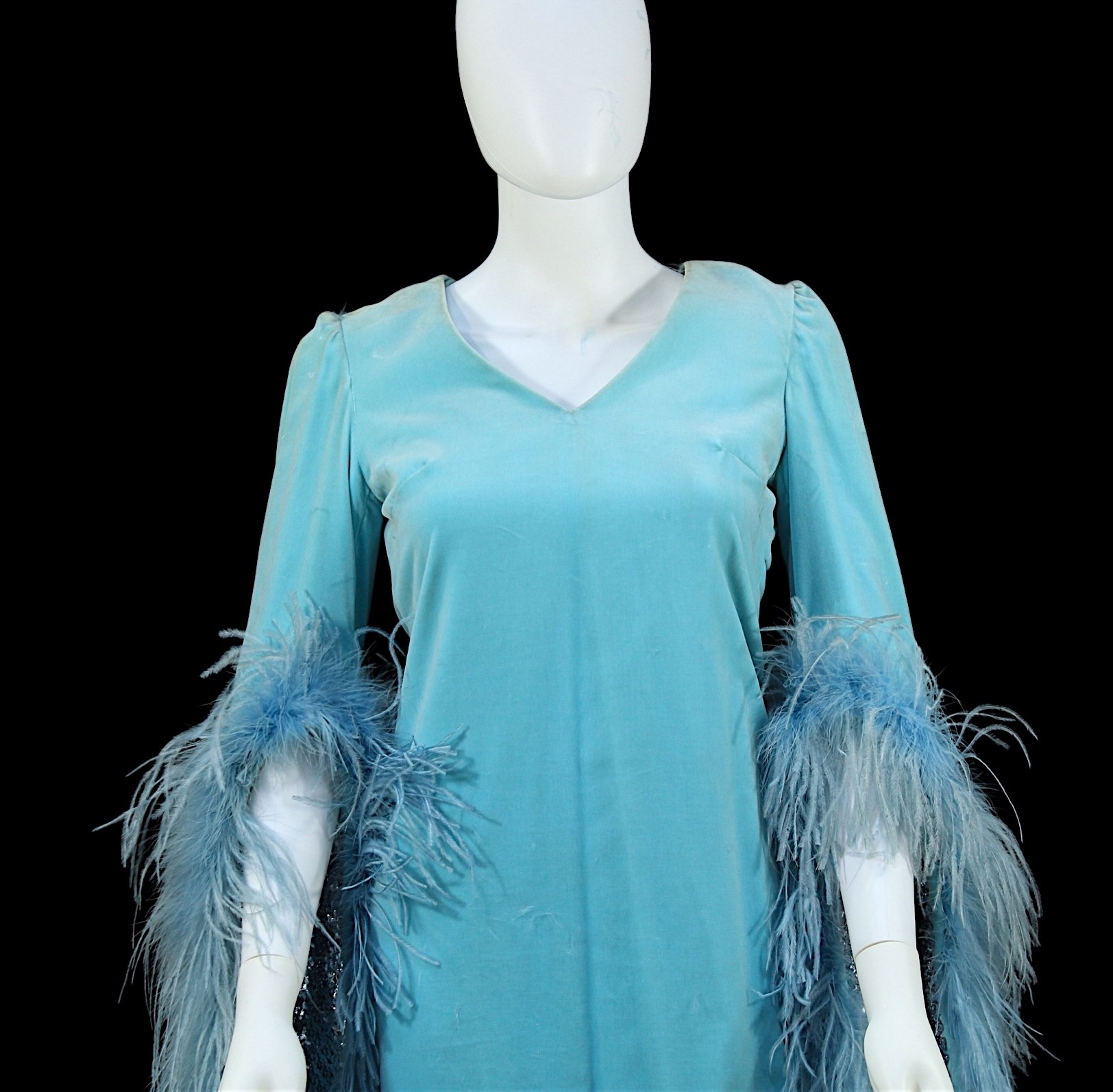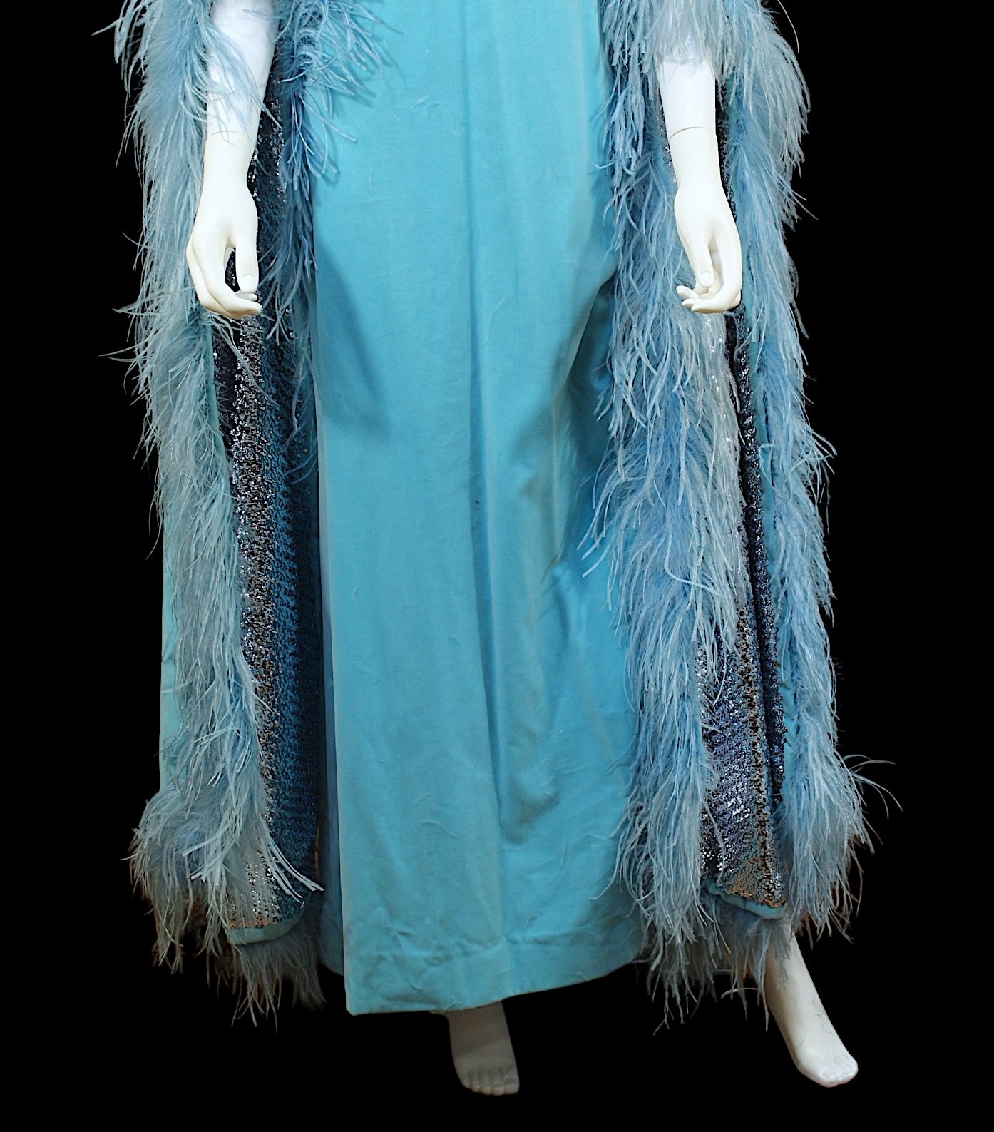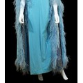 in turquoise velvet, v-neck, with full length sleeves trimmed with ostrich feather, opened seam to reveal blue sequin inner,