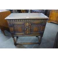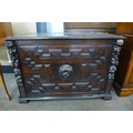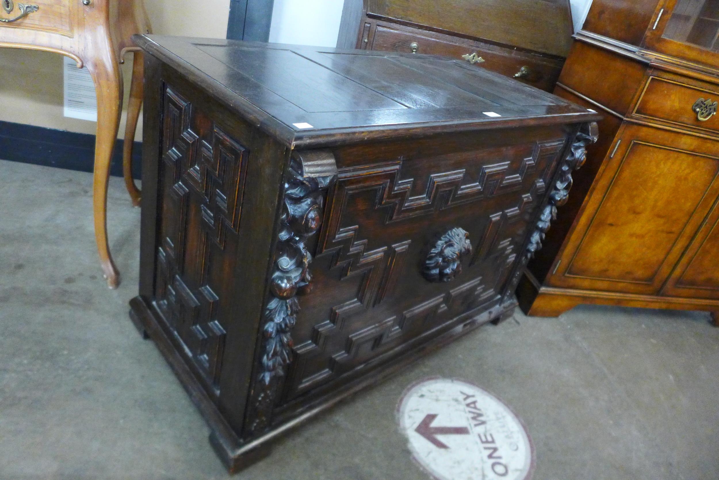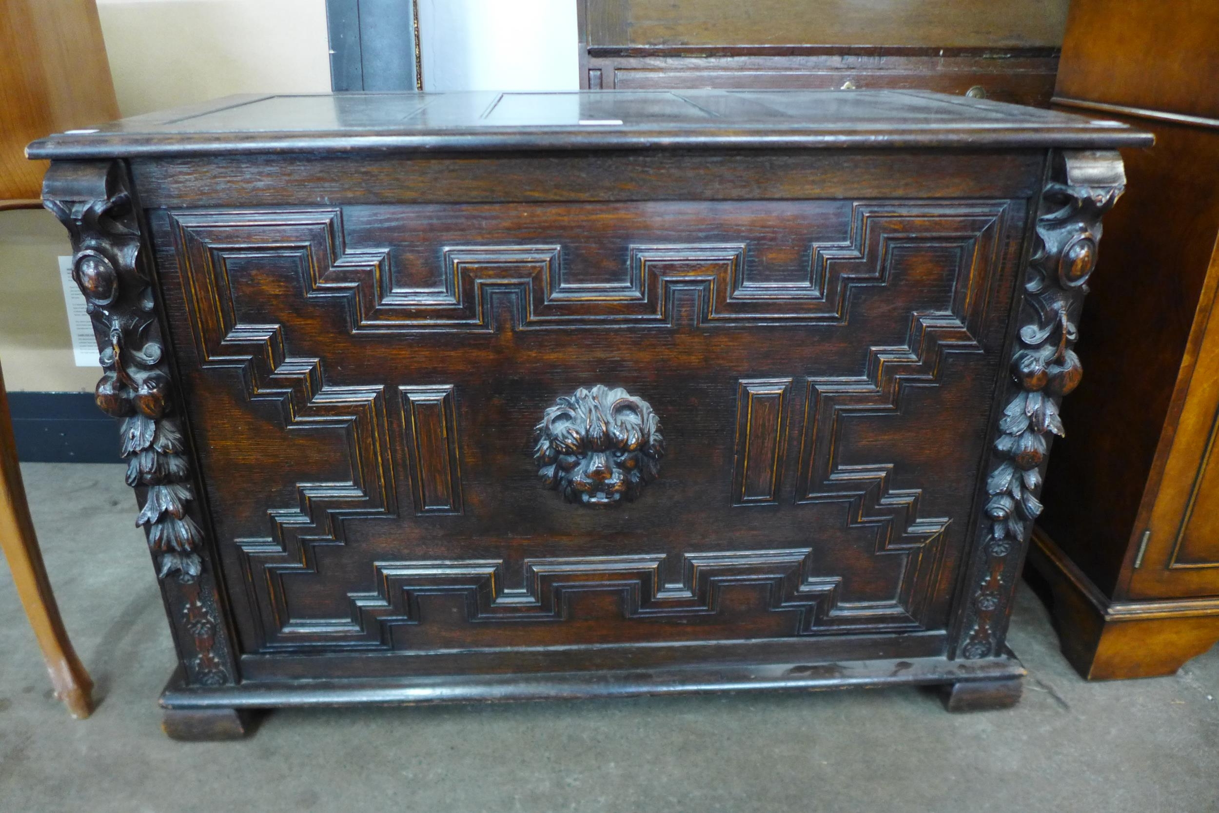 A Jacobean Revival carved oak geometric moulded coffer