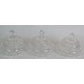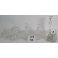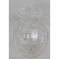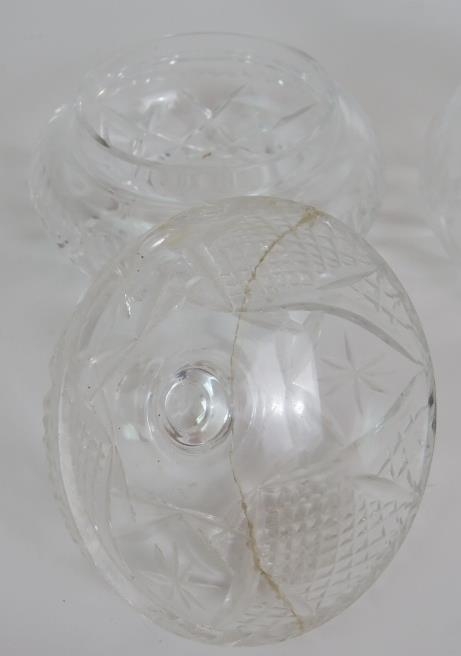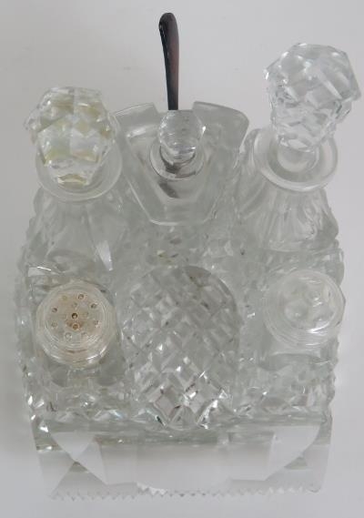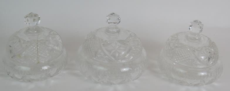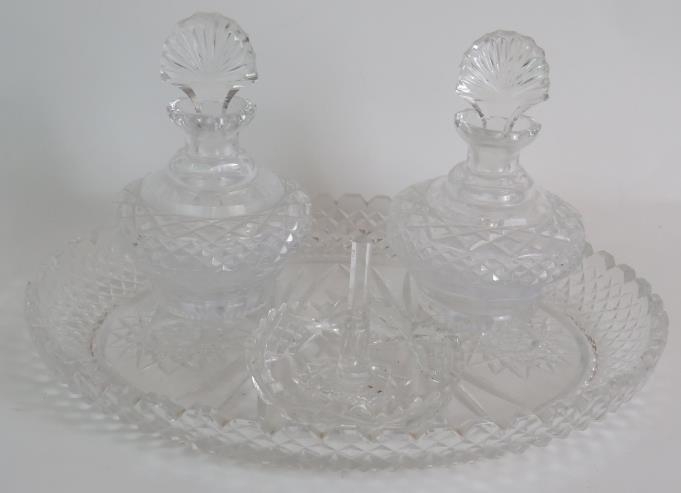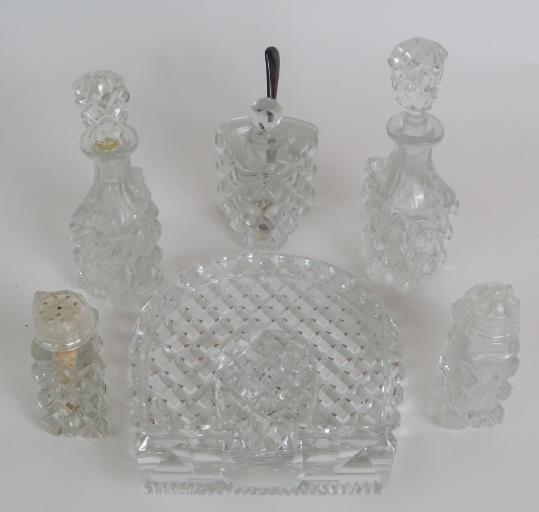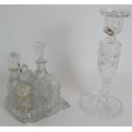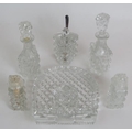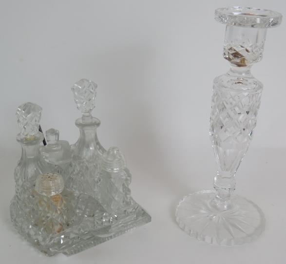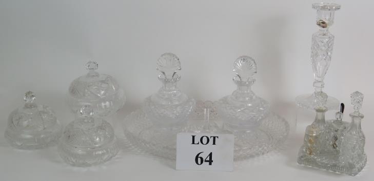A four piece cut crystal dressing table set, three similar covered jars, a cut glass candlestick and an unusual six piece cut glass horseshoe shaped condiment set. (9).