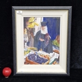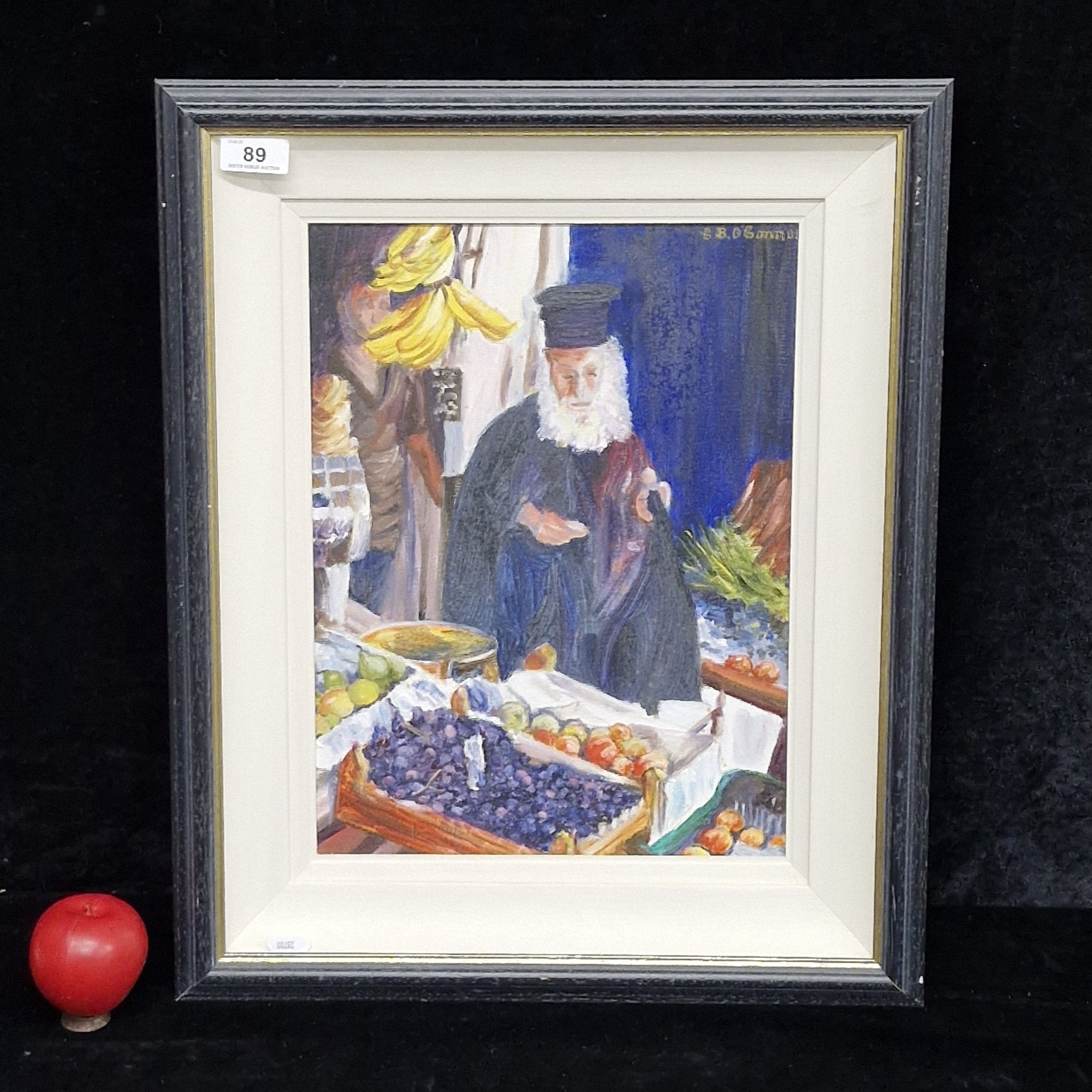 An acrylic on canvas board painting titled 'At The Market (Turkey)' dated 'September 1995'. Features a man at a fruit stall. Rendered in confident and layered brushstrokes. Portrays a vibrant pallete with contrasting tones. Signed 'G B O'Connor' top right. Titled with artist's details to verso. Housed in a black wooden gilt frame behind glass.