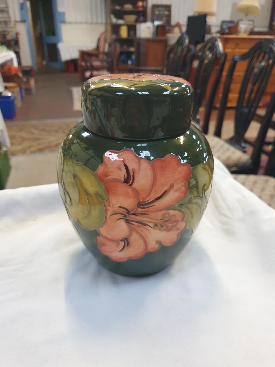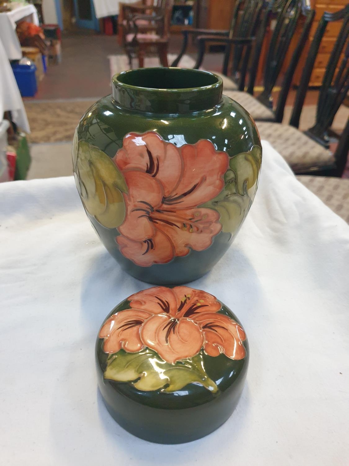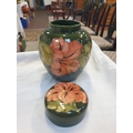 Moorcroft Large Green Ground Coral Hibiscus Ginger Jar and Cover Initialled Walter Moorcroft Height c.16cm (c.6.25”).