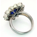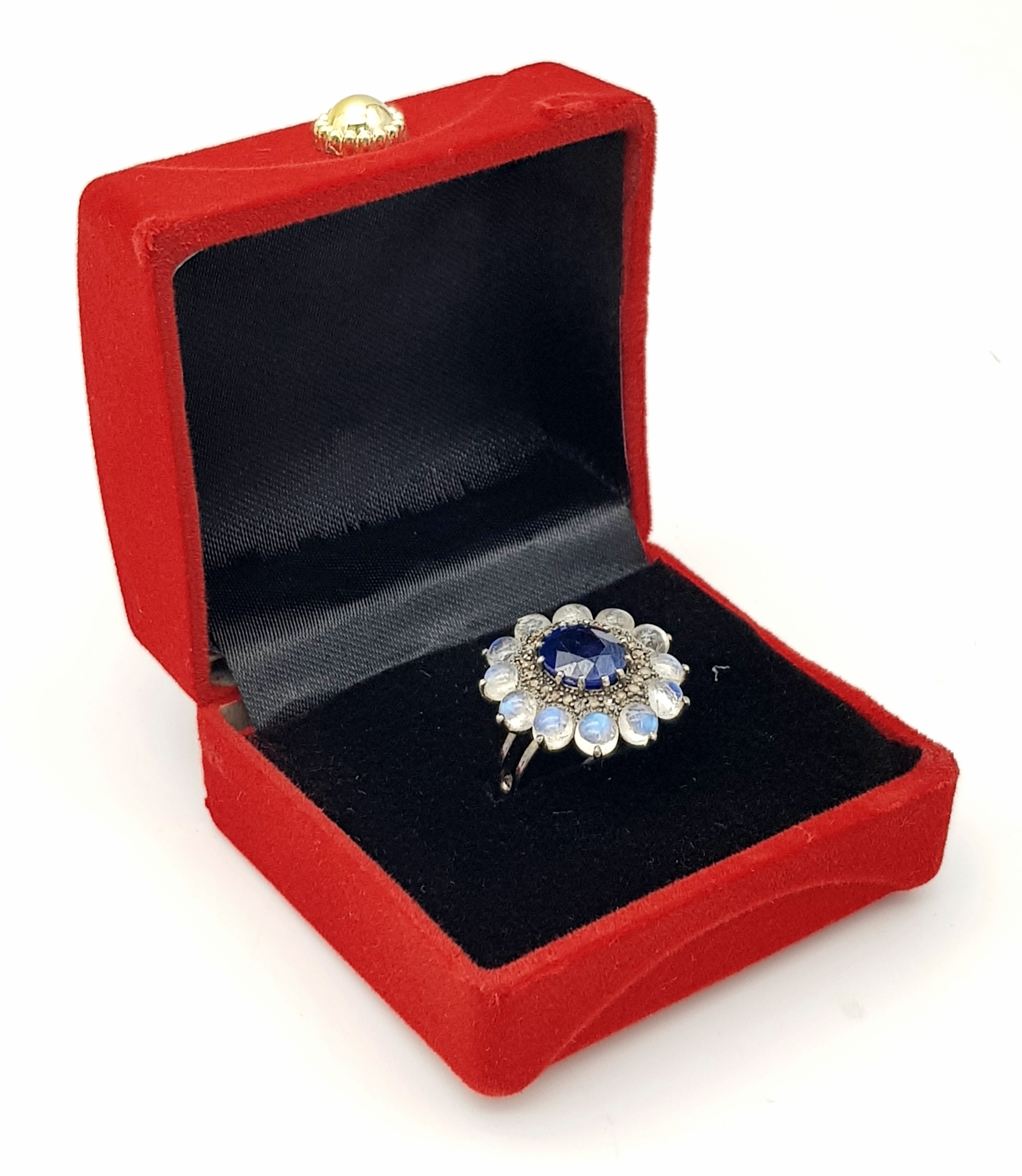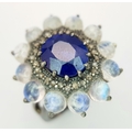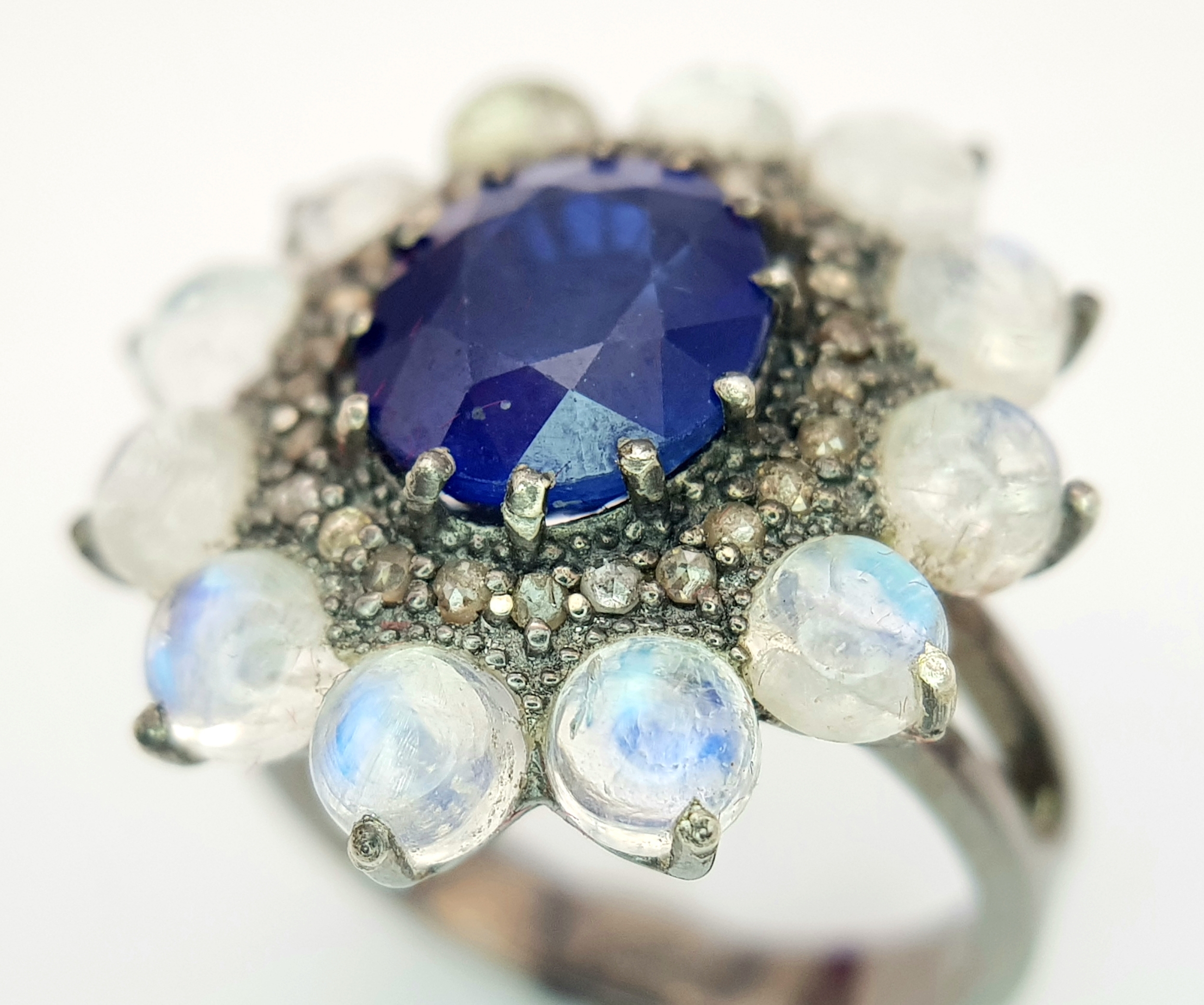 A 2.6ct Blue Sapphire Ring with 3.2ct Moonstone and 0.20ctw of Old Cut Diamond Accents. Set in 925 Silver. Size N 1/2. Comes with a case. CD-1997.