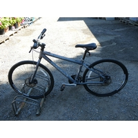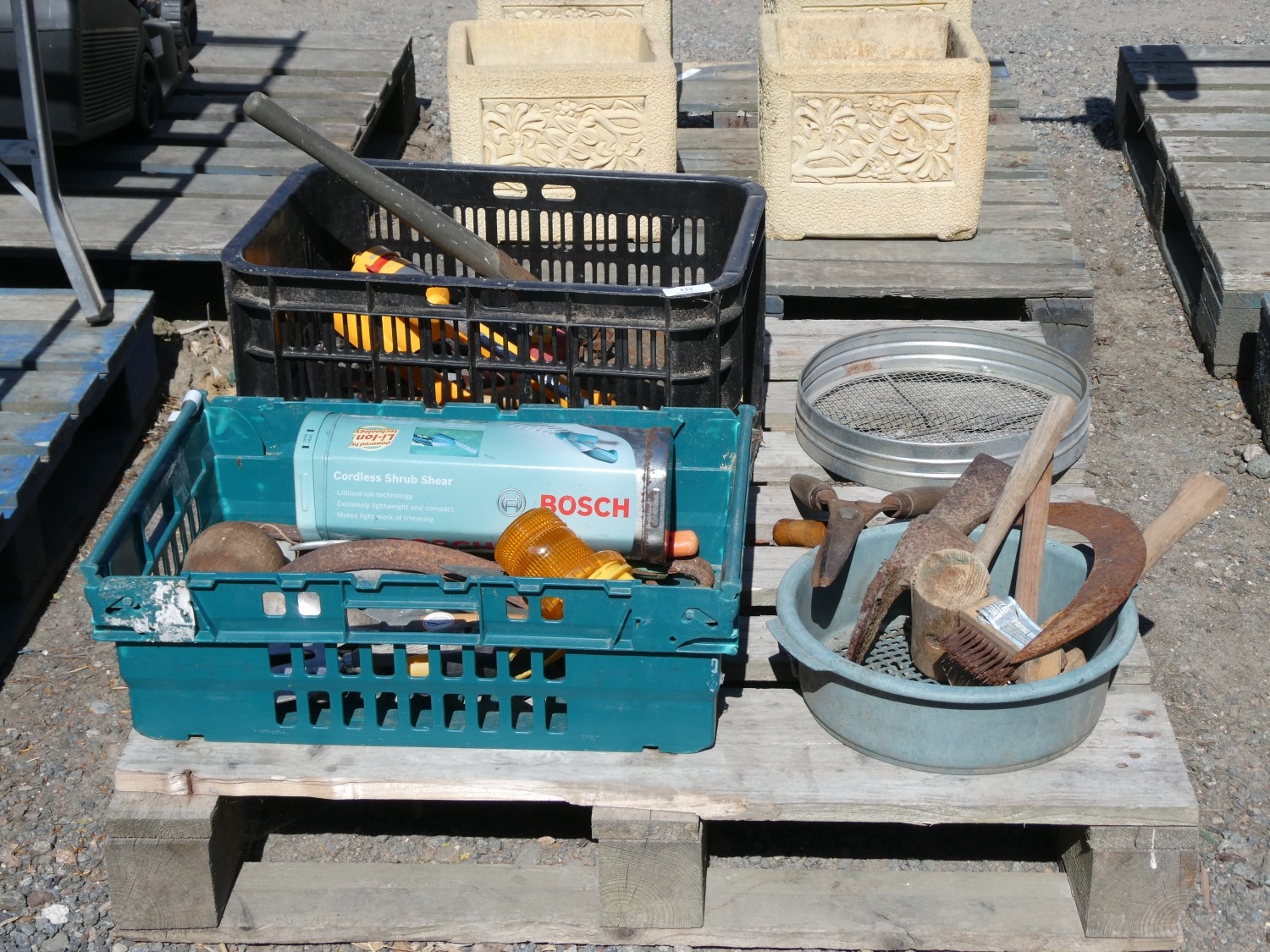 An assortment of hand tools, a garden sprinkler etc.