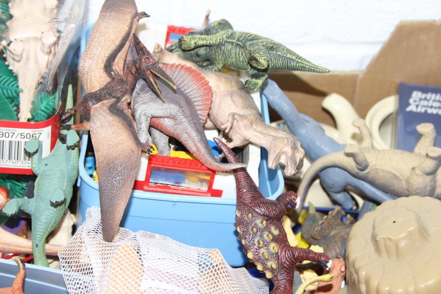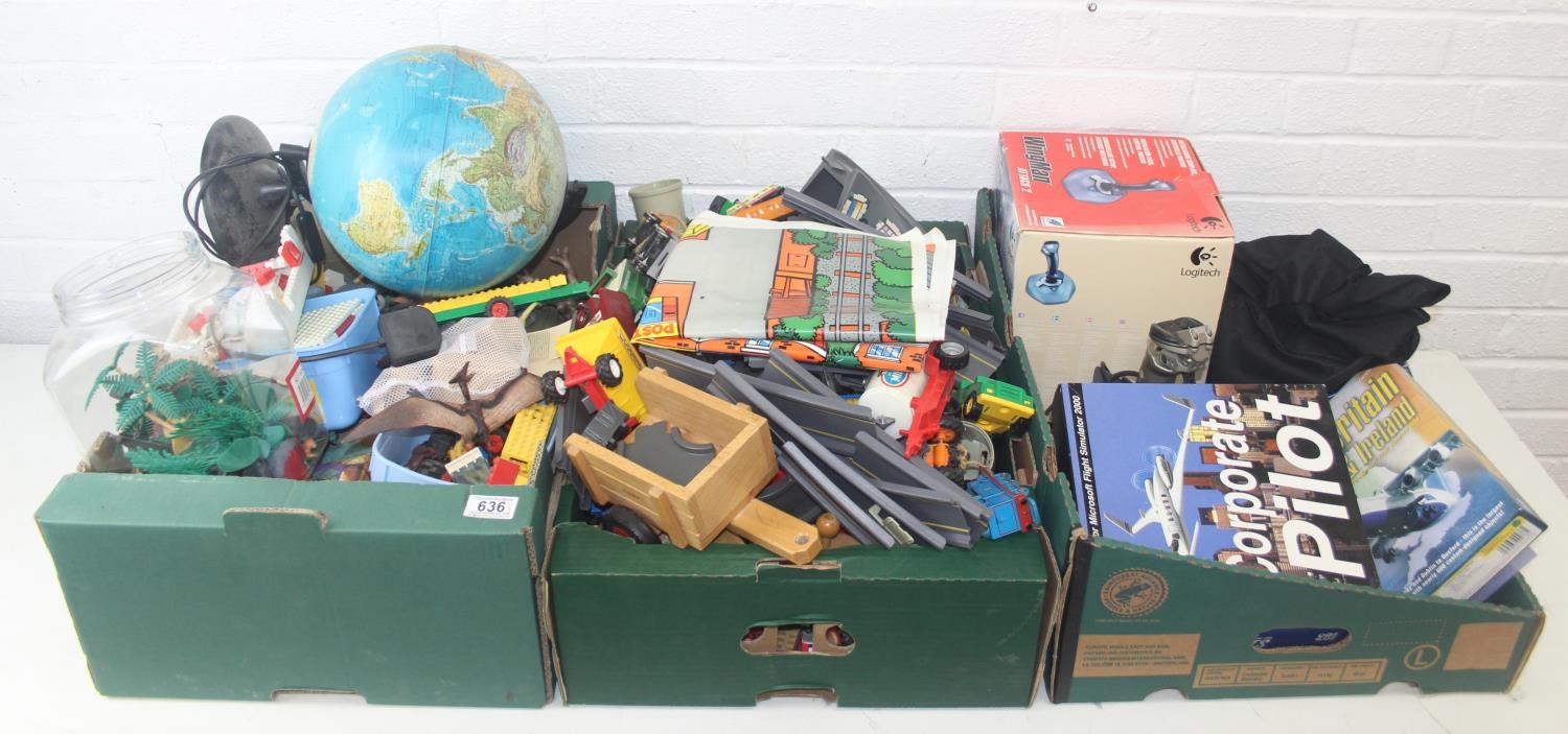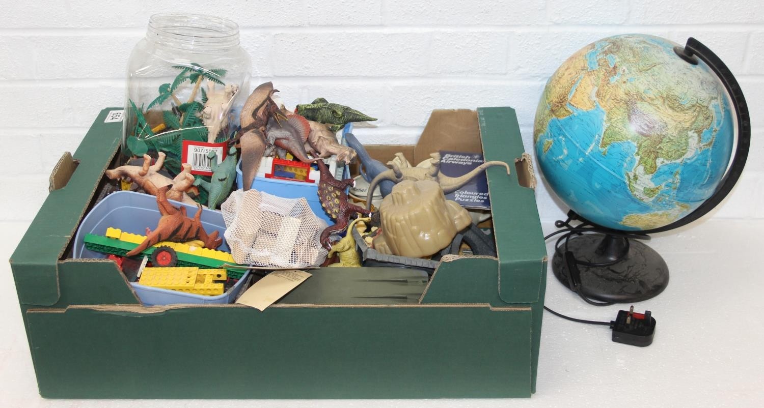 A large qty of assorted mixed toy vehicles and other toys, to inc Thomas the Tank Engine, Matchbox, dinosaurs, vintage light up globe lamp, assorted PC air simulator games, two joysticks and a pair of VR handsets believed to be model CCAM20LP1950T9
