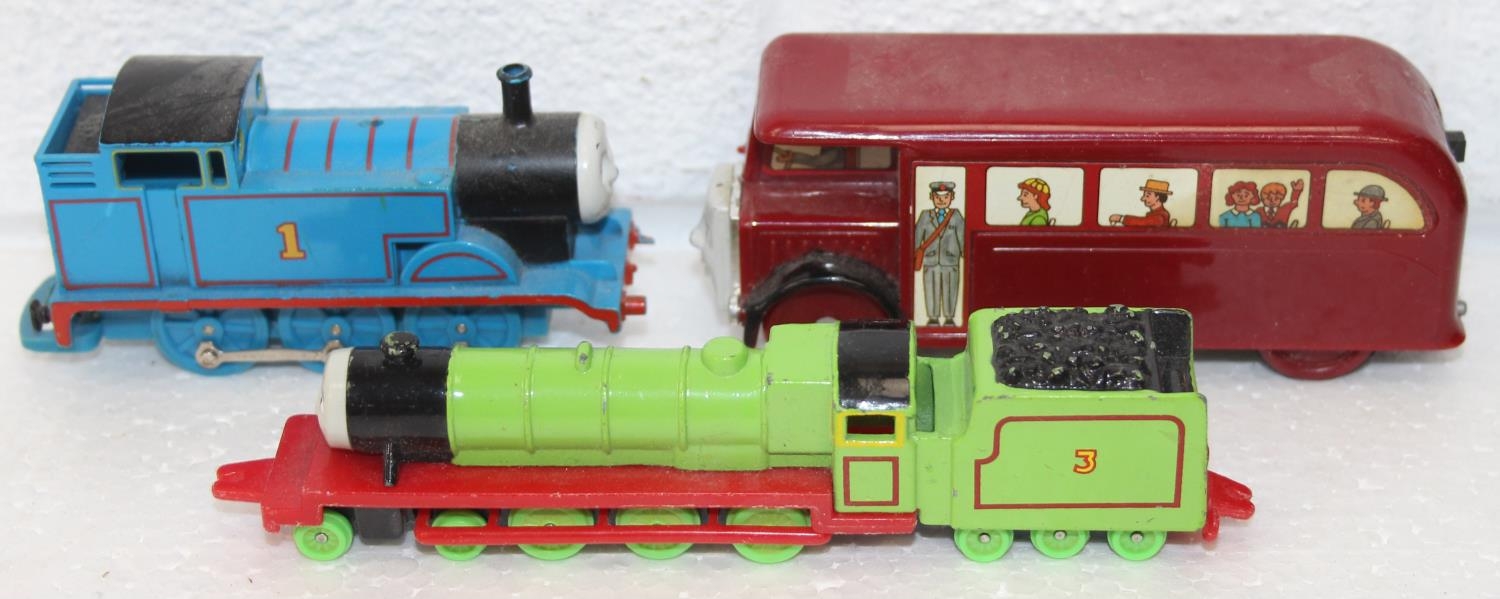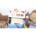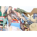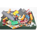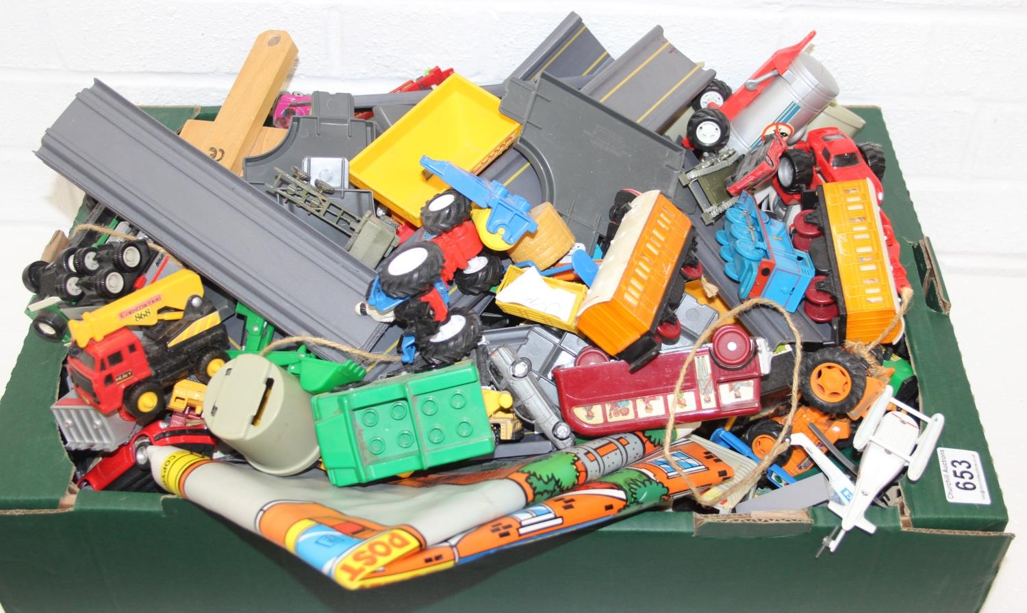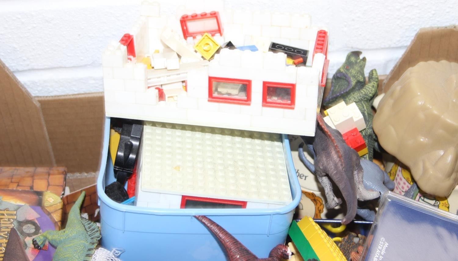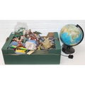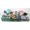 A large qty of assorted mixed toy vehicles and other toys, to inc Thomas the Tank Engine, Matchbox, dinosaurs, vintage light up globe lamp, assorted PC air simulator games, two joysticks and a pair of VR handsets believed to be model CCAM20LP1950T9