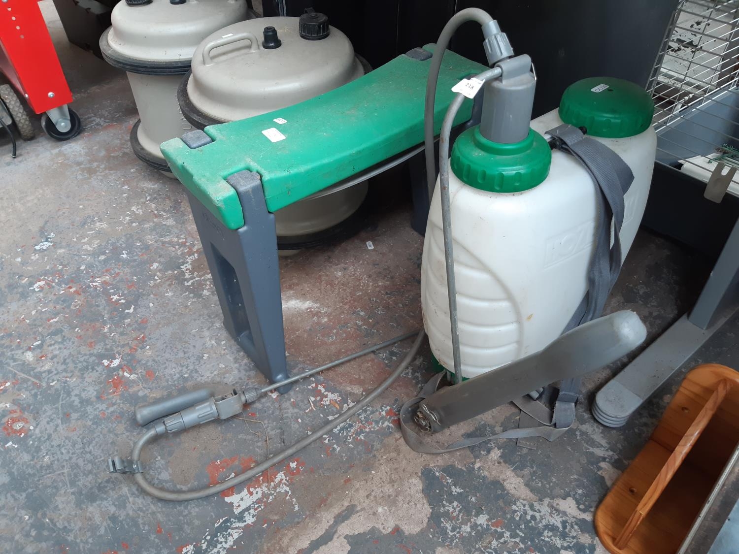 TWO ITEMS TO INCLUDE A HOZELOCK BACKPACK PRESSURE SPRAYER AND A GARDEN KNEELING STOOL