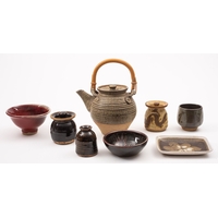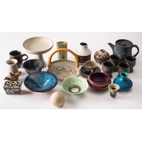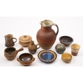A mixed group of stoneware comprising a large Ray Finch jug, impressed personal seal [chipped], three pieces of St. Ives, two Neil Johnson jugs, impressed personal seals, an Ann Whalley bowl, impressed AW, a John Webb box and cover, impressed J.Webb and a Sid Tustin terracotta beaker with personal and Winchcombe pottery seals, Deborah Hopson Wolpe stoneware dish, painted DHM and a Michael Buckland box and cover, incised and impressed marks. 11