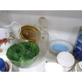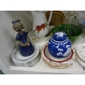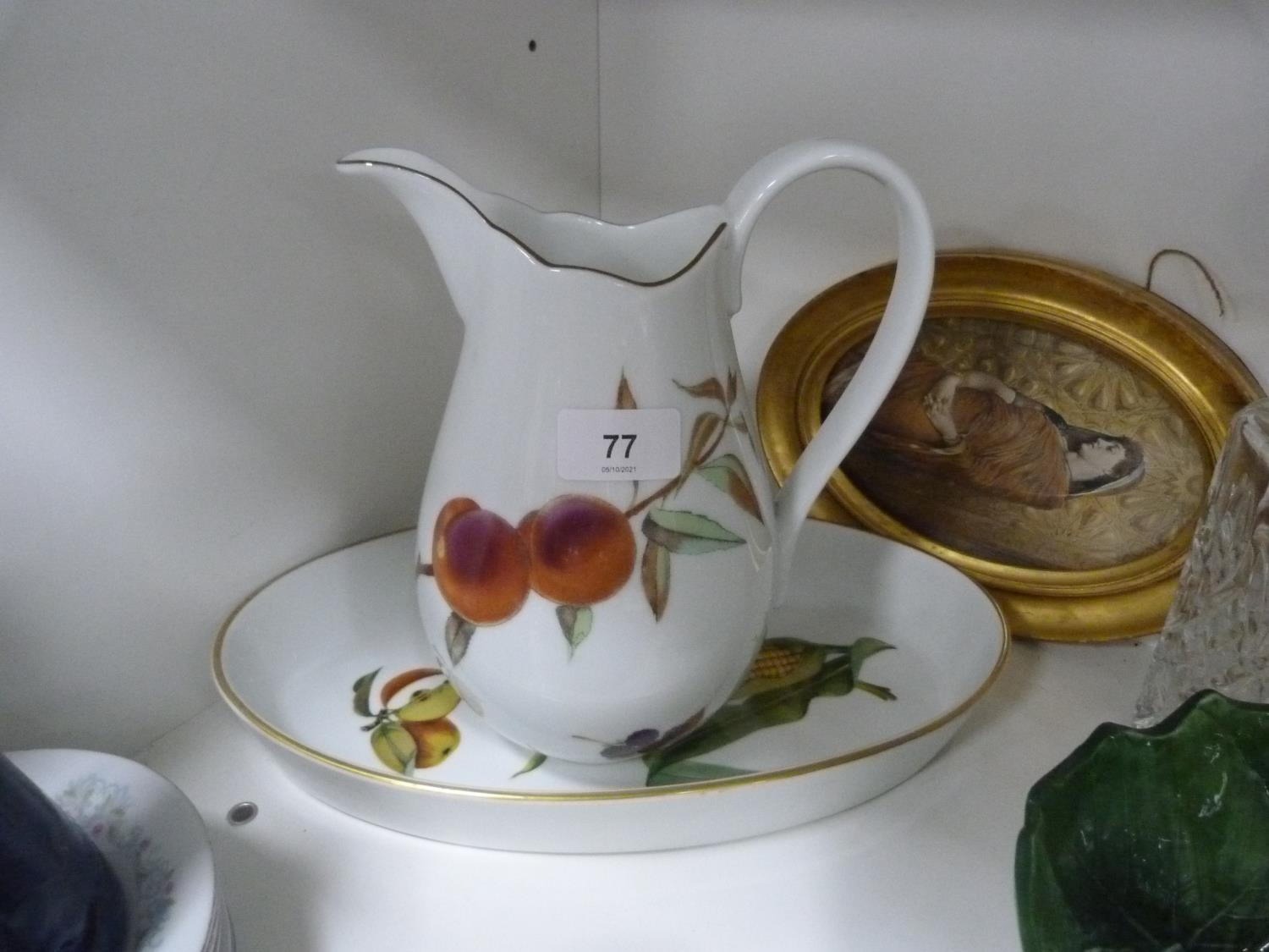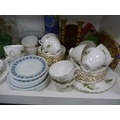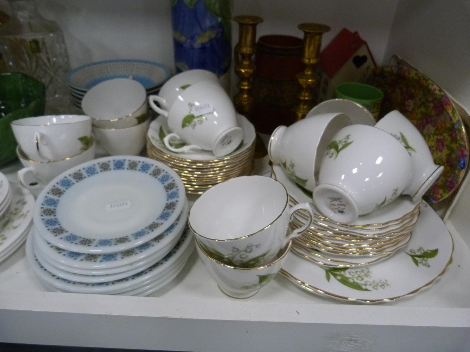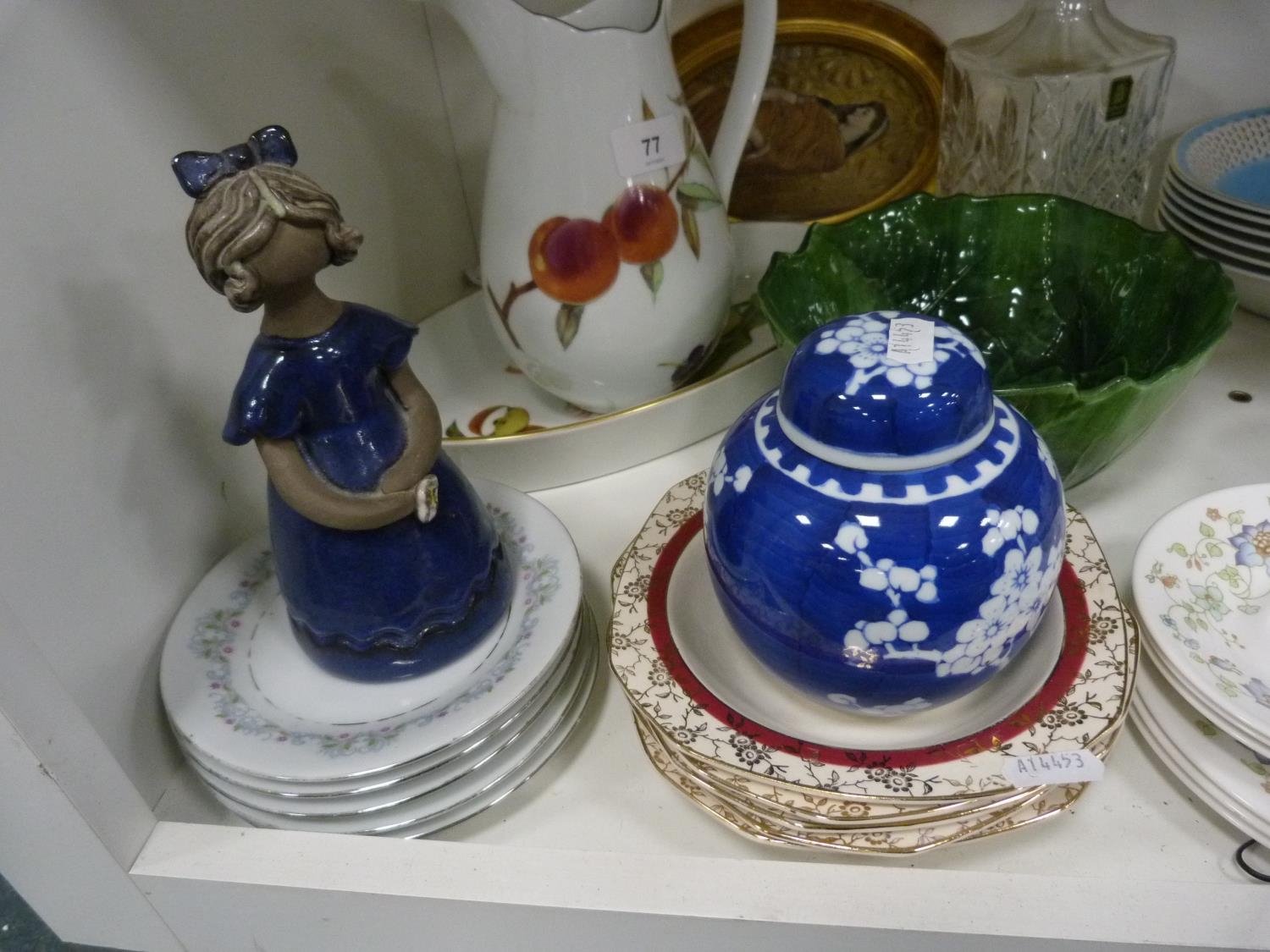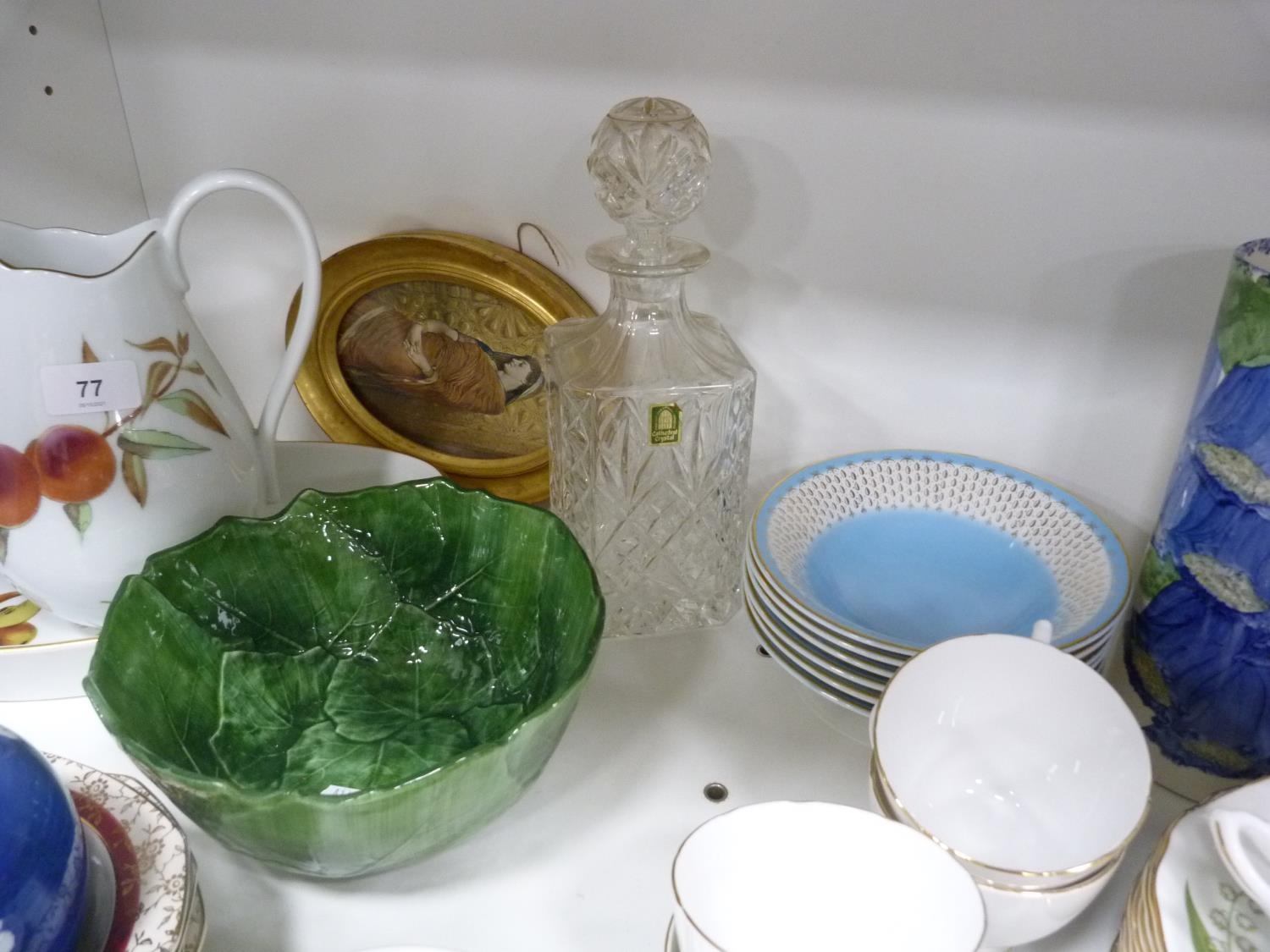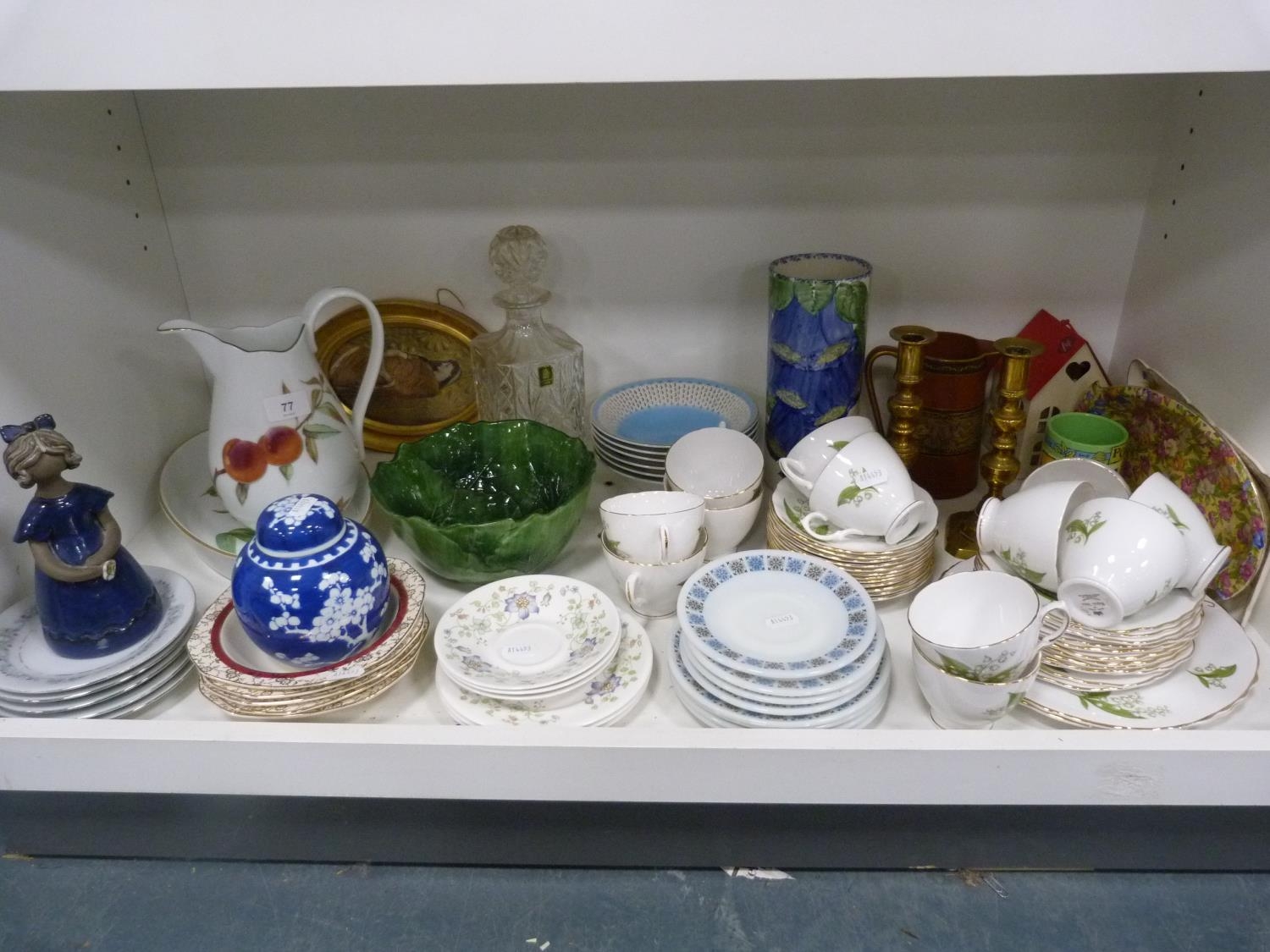 Royal Worcester Evesham pattern vegetable dish, small Chinese prunus decorated ginger jar and cover, pair of brass candlesticks, Royal Winton Chintz dish, part tea sets, signed cylindrical vase with Edinburgh stamp to the base, decanter with stopper etc.