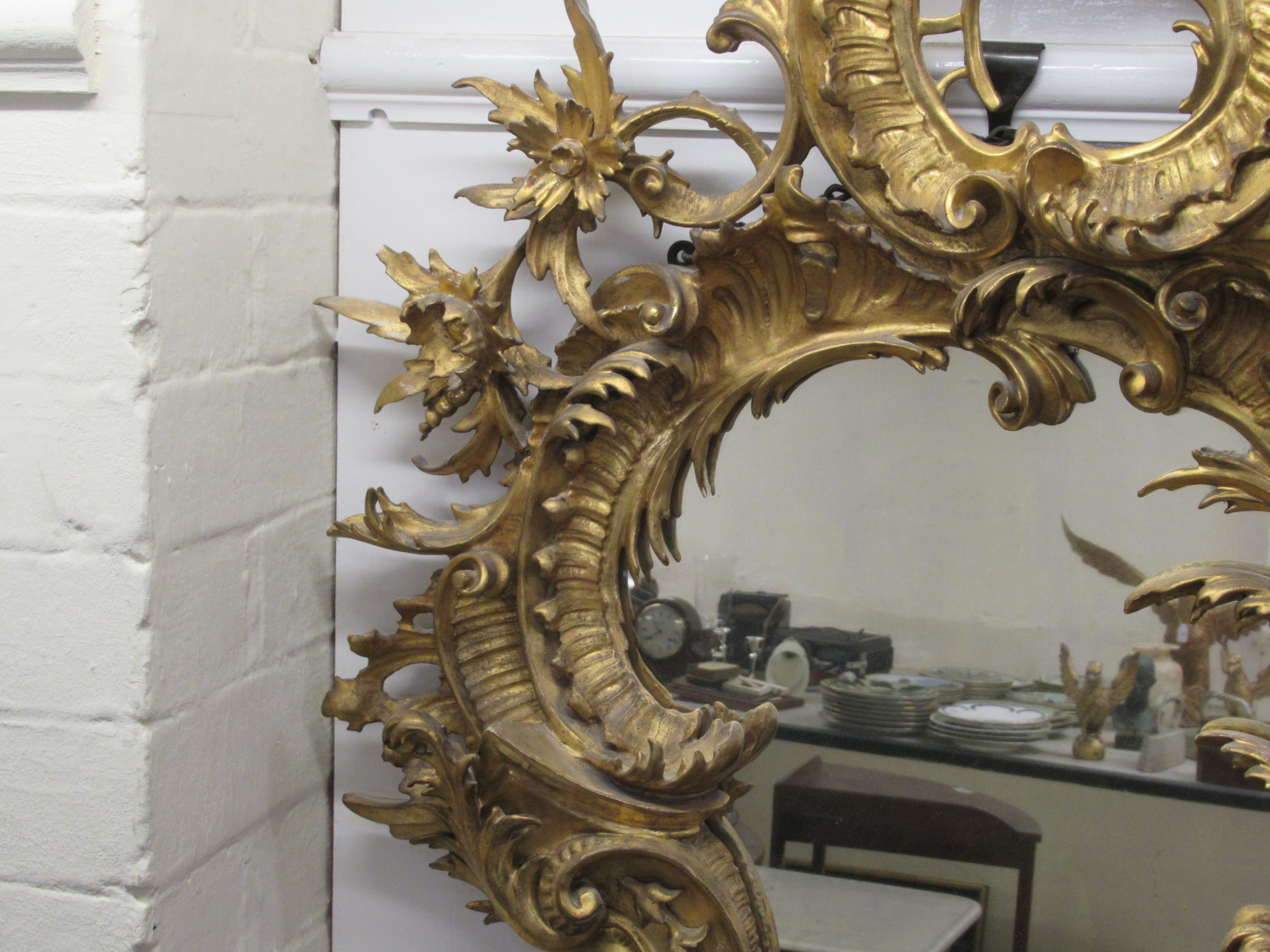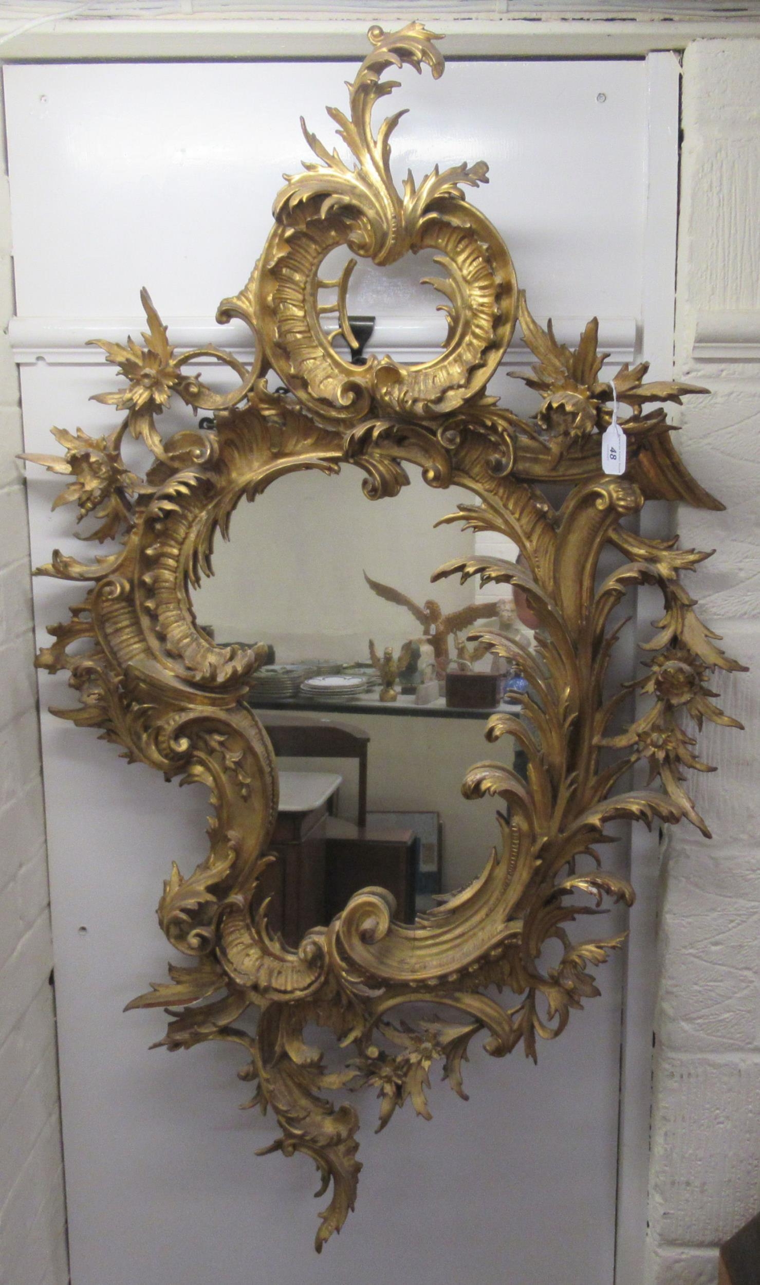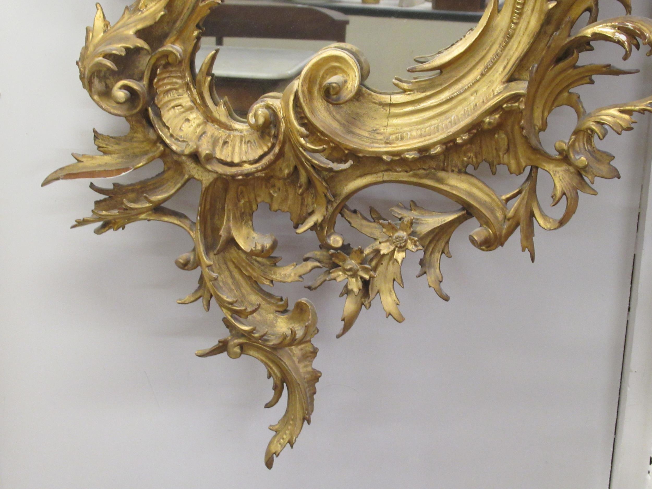 A late 18th/early 19thC mirror, set in a carved giltwood, foliate scrolled and floral, rococo style frame 46"h 27"w