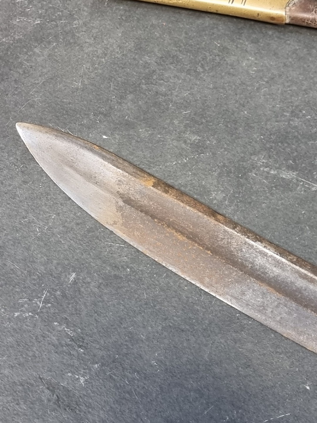 Leather scabbard stitching missing.