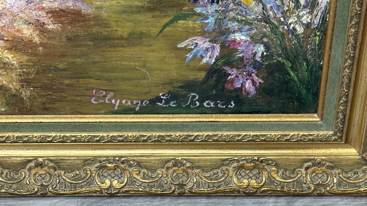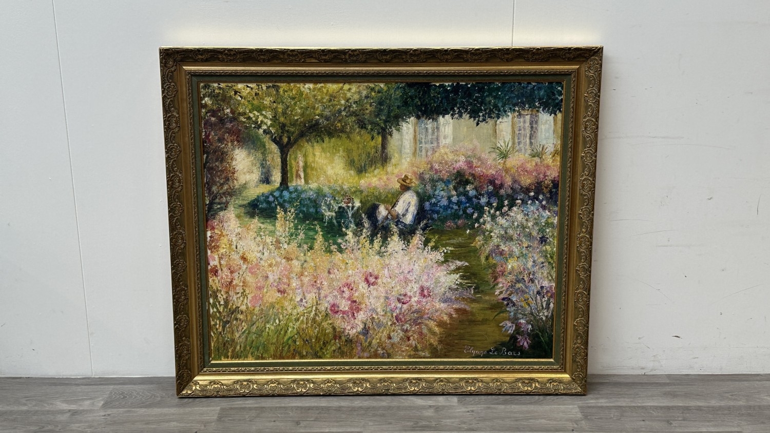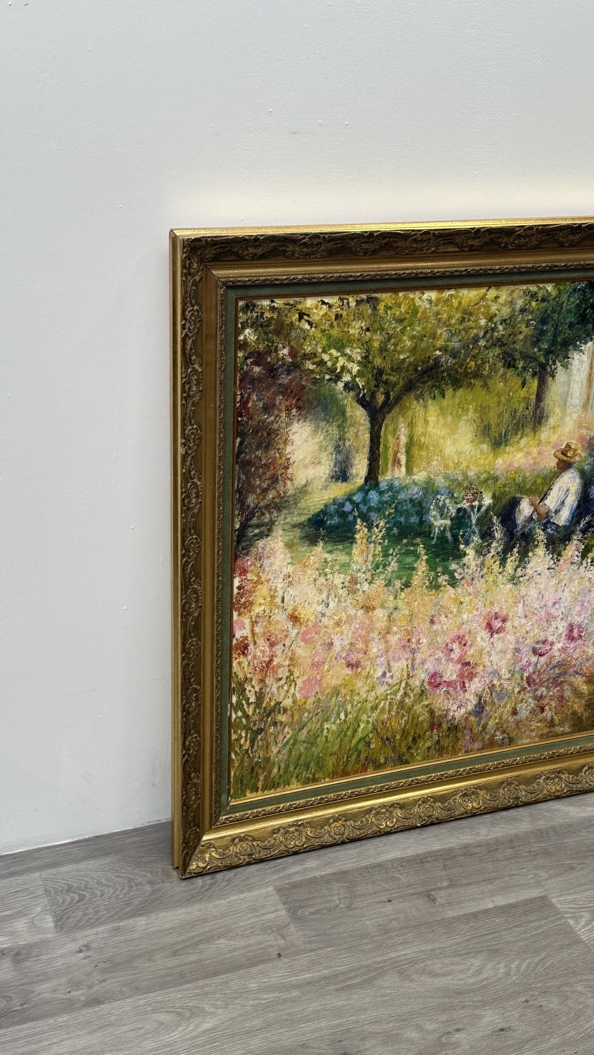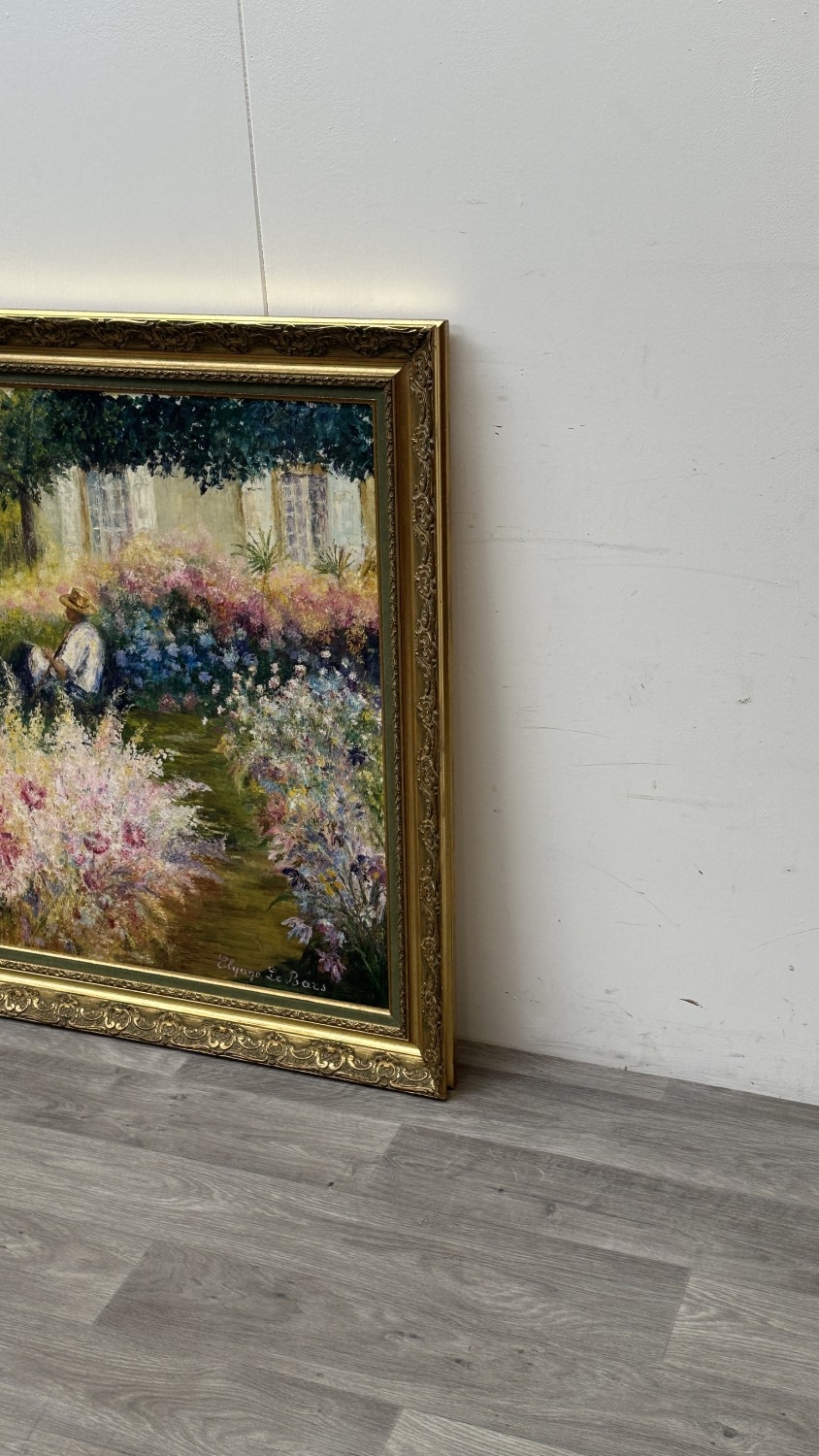 A late 20th century French gilt framed impressionist style oil on canvas depicting a gentleman sat in garden surrounded by flowers, signed lower right Elyane Le Bars - approx. 98cm high x 117cm wide
