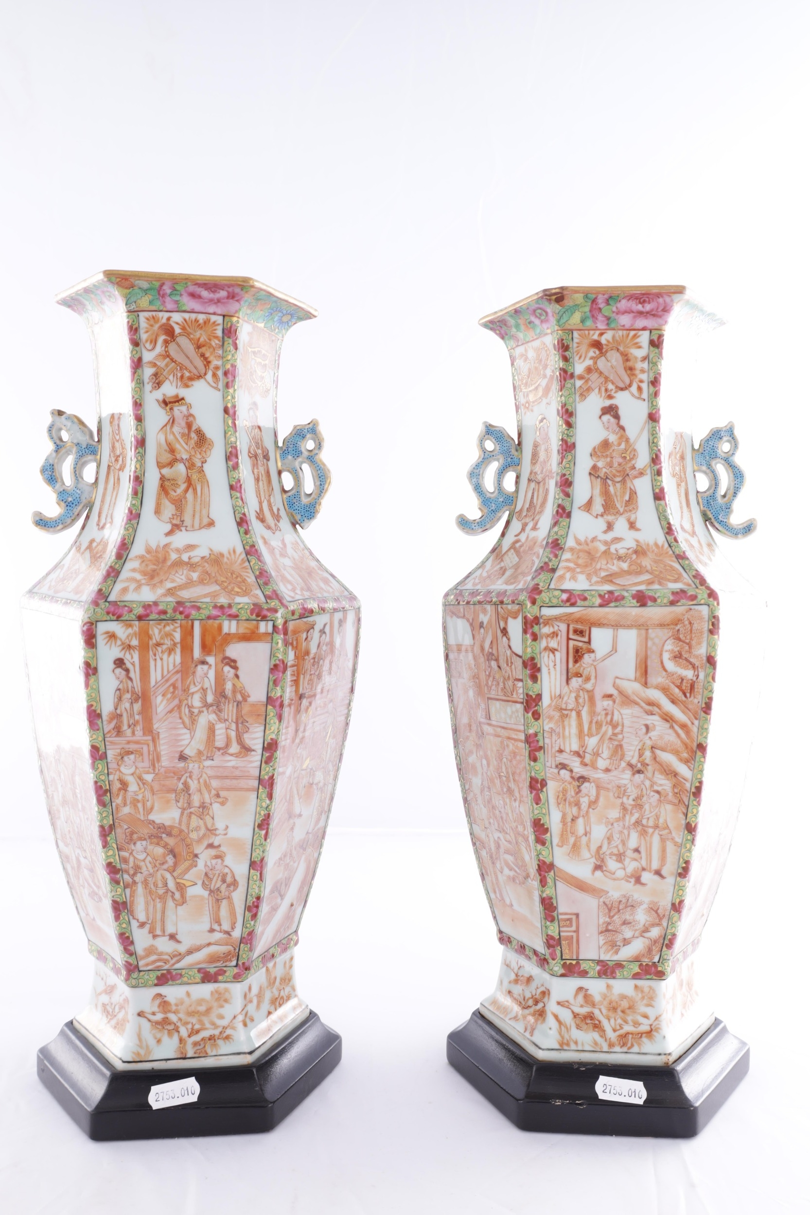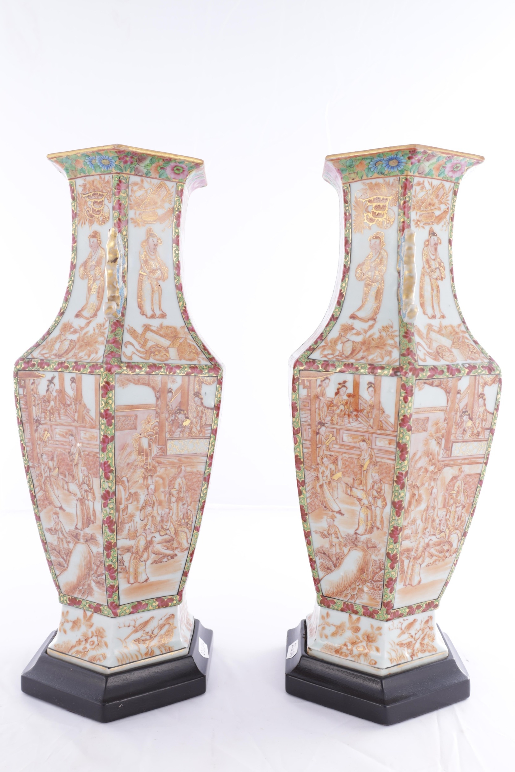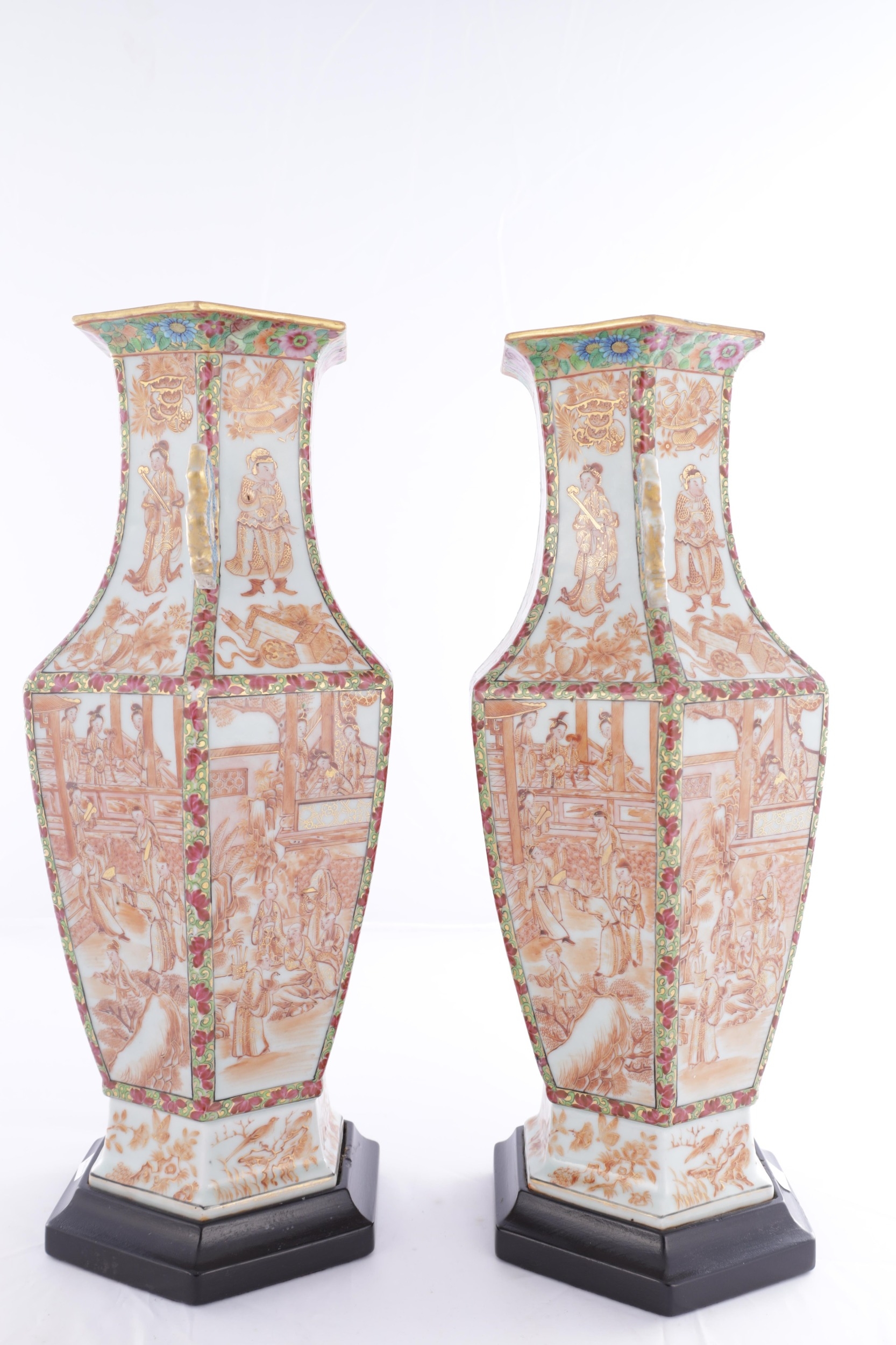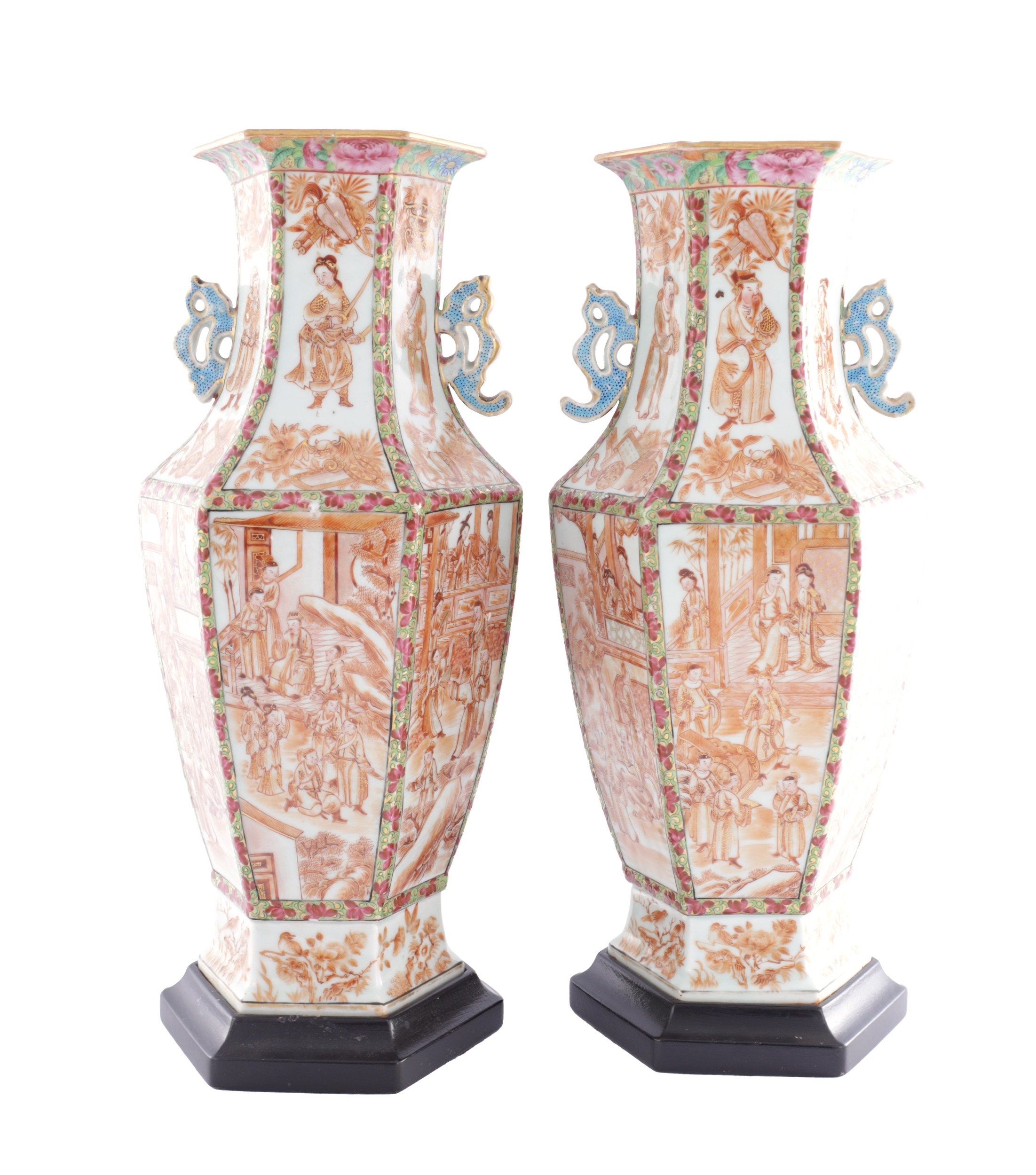 A PAIR OF 18TH CENTURY CANTONESE CHINESE VASES of hexagonal form with shaped side handles, decorated with figural garden scenes - on ebonised wooden bases (44cm high )