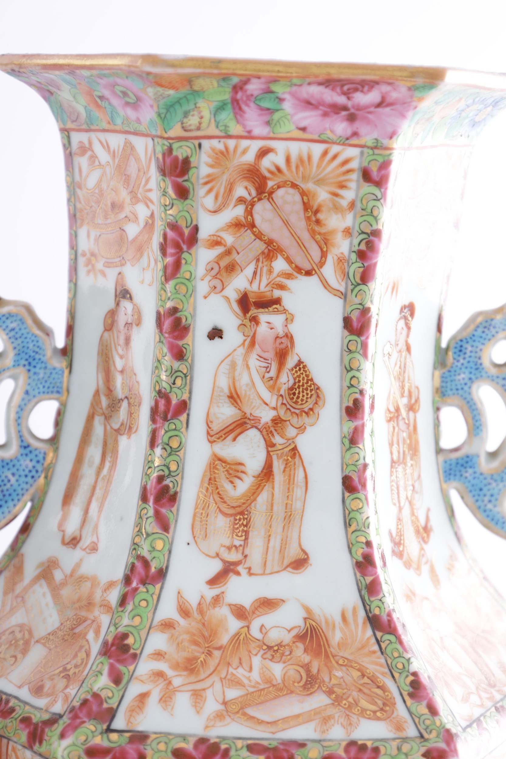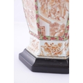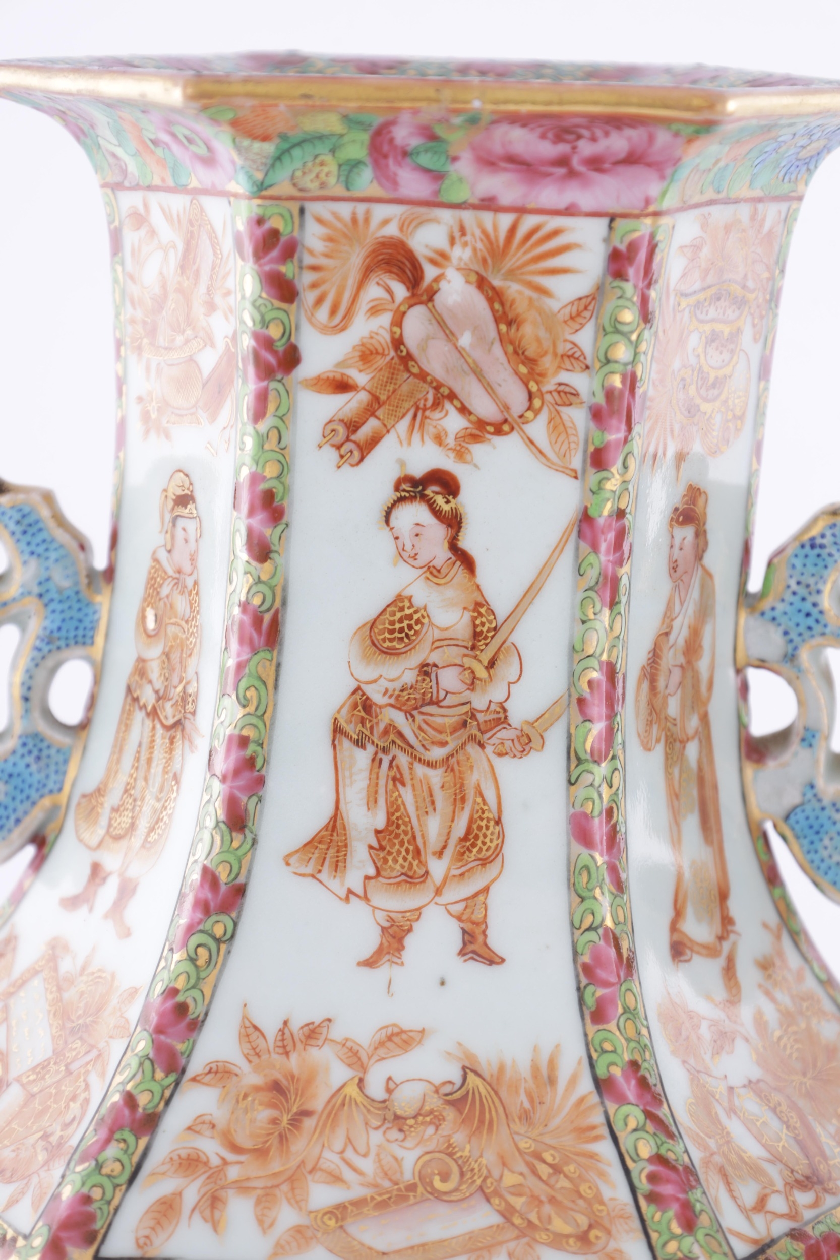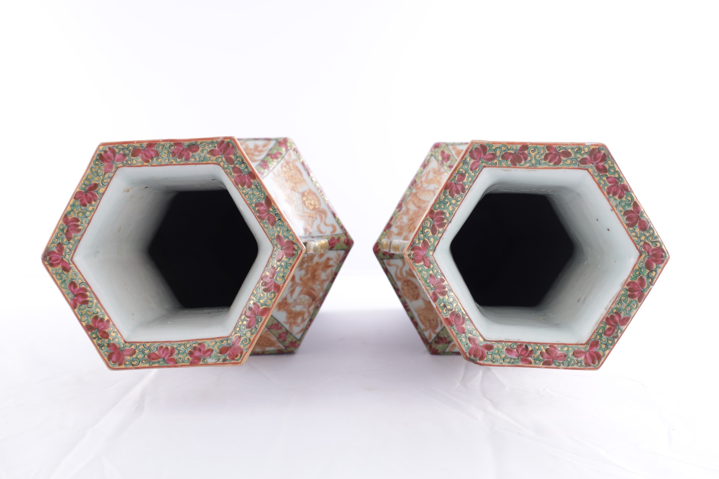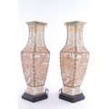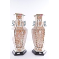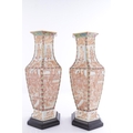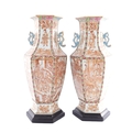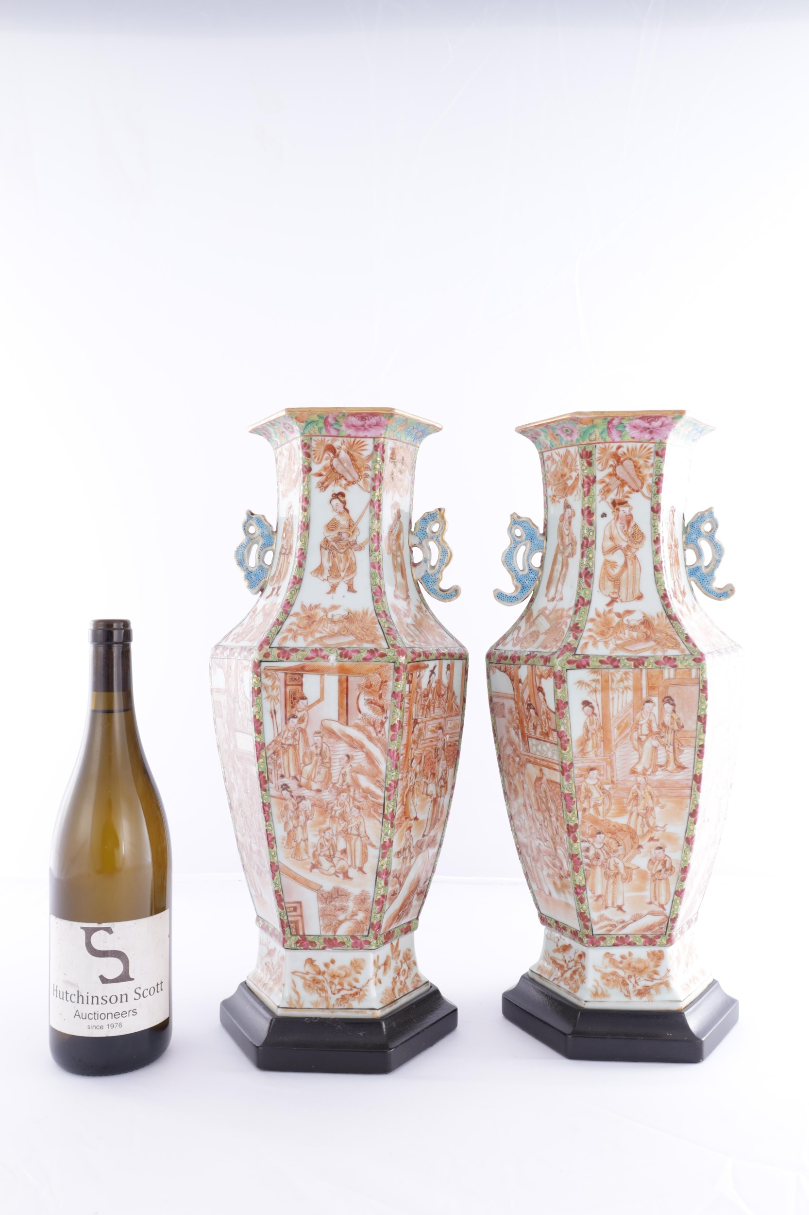 A PAIR OF 18TH CENTURY CANTONESE CHINESE VASES of hexagonal form with shaped side handles, decorated with figural garden scenes - on ebonised wooden bases (44cm high )