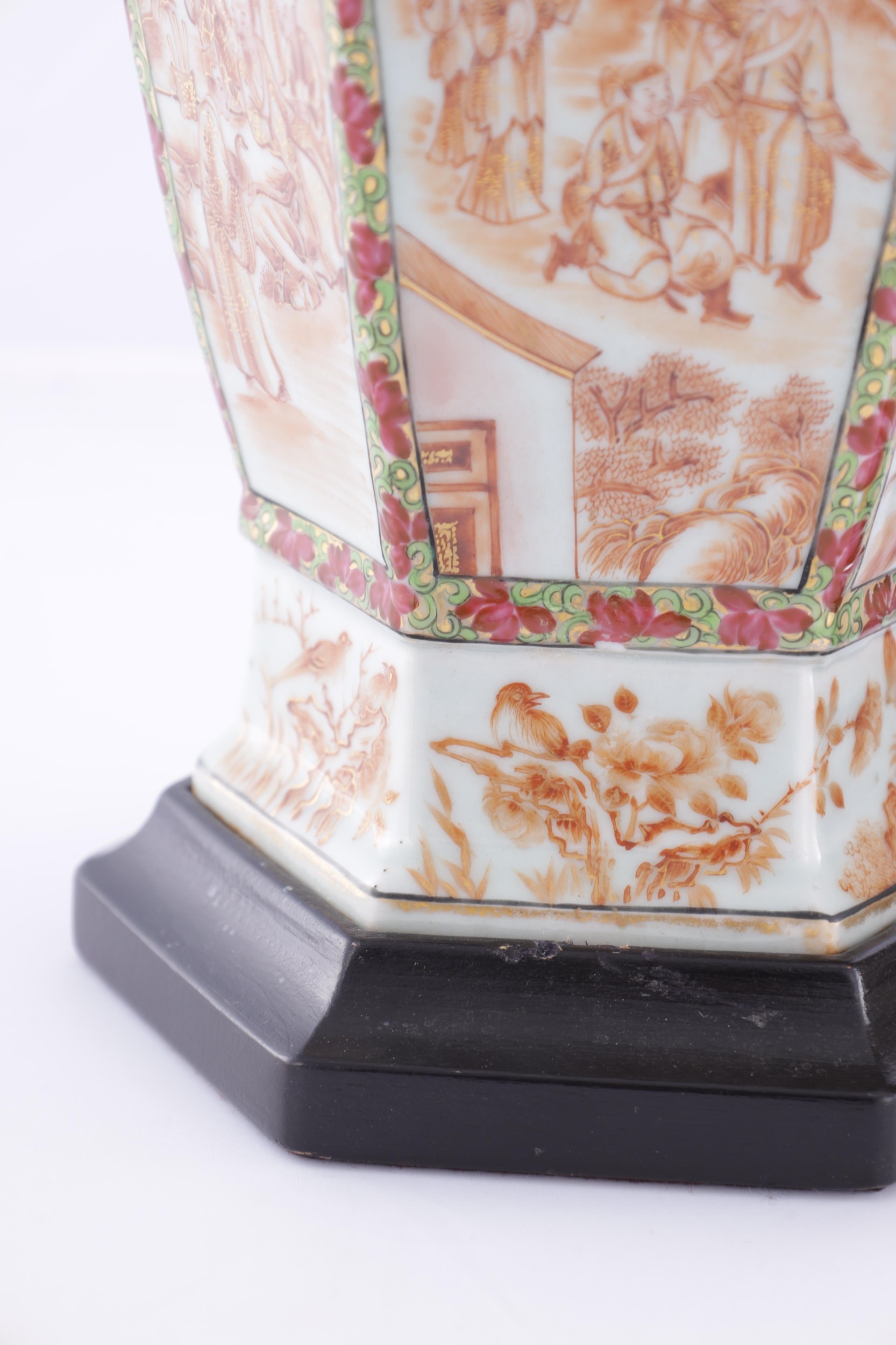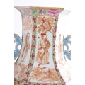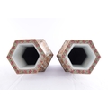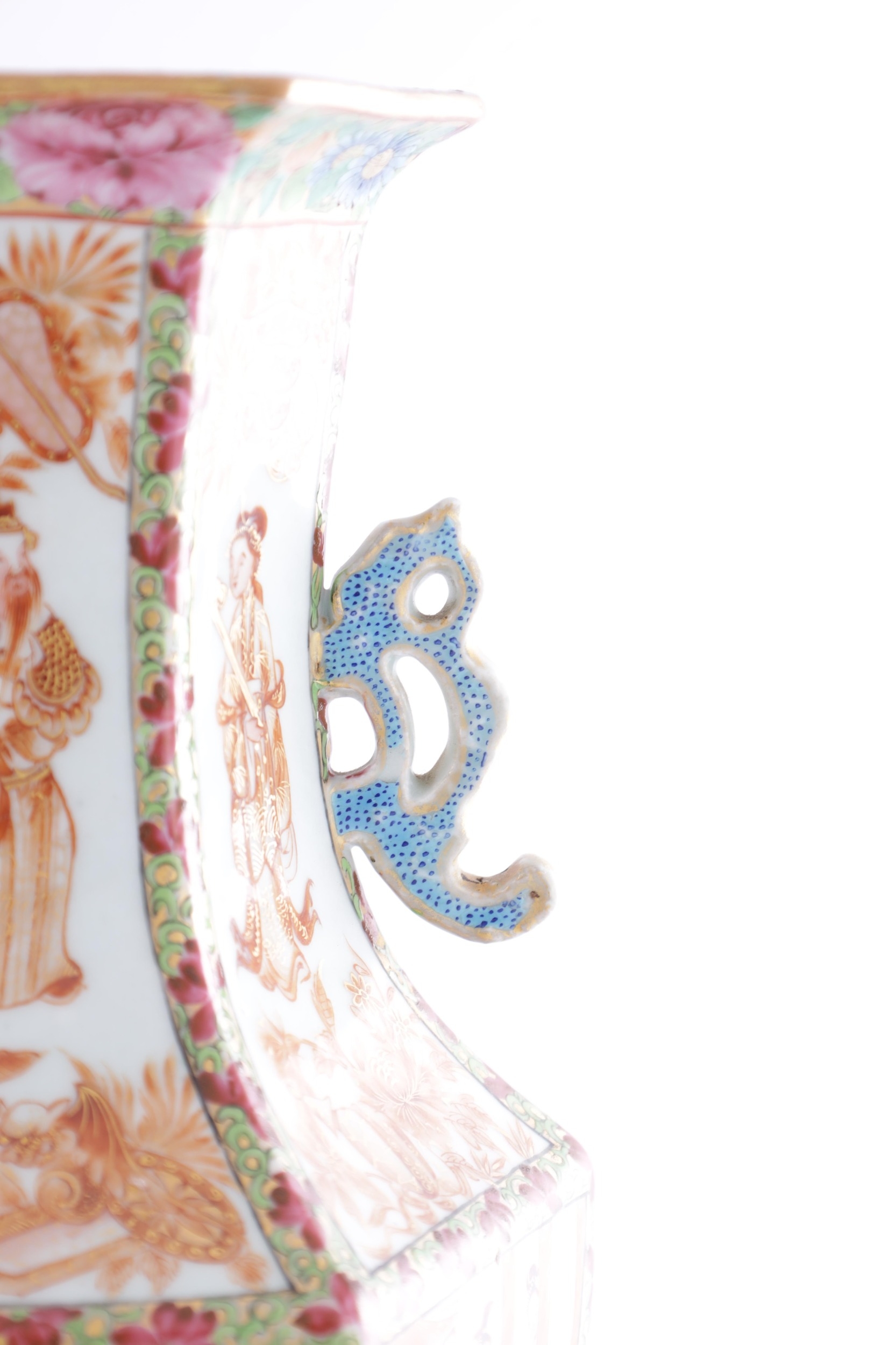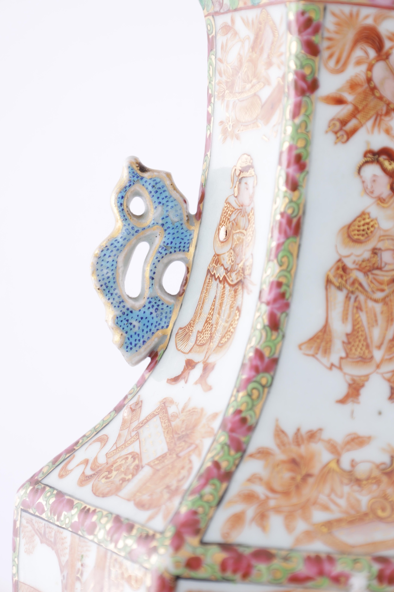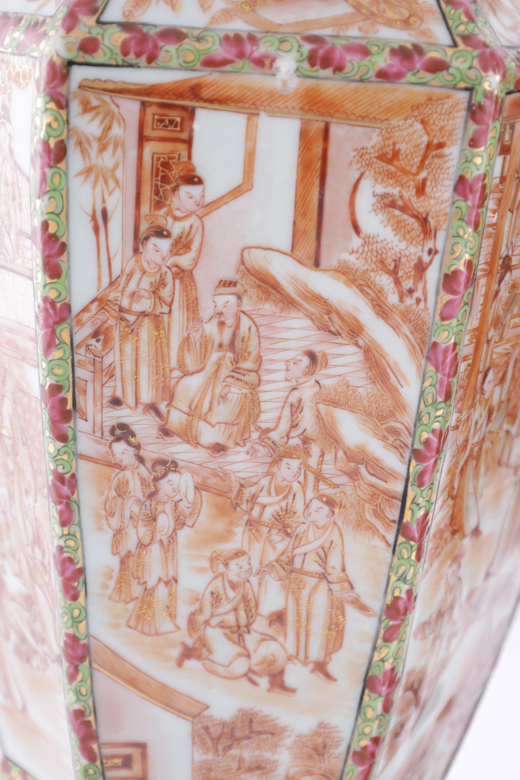 A PAIR OF 18TH CENTURY CANTONESE CHINESE VASES of hexagonal form with shaped side handles, decorated with figural garden scenes - on ebonised wooden bases (44cm high )